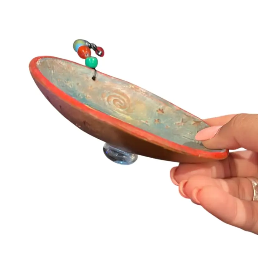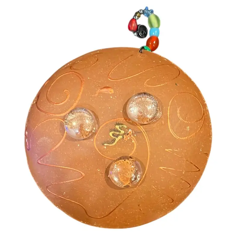 this pottery piece is too good to be true. Bummer that I can’t find out who made it. No chips or cracks. The hanger is beaded. 4.75 inches in diameter.