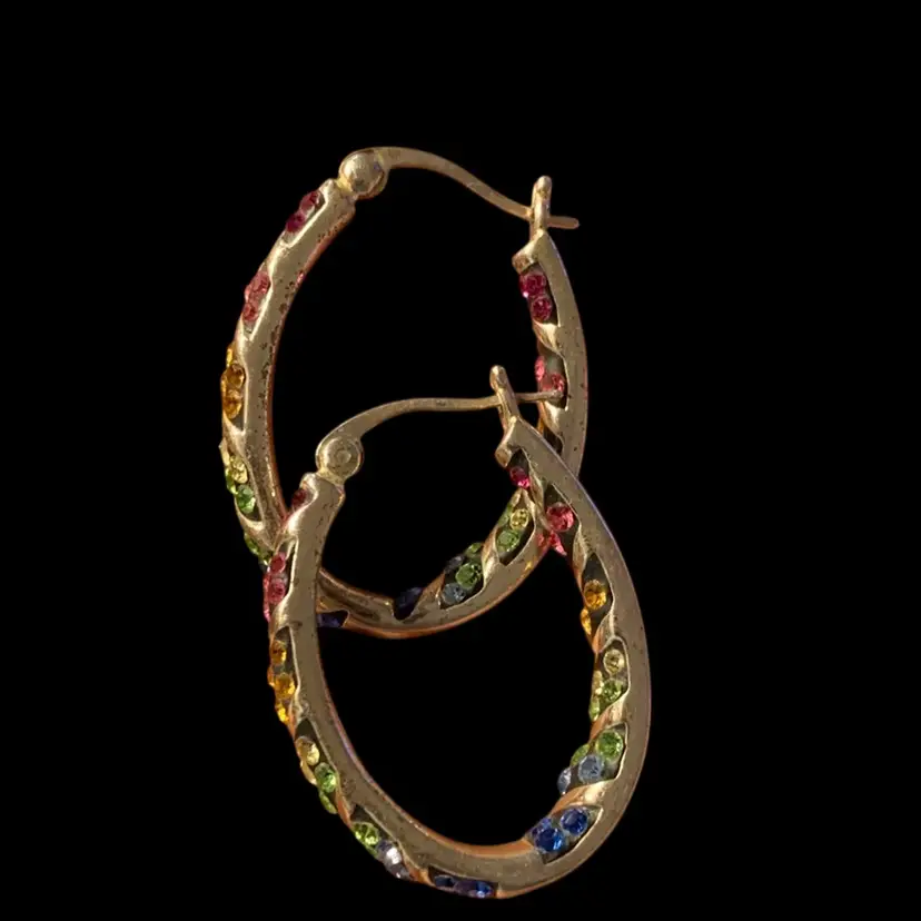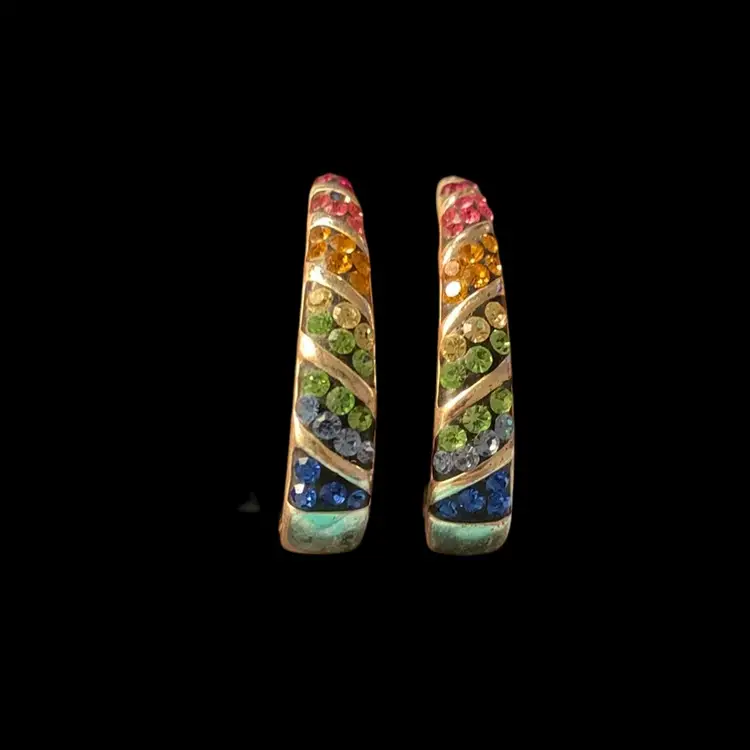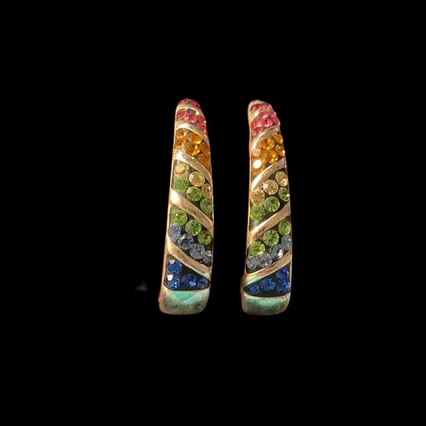 Oval Silver Tone Rainbow Crystals Pierced Earrings Marked JCM Brass Thailand