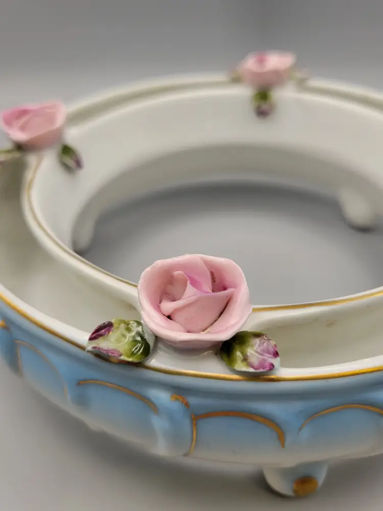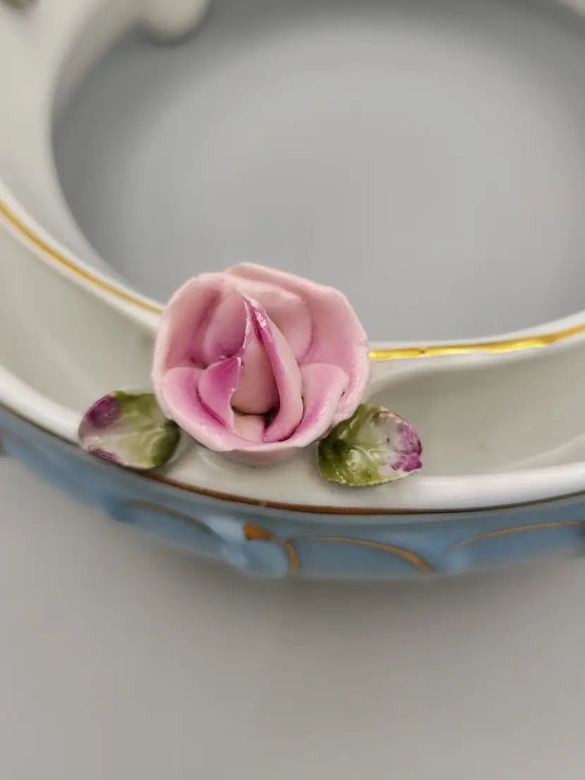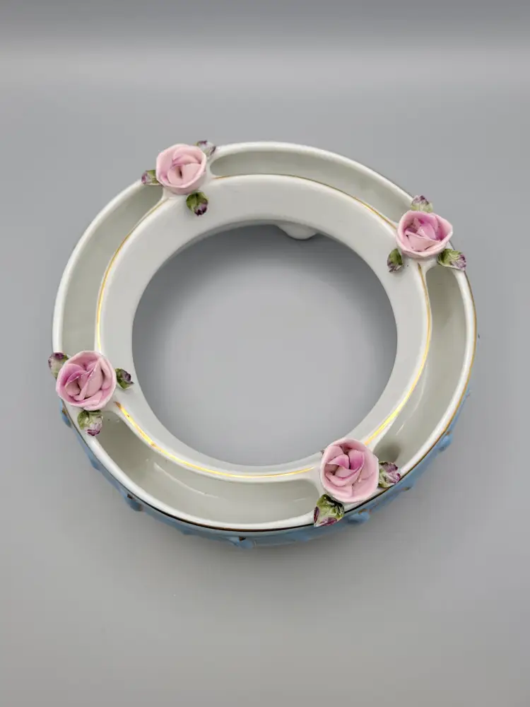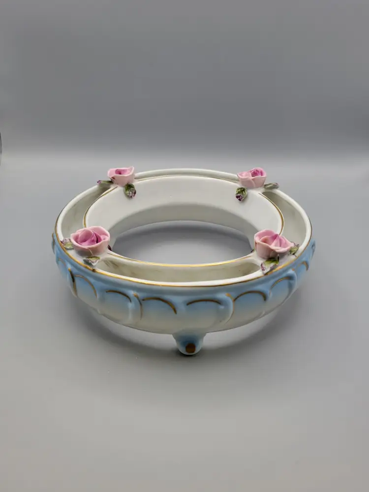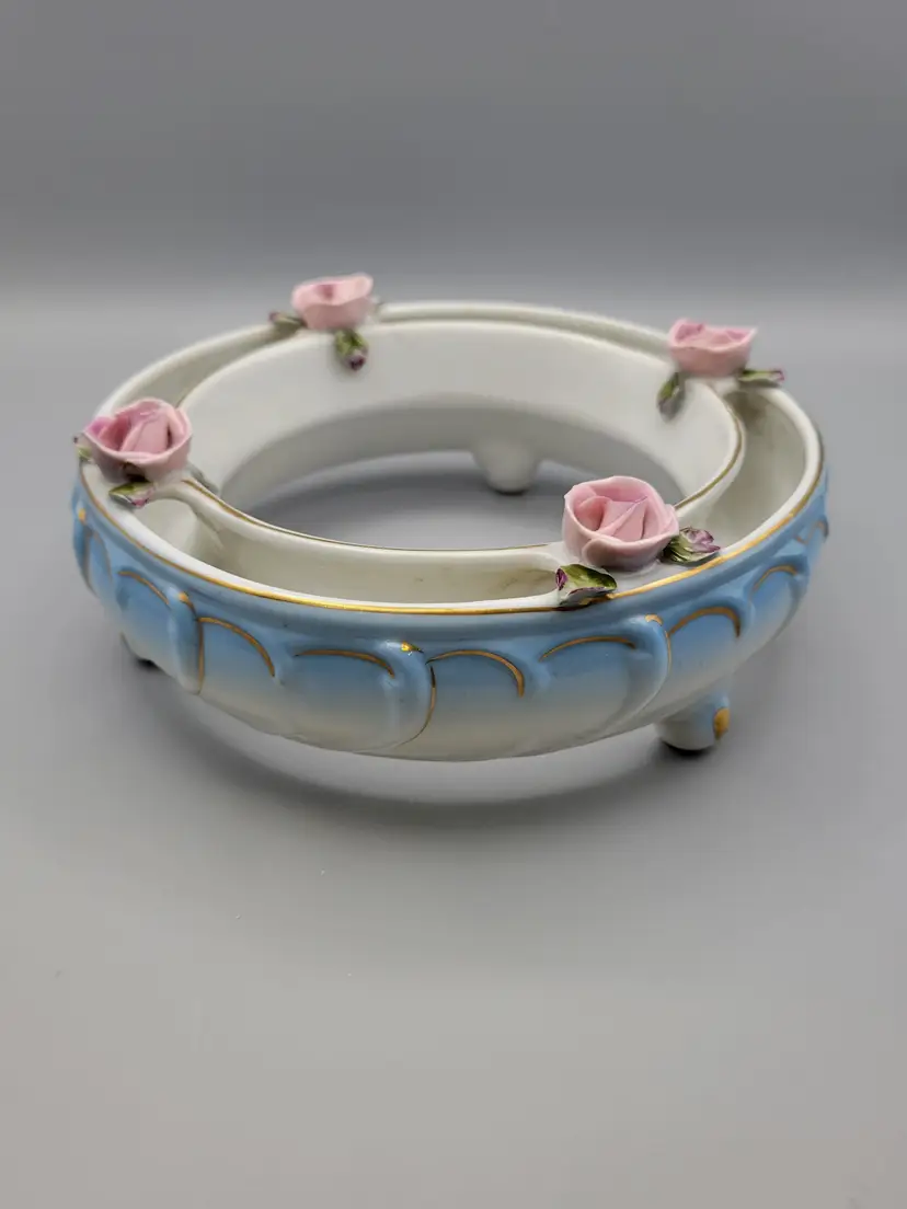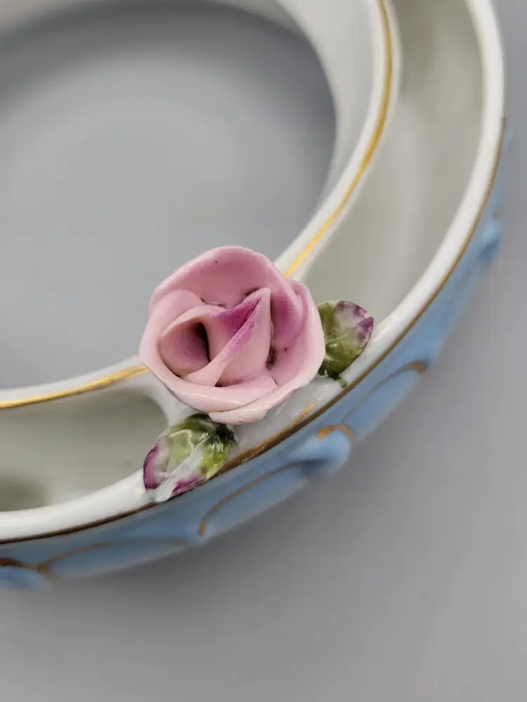 This cute little ring vase is painted light blue and gold accents with four pink roses. It is in good condition with minimal surface wear, no major cracks or chipping. I have included a close up of each of the roses to show the tiniest chipping. Measuring 6.5 inches in diameter and 2.5 inches tall (including the roses). Thank you for looking and have a great day!