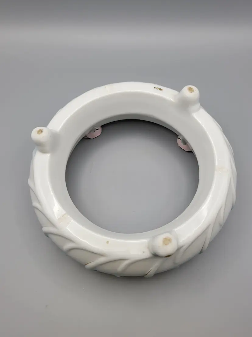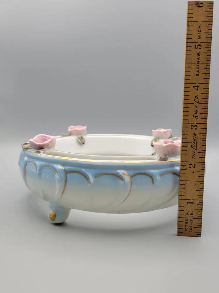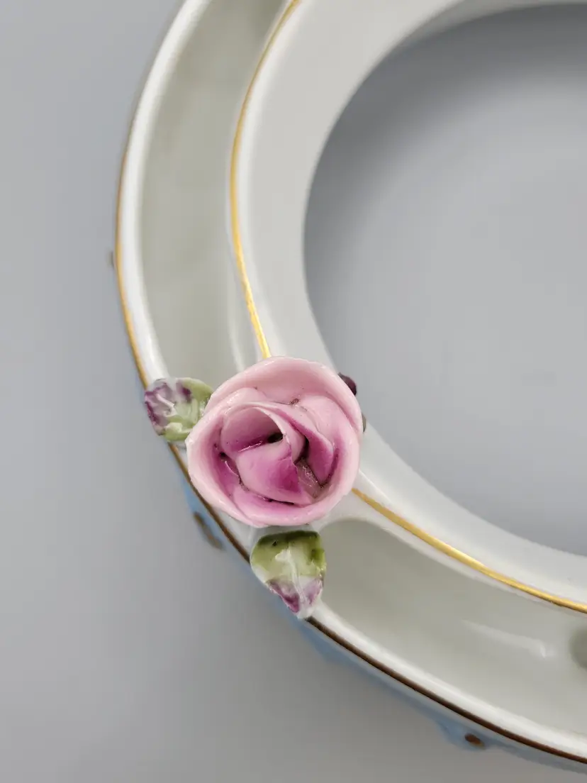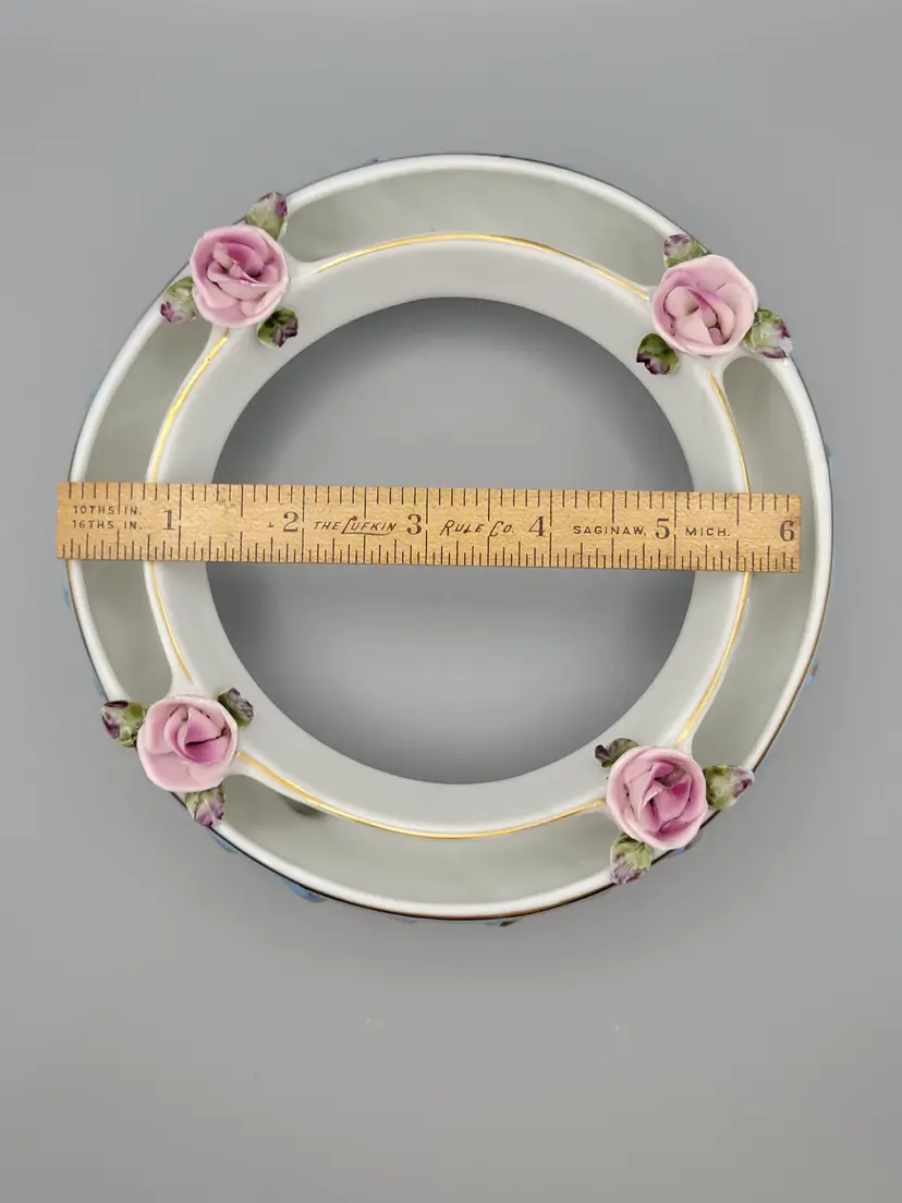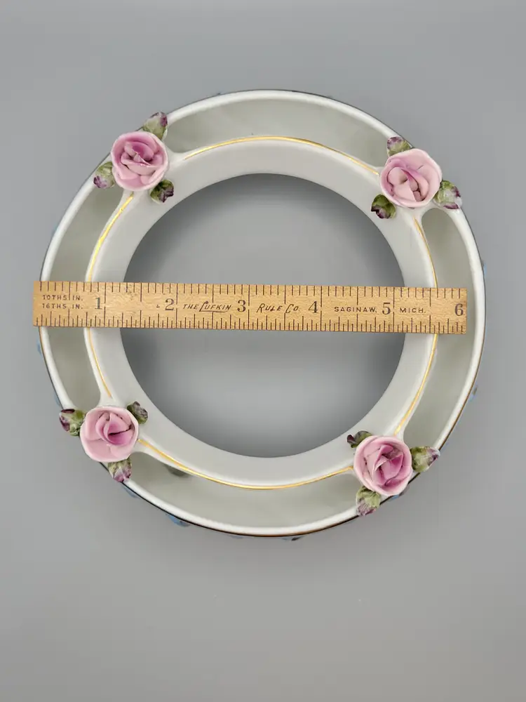 This cute little ring vase is painted light blue and gold accents with four pink roses. It is in good condition with minimal surface wear, no major cracks or chipping. I have included a close up of each of the roses to show the tiniest chipping. Measuring 6.5 inches in diameter and 2.5 inches tall (including the roses). Thank you for looking and have a great day!