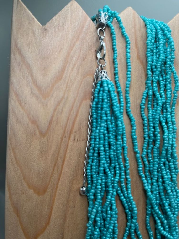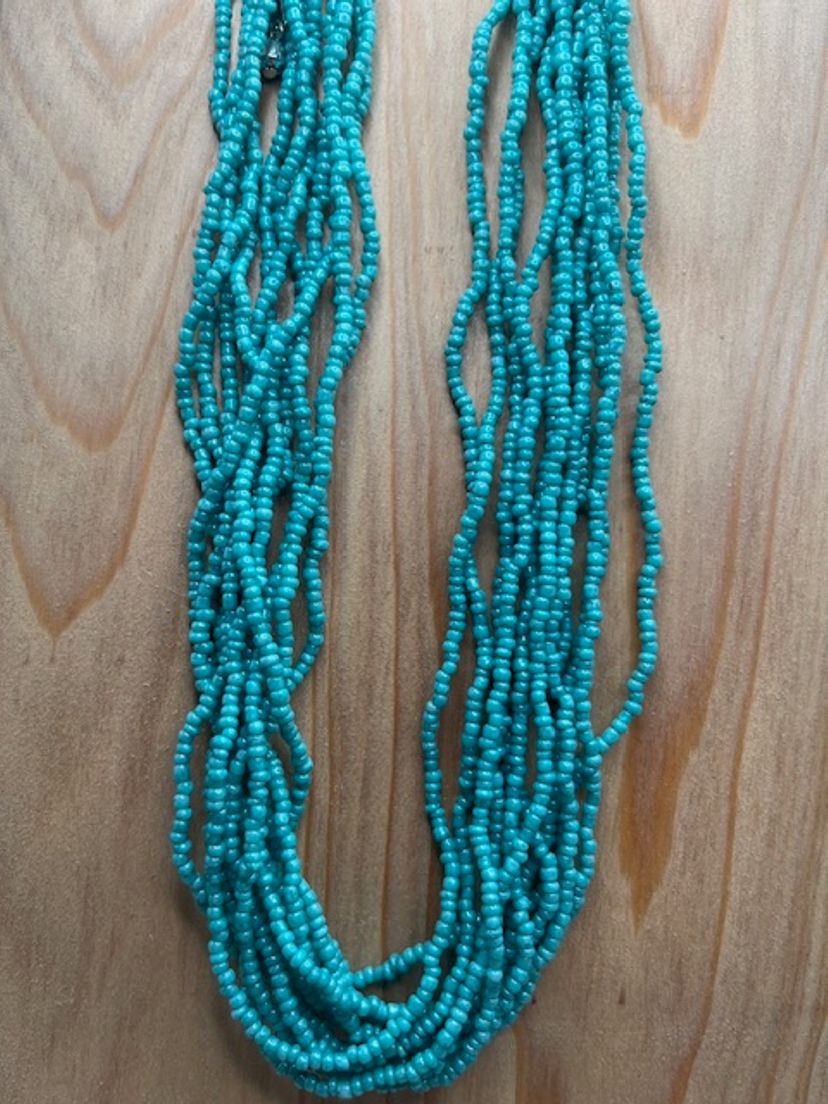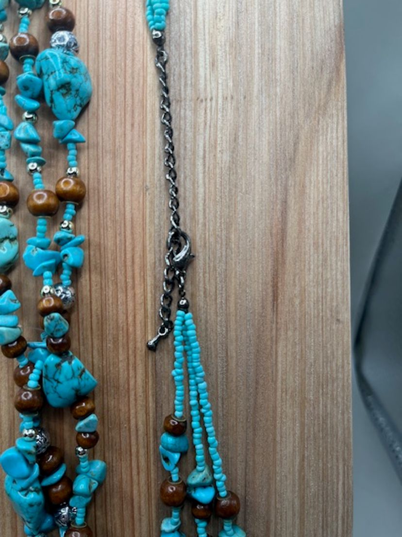 Both necklaces measure 16 inches. Can be longer using extenders (included). They are made up of turquoise seed beads, wooden beads and synthetic turquoise stones.