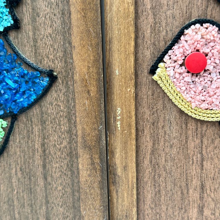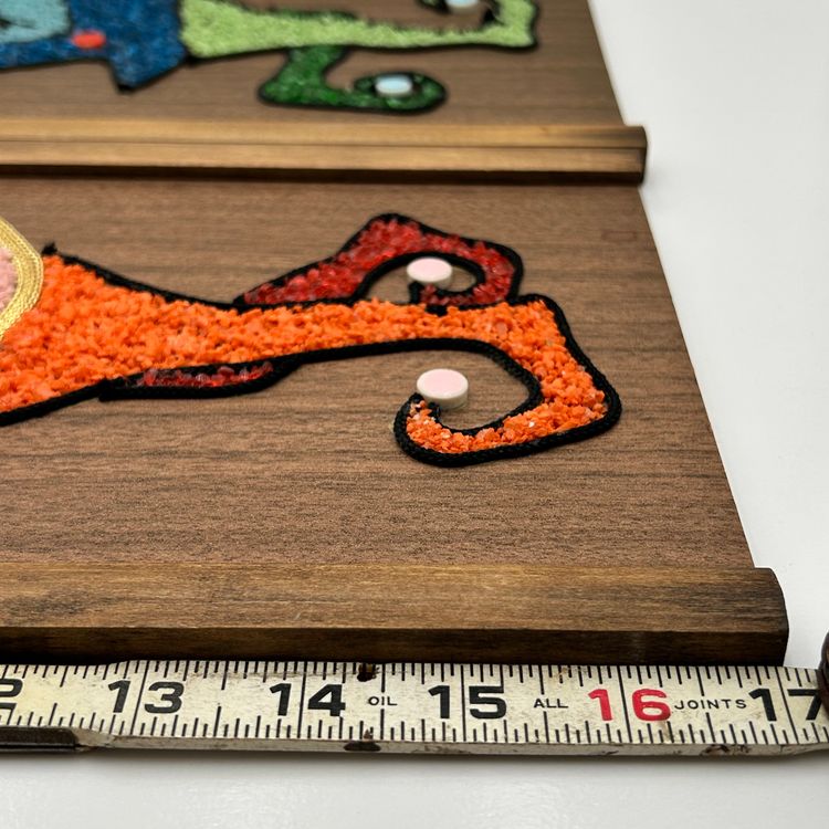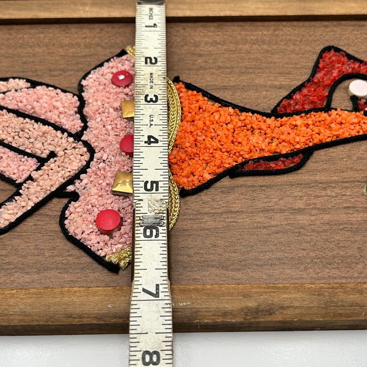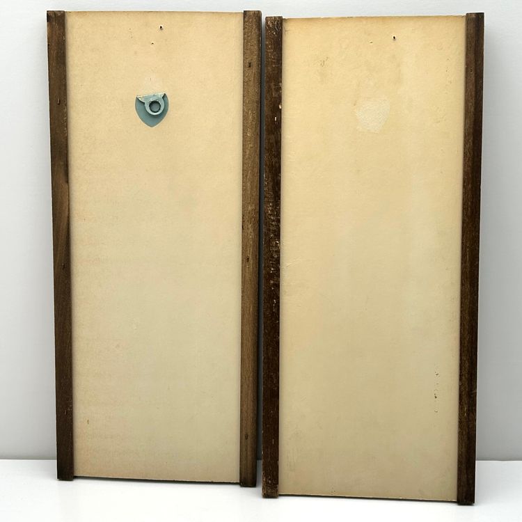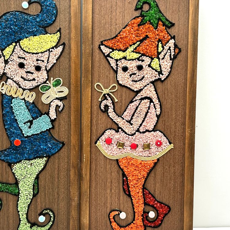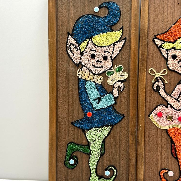 This pair are just too darn cute and so darn mid century. The set has two pixie friends done with pebbles on wood. It is perfect wall art for those who love both the mid century vibes and the kitsch. The pieces are 17 inches long and 7 inches wide. Both are in great condition with most of their pebbles. There are some scuffs to the wood frame and one is missing a hanger on the back. No chips or cracks.
