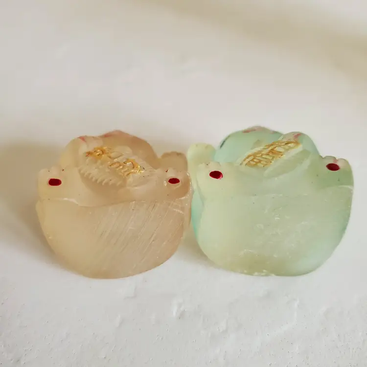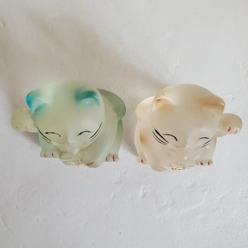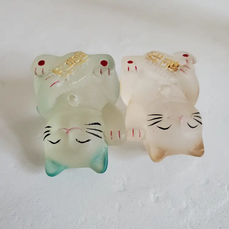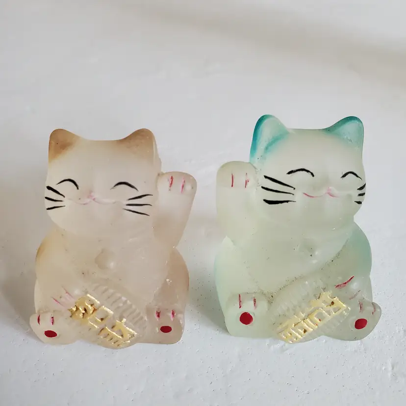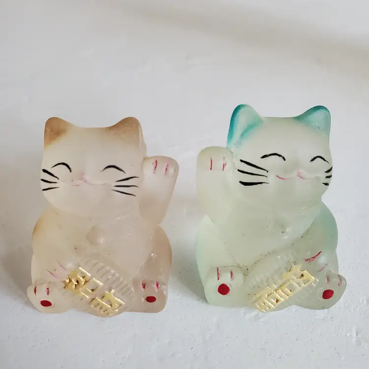 Set of two translucent Lucky Cat figurines. In good condition with some light scuffing on the backsides. Approximately ~1.25"W x 1.6"H
