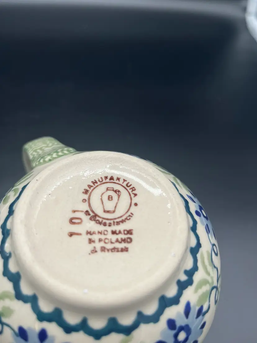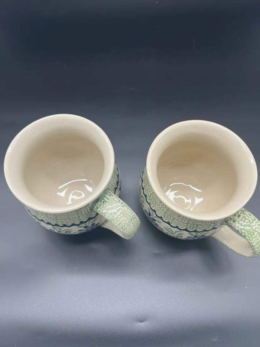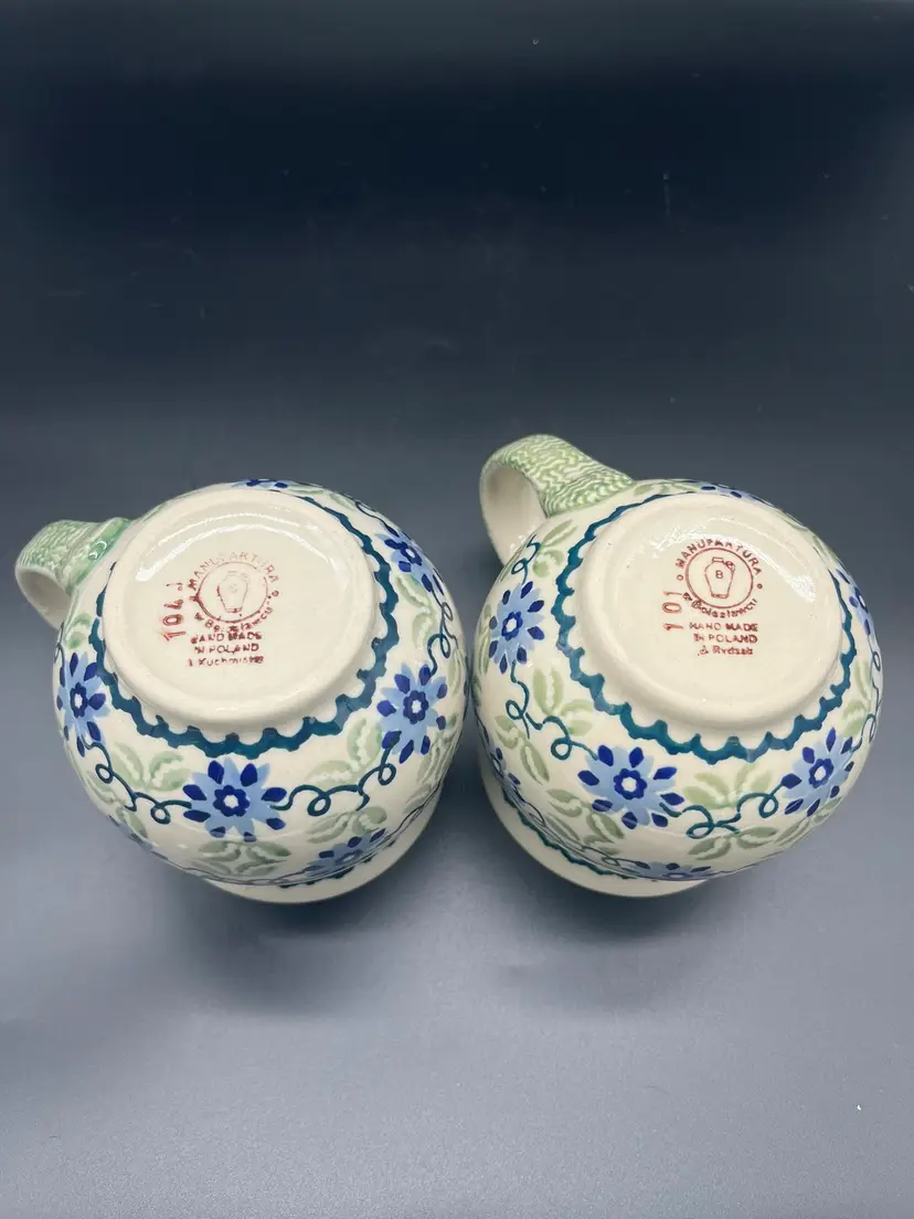 Celebrate the charm of Polish craftsmanship with this pair of vintage ceramic mugs featuring hand-painted blue florals and green bands. Traditional Boleslawiec pottery showcasing artisan details with leafy handles and a soft glaze finish. Perfect for cozy mornings or display, offering both function and folk-art flair. Good condition with no chips or cracks - ready to enjoy or gift. Shipping included. Handmade in Poland and numbered. 4 1/2" tall, about 5 1/2" wide including handle.