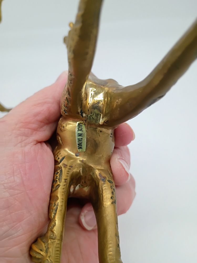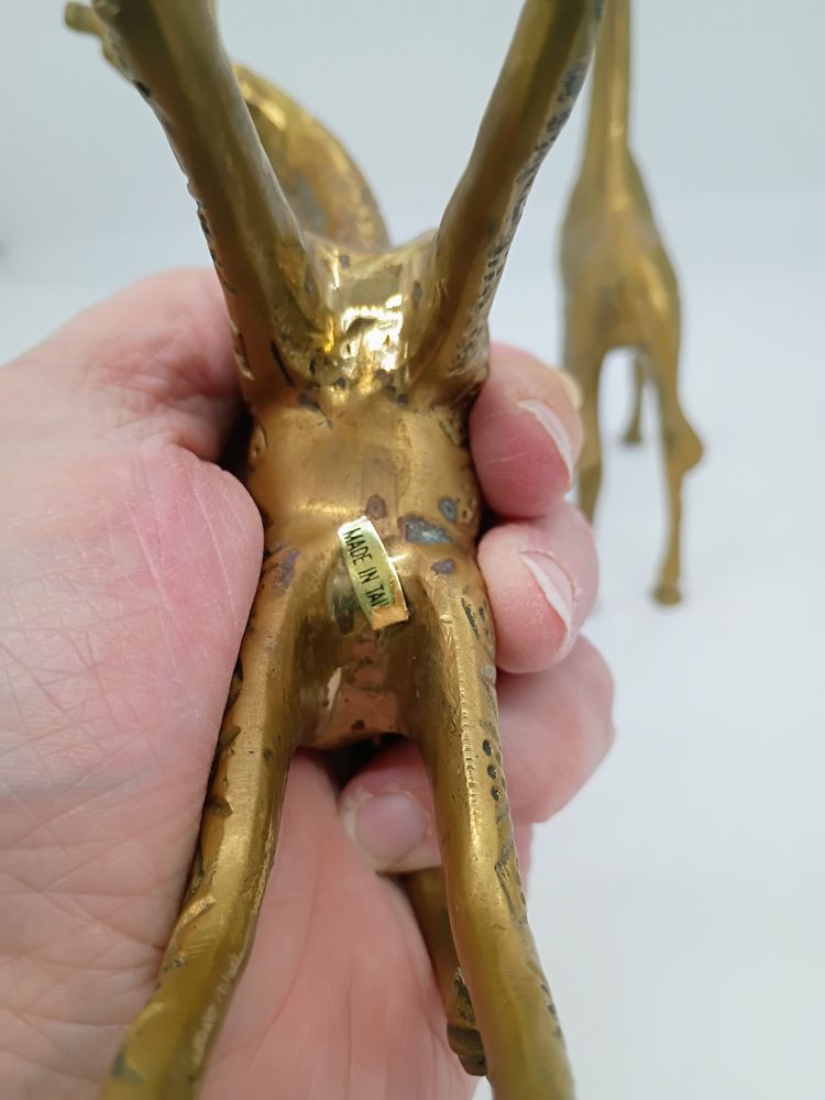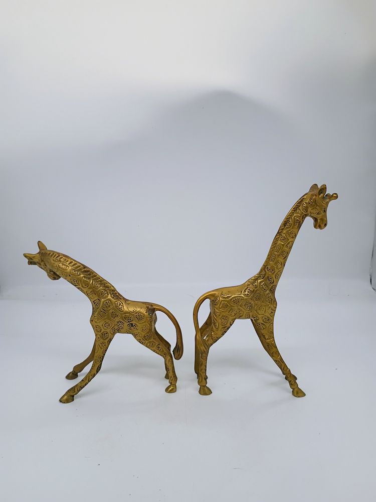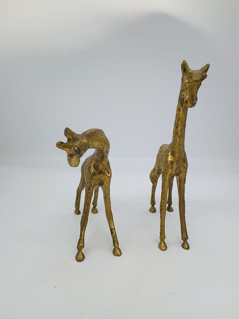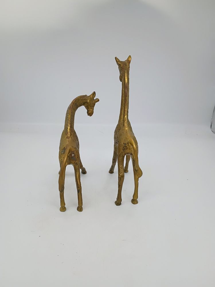 Pair of Vintage Brass Giraffe Figurines Textured Brass Freestanding MCM Figurines. The upright Giraffe is just below 9 inches in height 5 inches long and about 2 inches wide, The giraffe with the bent neck is 6 inches long 6.5 inches tall and also about 2 inches wide. This is a matched pair in textured pattern. These are preowned . No dents, dings or fractures. There is slight overall patina can be polished back to glossy shine. Excellent condition. Ships USPS domestically and UPS to Canada