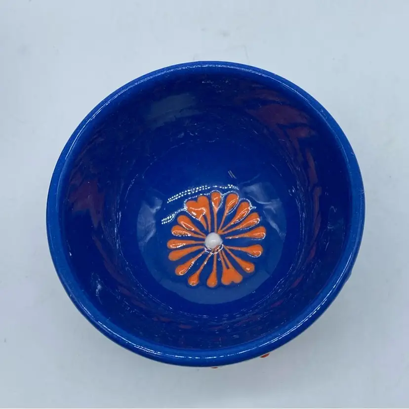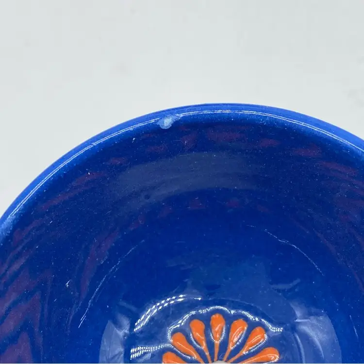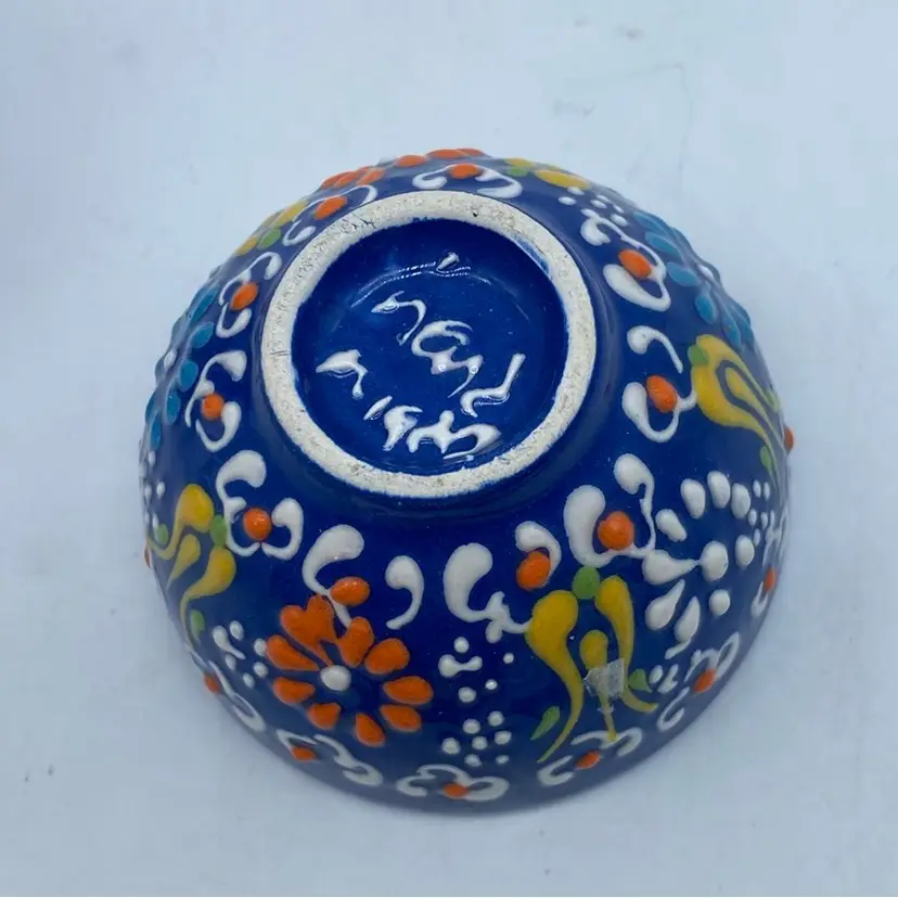 Ceramic bowls with intricate hand-painted designs have a long history across various cultures, often serving both functional and decorative purposes. Cobalt blue has been a prized color in ceramics for centuries, particularly in regions like Persia and China, where it was used to create striking glazes and patterns. The floral motifs seen here are reminiscent of traditional designs found in Middle Eastern and Mediterranean pottery.