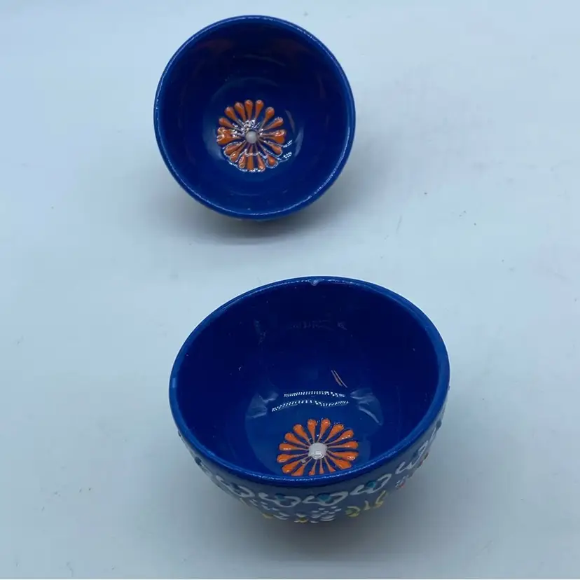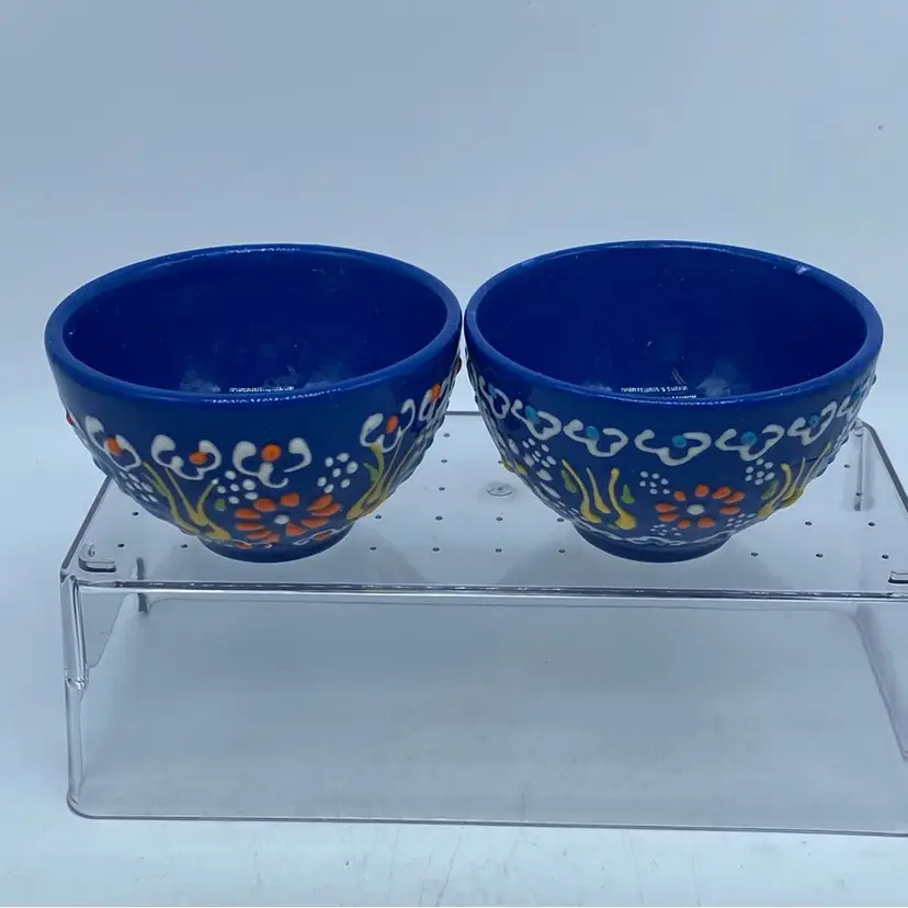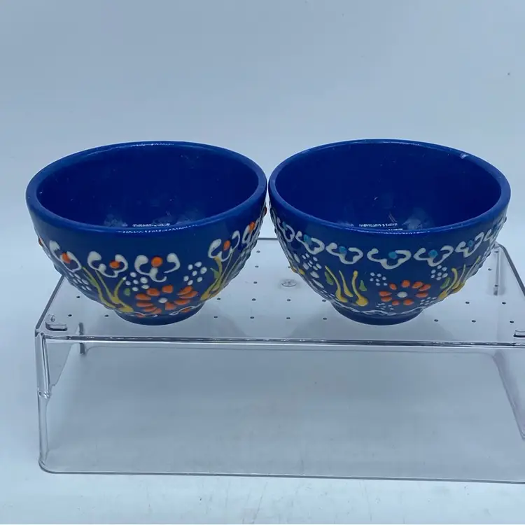 These bowls, with their vibrant cobalt blue glaze and detailed floral artwork, likely originate from a region known for its ceramic craftsmanship, such as Turkey or North Africa. Such pieces were often handmade, reflecting the artisan's skill and contributing to their unique character. They are commonly used as decorative items or for serving small portions of food, embodying a rich cultural heritage in their design and execution.
