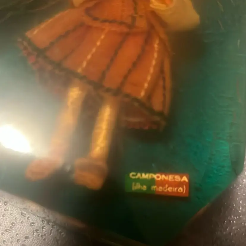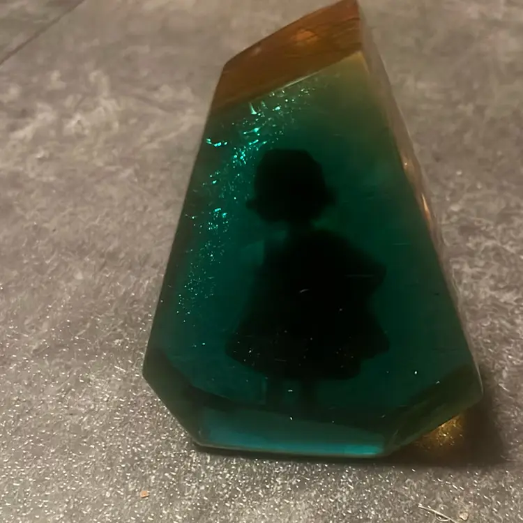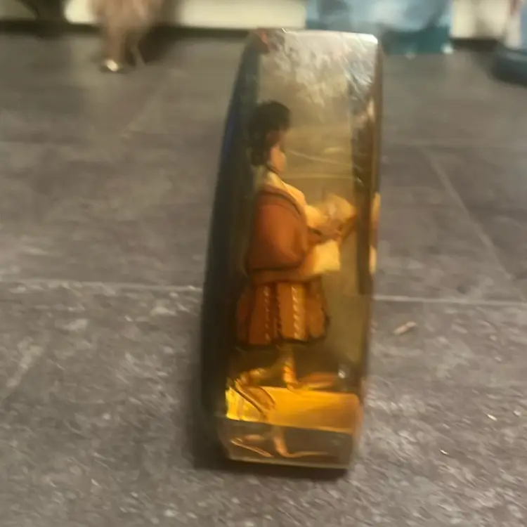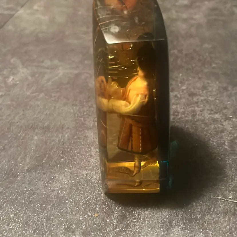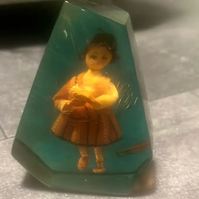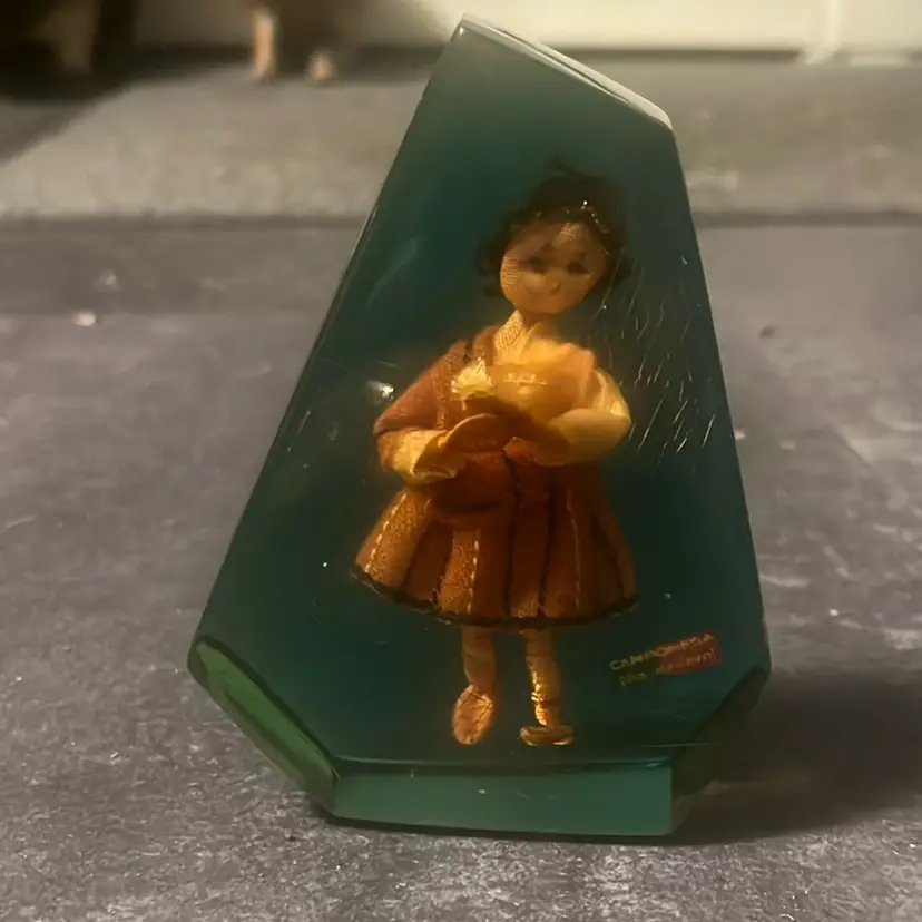 Clothed small girl doll encased in lucite paperweight. Scratched on all sides. Unique thick shape. Max 3.5 wide x 4.5 high and 1.75 thick. Sticker inside reads Camponesa ? Madeira