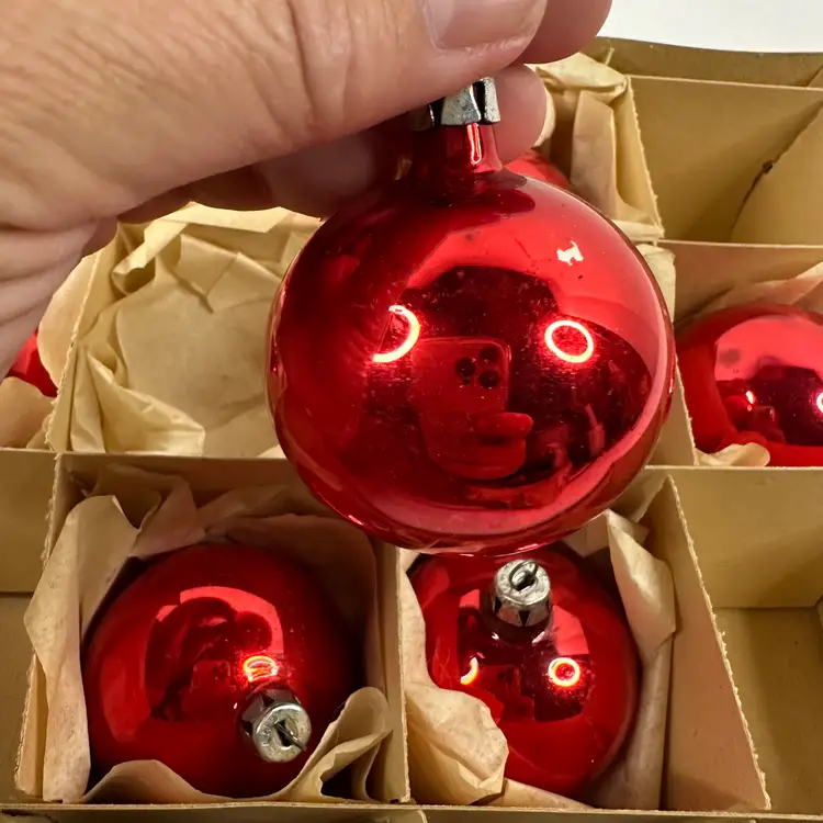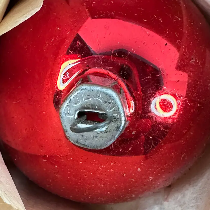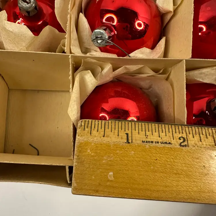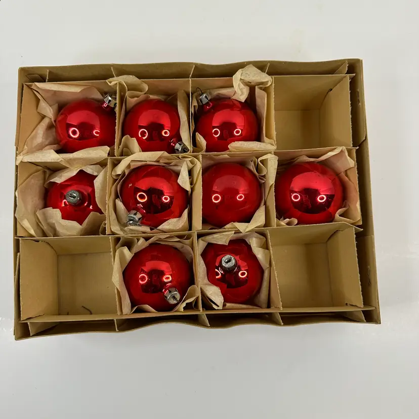 Partial Set of 9 Vintage Red Glass Christmas Tree Ornaments, Poland in good preowned condition. Each glass ball has a diameter of approximately 2 inches. Some of the tops and hooks have corroded. The finish of the ornaments is very delicate and powdery. There are small spots of missing color . Please see photos for all the details.