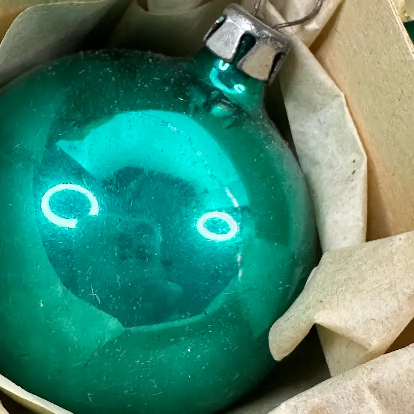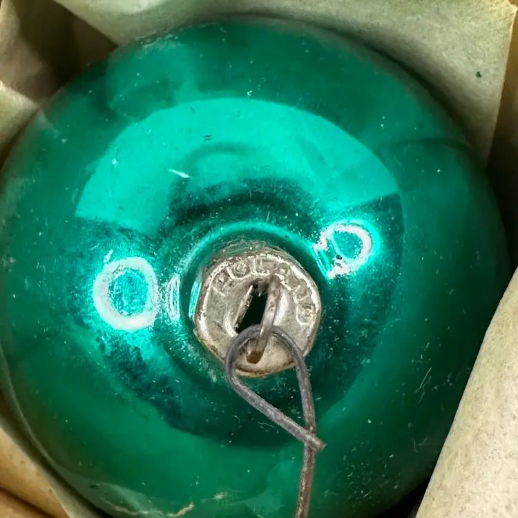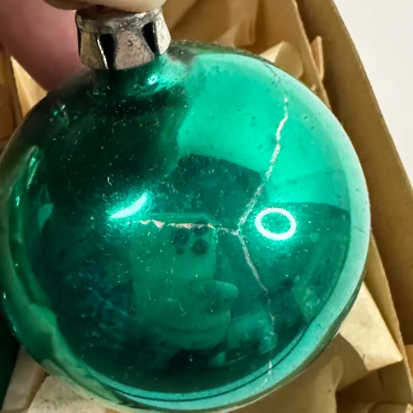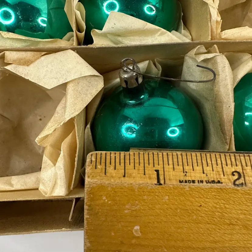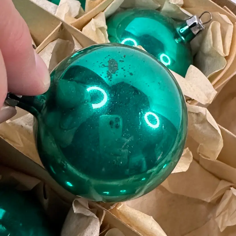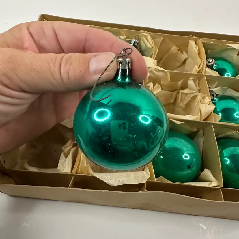 Partial Set of 9 Vintage Teal Green Glass Christmas Tree Ornaments, Poland in fair preowned condition. Each glass ball has a diameter of approximately 2 inches. Some of the tops and hooks have corroded. The finish of the ornaments is very delicate and powdery. There are spots of missing color and one ornament appears cracked. Please see photos for all the details.