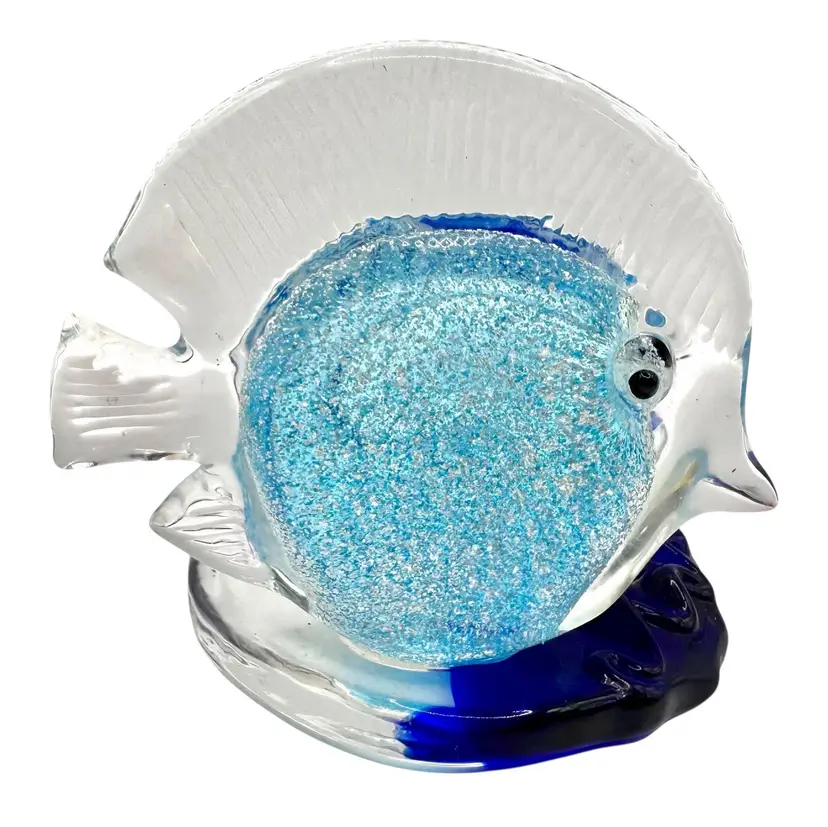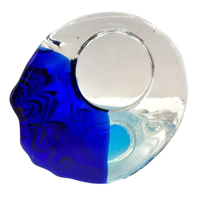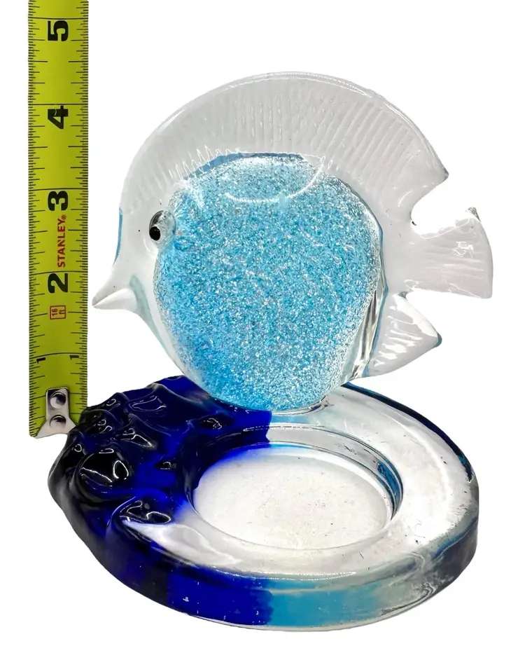 Candle holder shaped like an angelfish. It is blue with silver flecks inside.