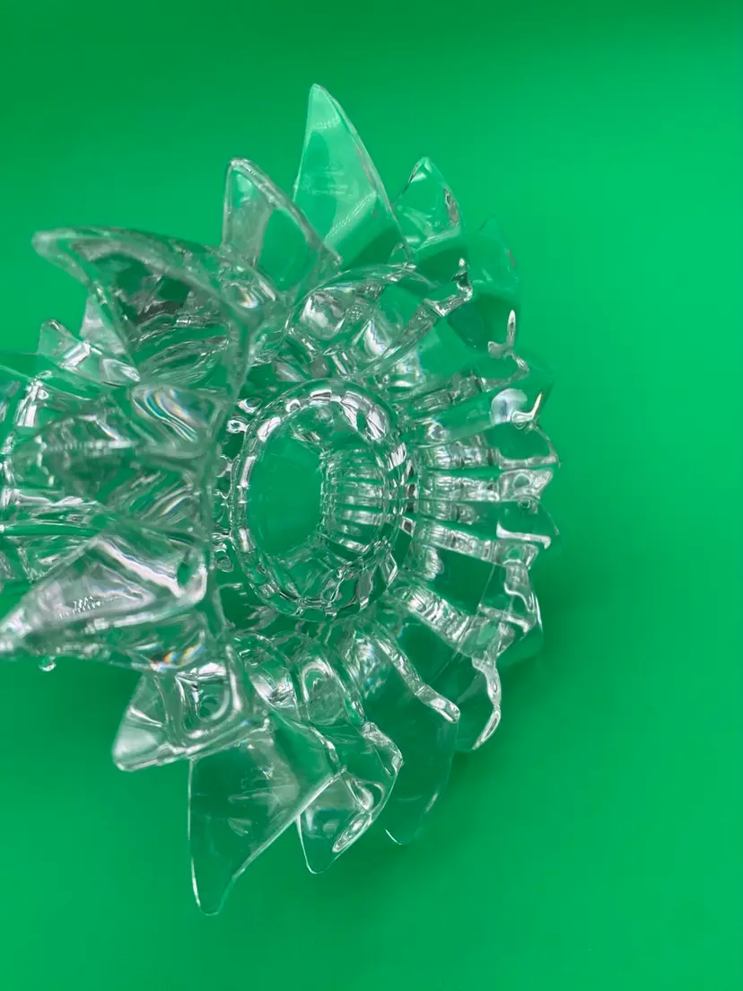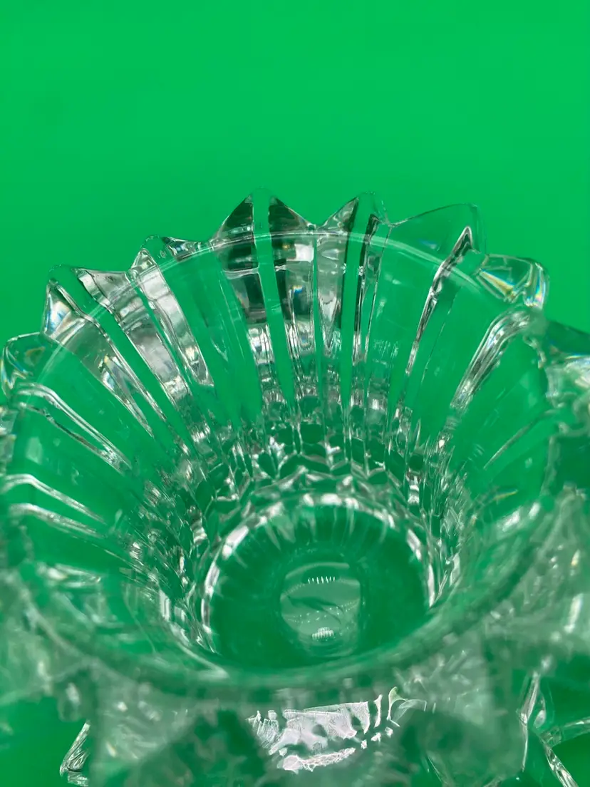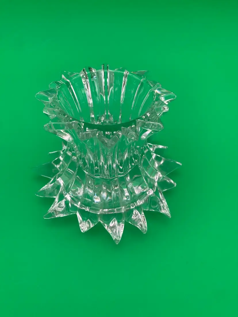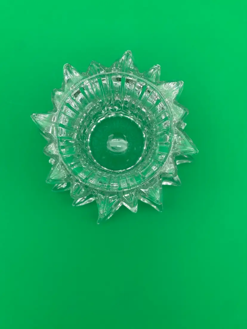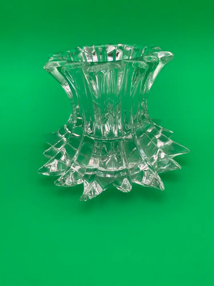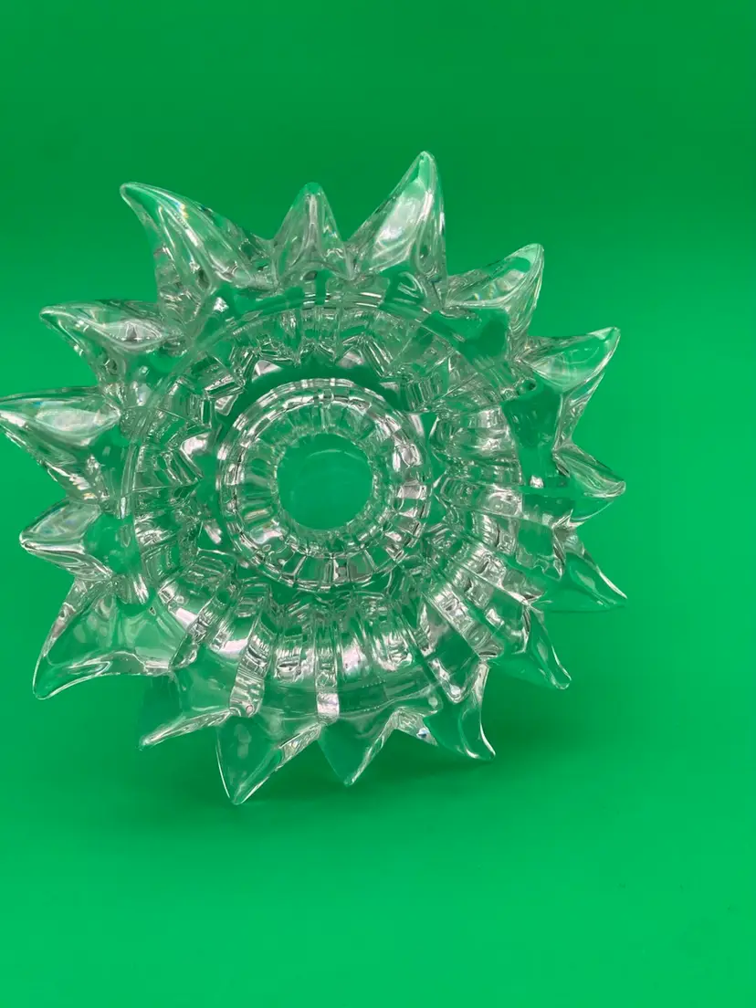 You are purchasing one Clear Crystal Aurora Starburst Pattern Reversible Candle Votive or Pillar Candle Stand by PartyLite. This Item is around 3.75 inches tall and up to 5.5 inches wide. This Piece is in excellent condition with no chips, cracks, scratches or stains.