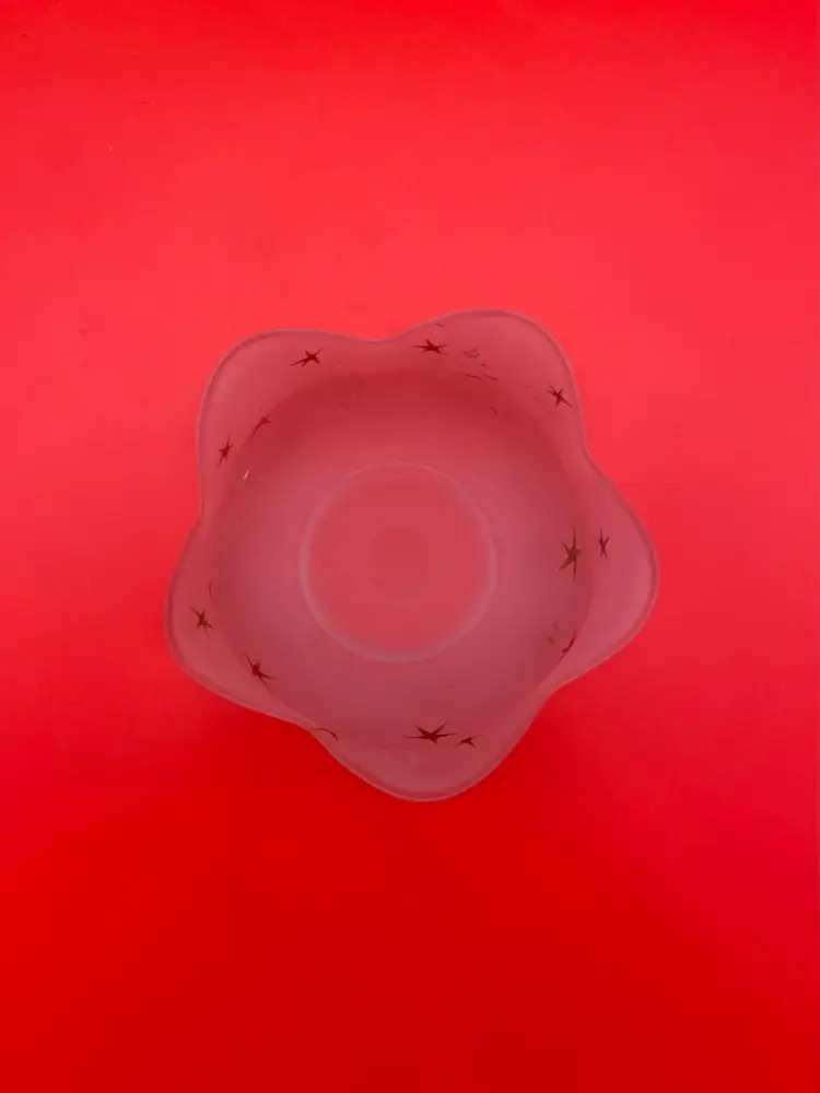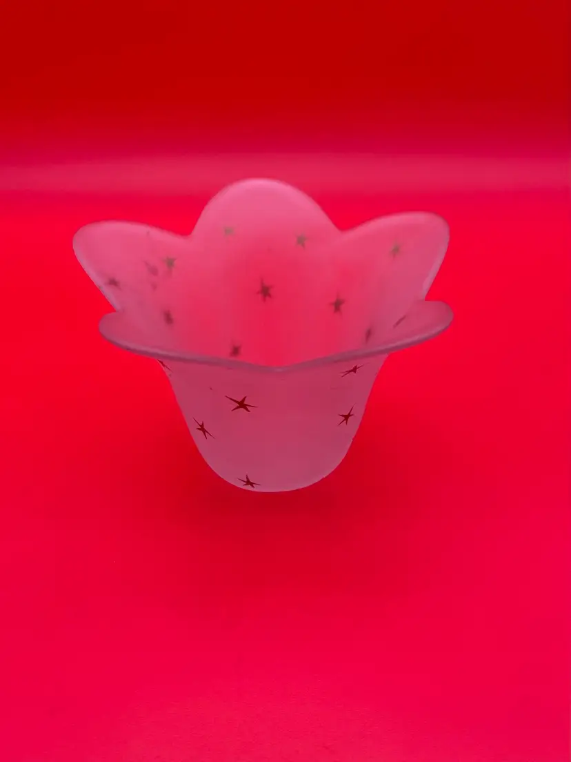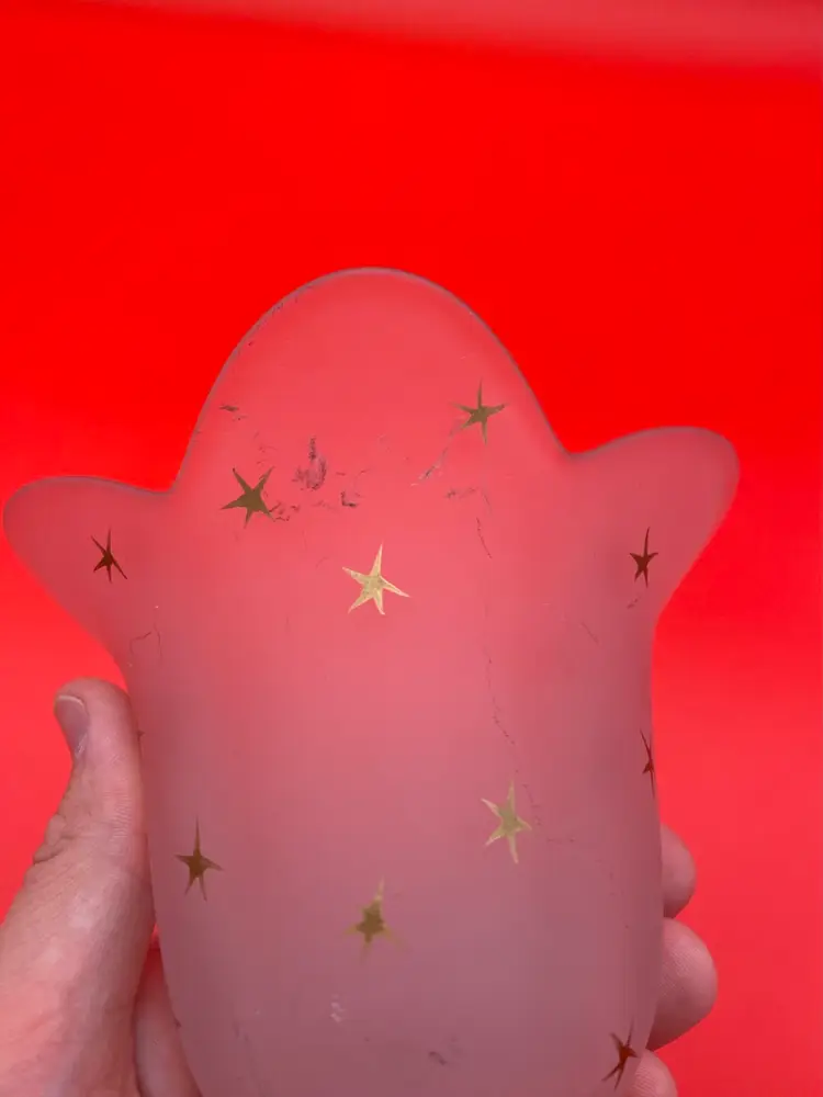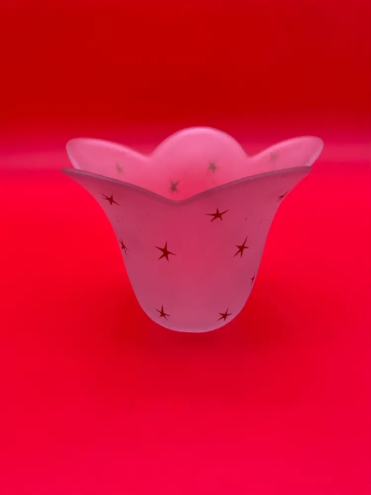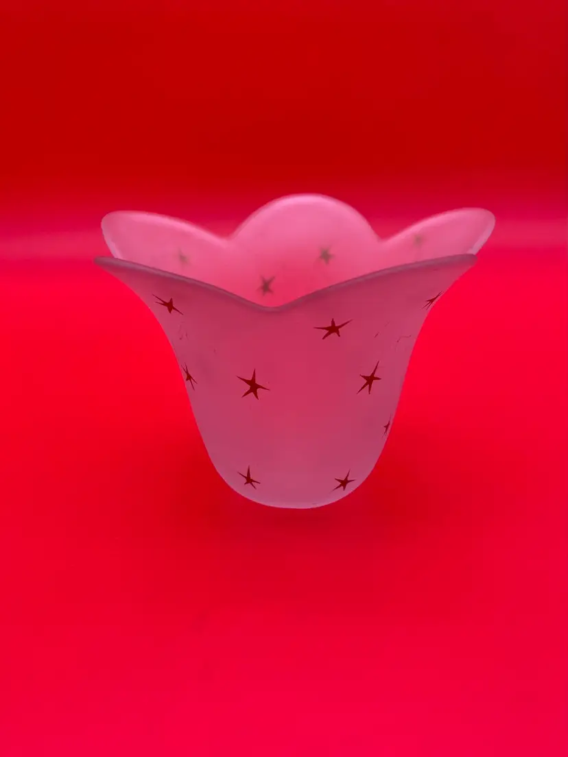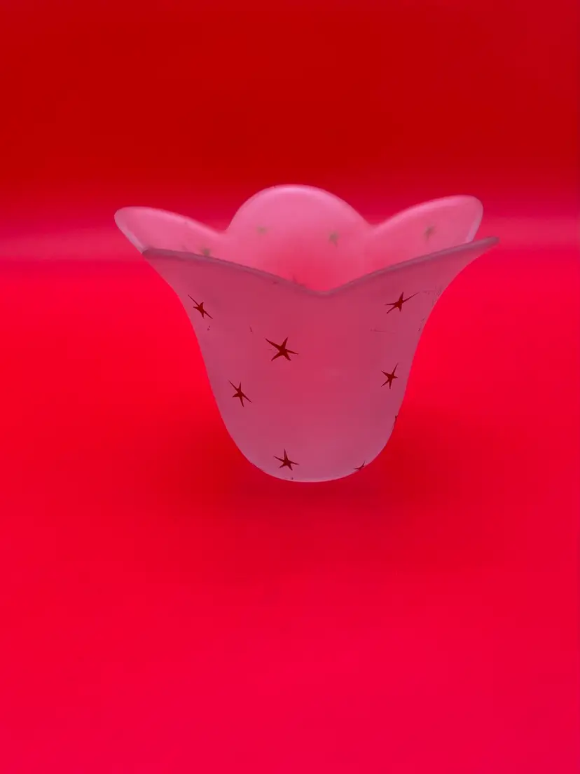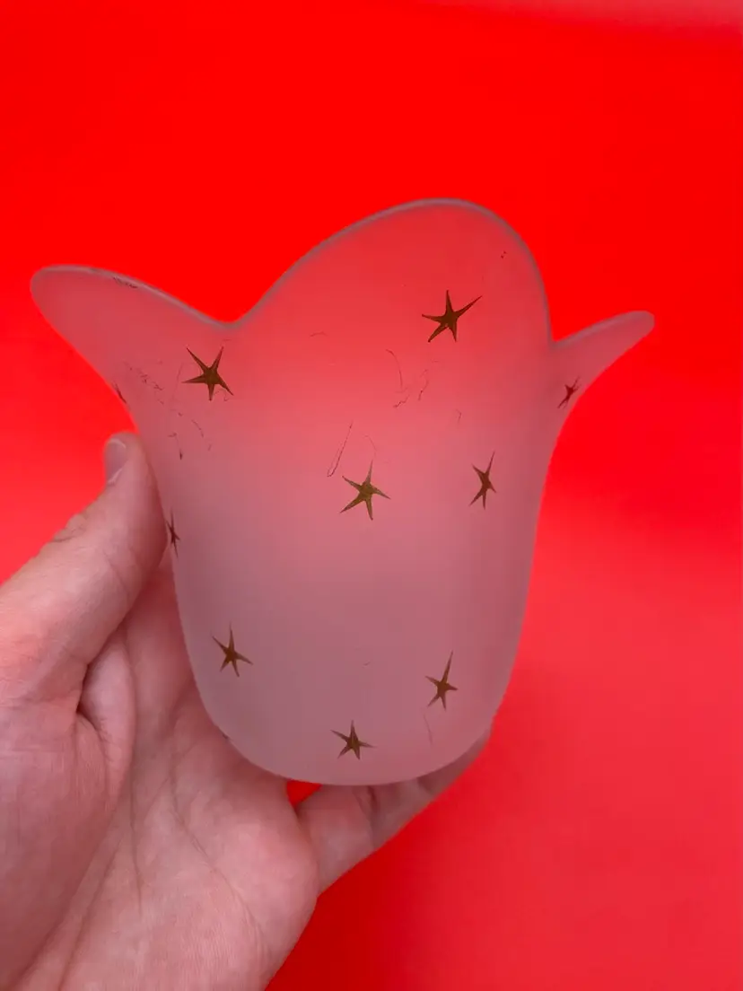 You are purchasing one Frosted Glass w/ Gold Star Pattern Stellar Blossom Candle Holder #P0452 by PartyLite. This Votive is around 4 inches tall and up to 5.5 inches wide at the top. This Votive is in good condition in terms or no chips or cracks, just see final images for markings on the exterior. Could possibly be cleaned.