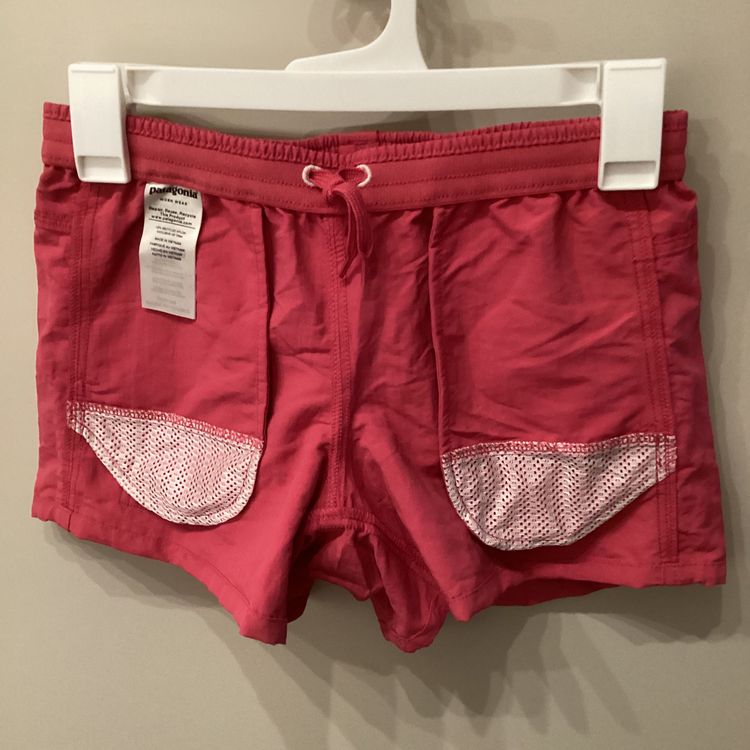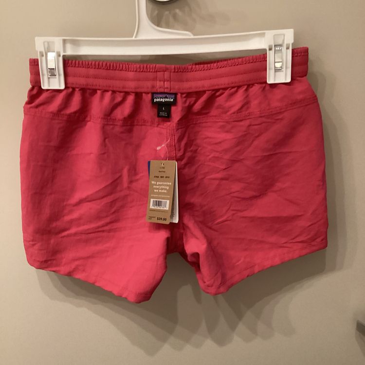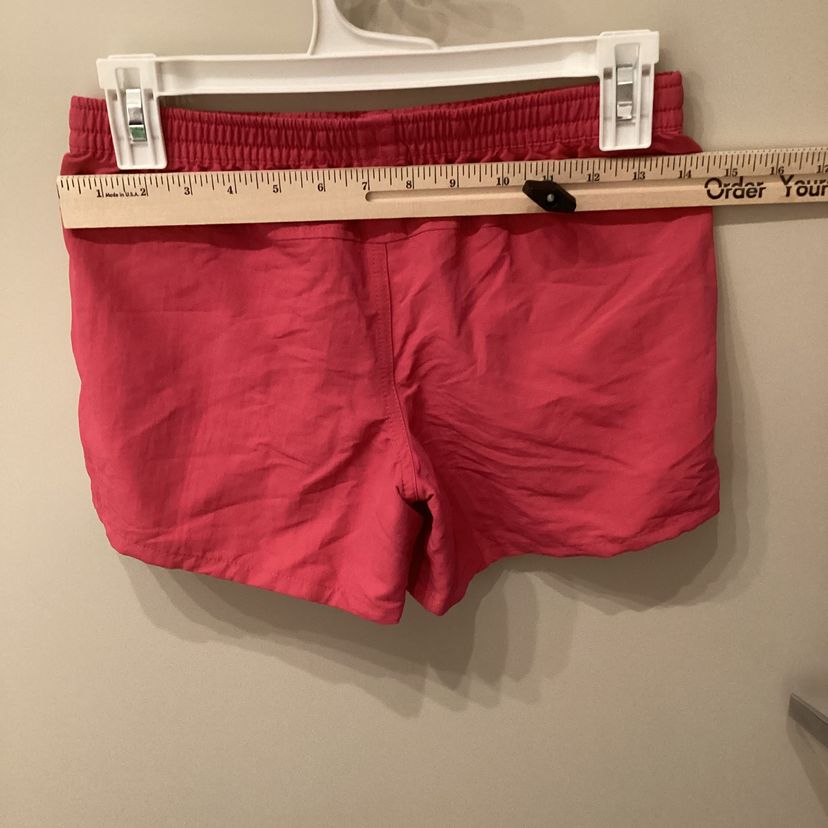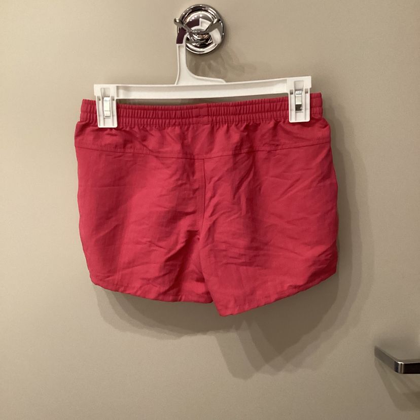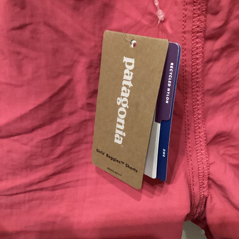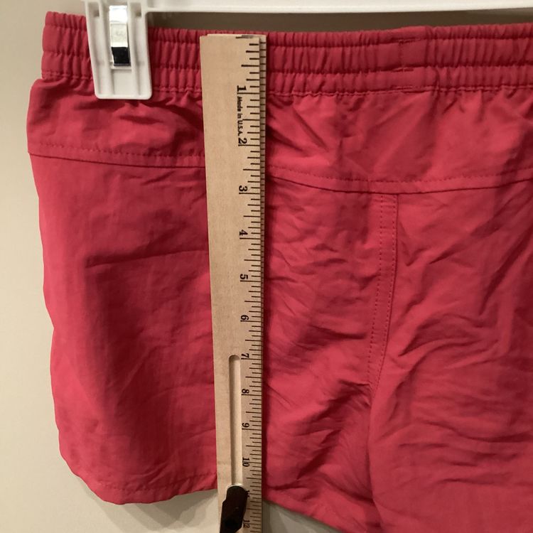 The product is a pair of girls' large size 12 pink coral Baggies shorts from Patagonia with a 4" inseam. These unlined shorts feature a solid pattern, drawstring closure, and are made of nylon material. Perfect for travel, activewear, or casual occasions, these shorts are ideal for outdoor activities like beach trips, water sports, soccer, CrossFit, hiking, and running or jogging. With a regular fit and flat front design, these Baggies shorts combine style and functionality for young girls on the go.