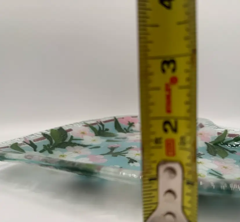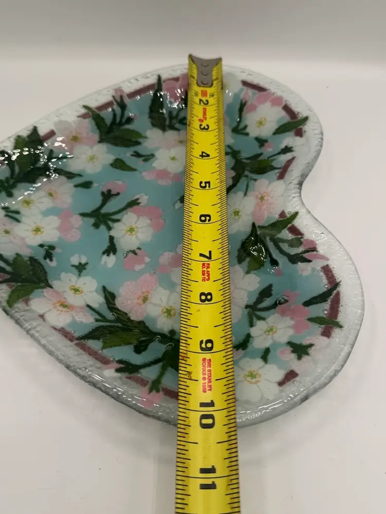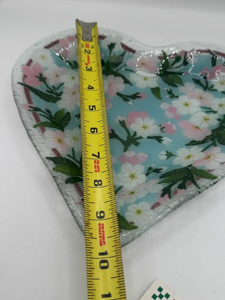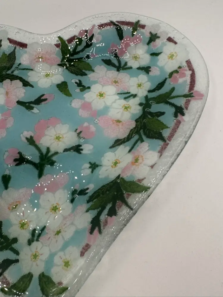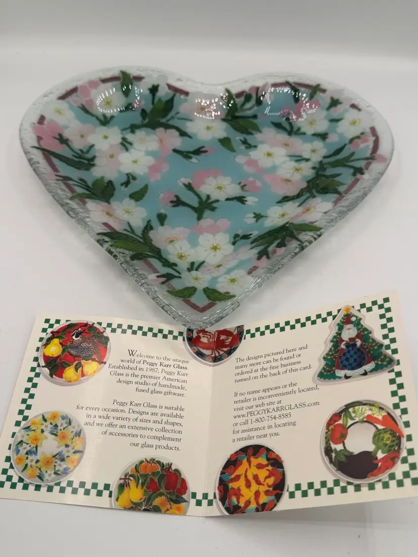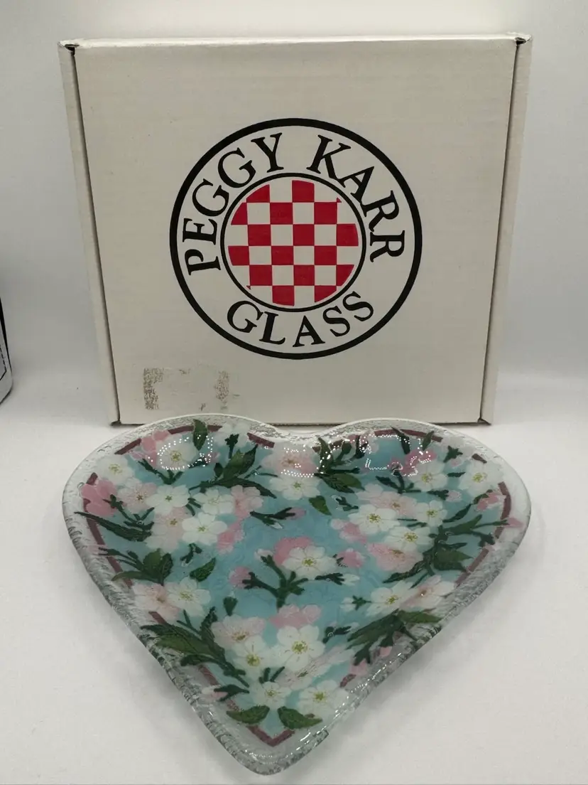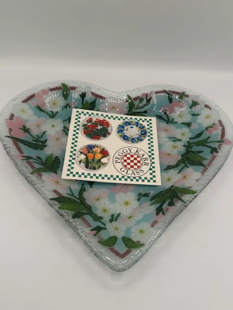 Peggy Karr Fused Art Glass Heart-Shaped Dish With Cherry Blossom Design - Signed