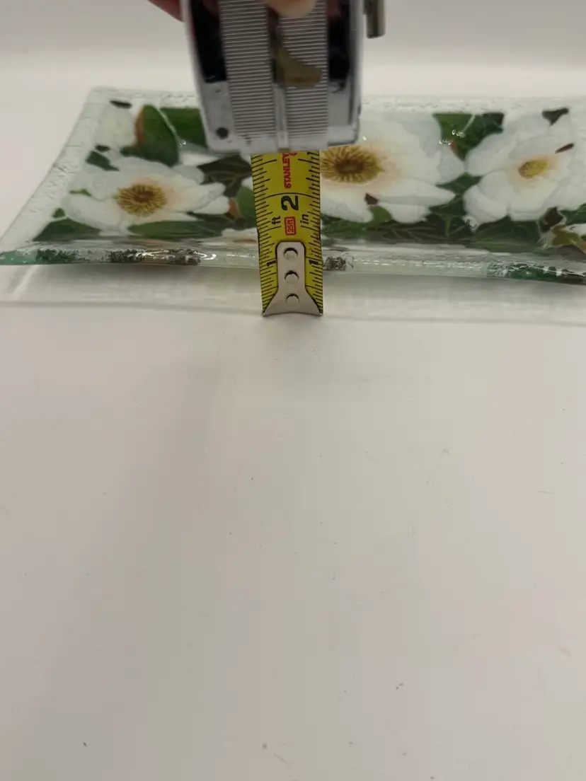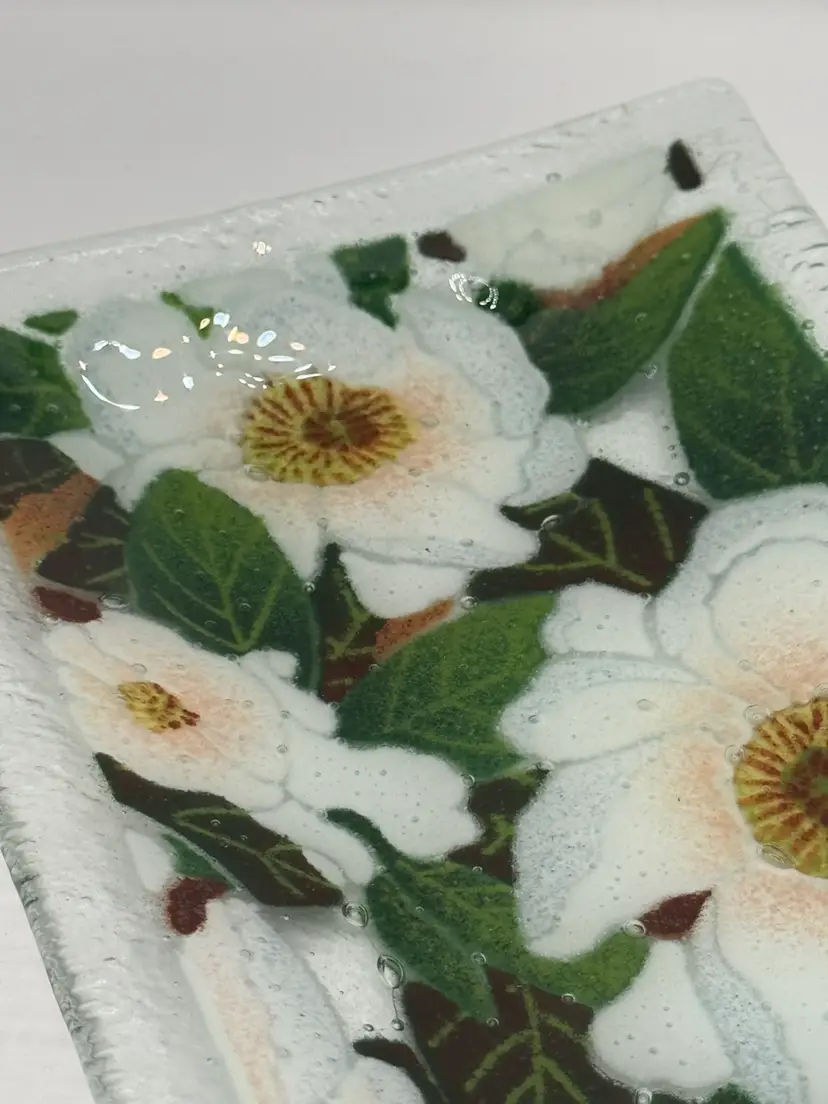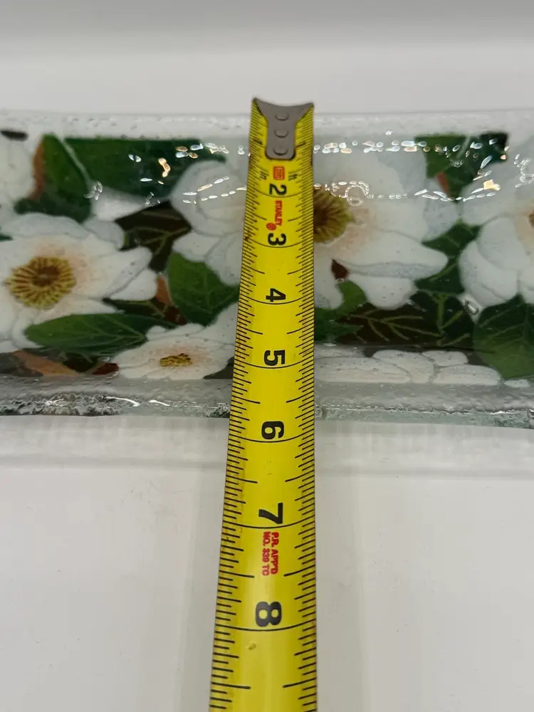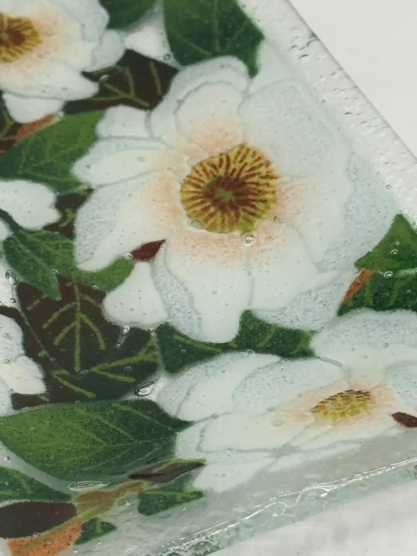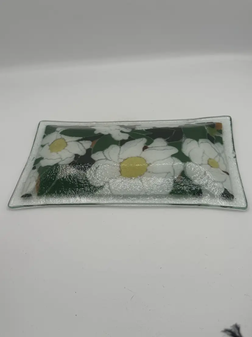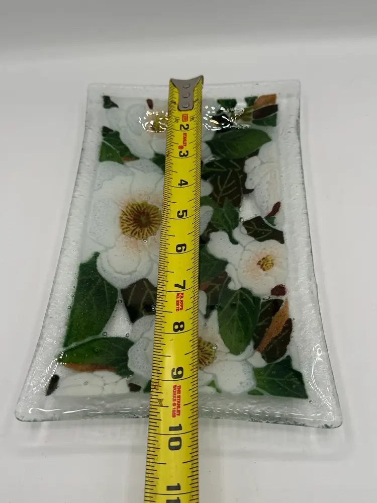 Lovely fused glass try with magnolia blossoms measuring about 9 3/4” x 5 3/4” Signed by artist. Excellent vintage condition with no chips or cracks.