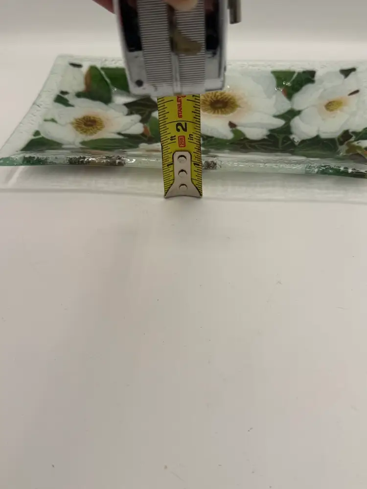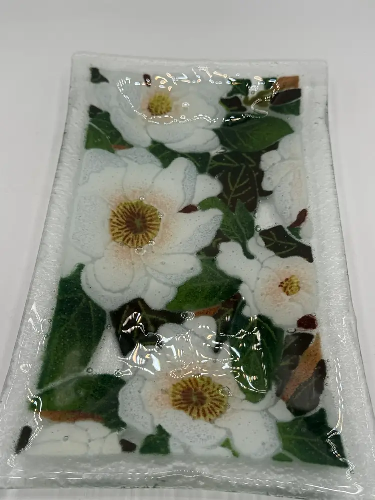 Peggy Karr Fused Glass Magnolia Blossoms Rectangular Tray - Signed
