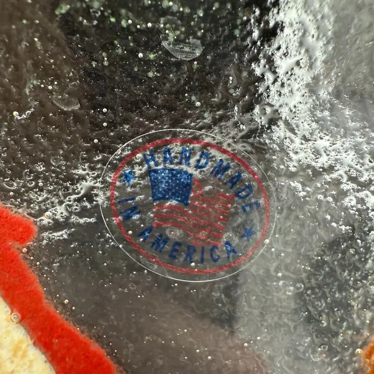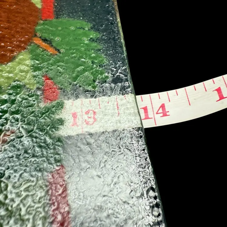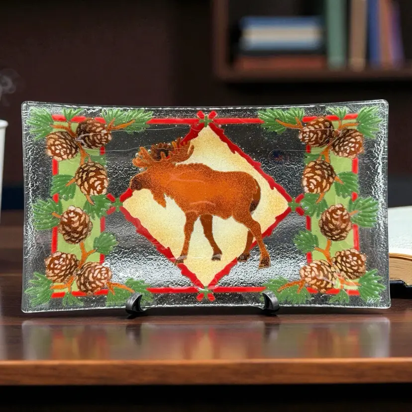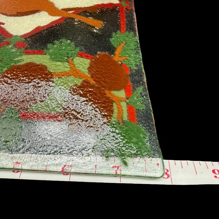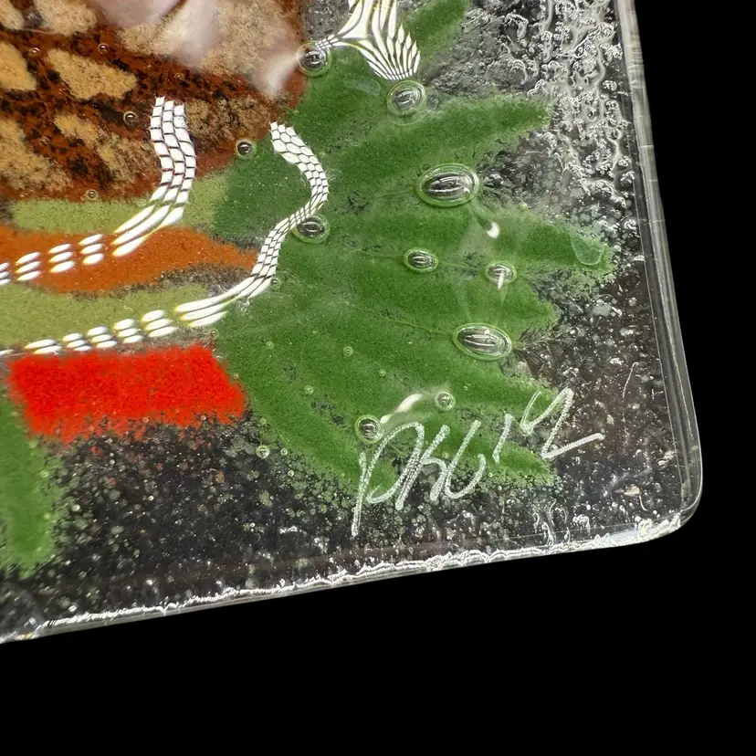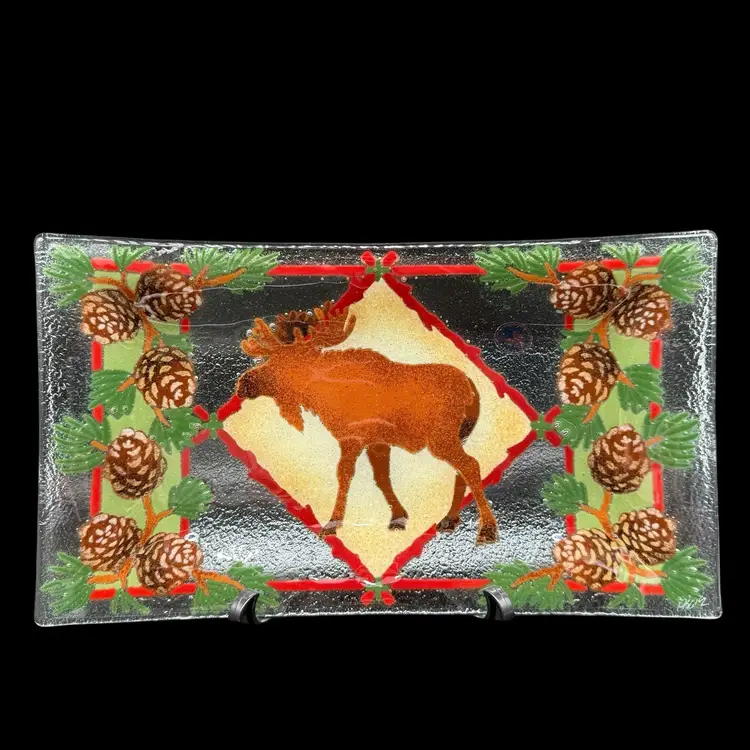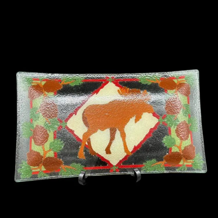 The Peggy Karr Signed Fused Art Glass Tray Plate features a unique design inspired by nature, with a lodge-themed pattern showcasing a moose and pine cones. This handmade decorative plate is a vintage piece from the 1990s, created using fused glass technique in the United States. The multicolor design and contemporary style make it a standout piece for all occasions, perfect for adding a touch of artistry to any home decor.
