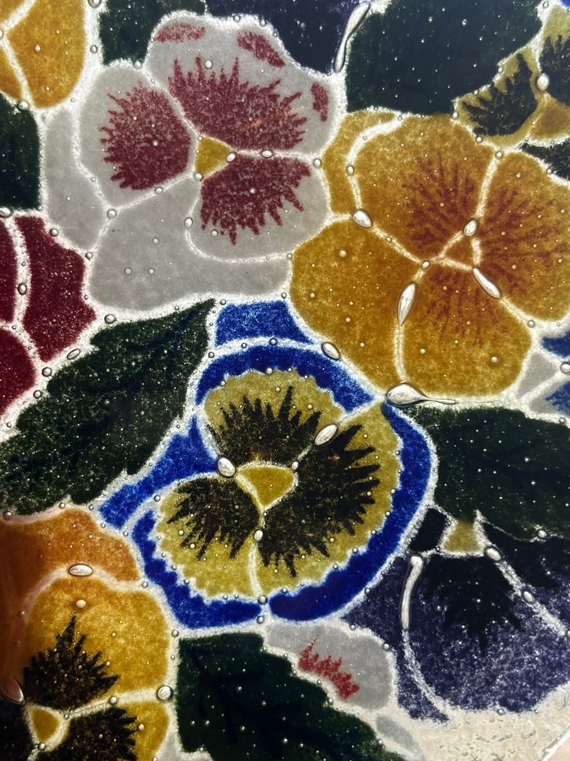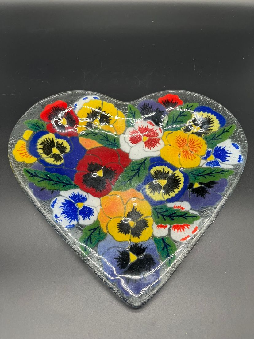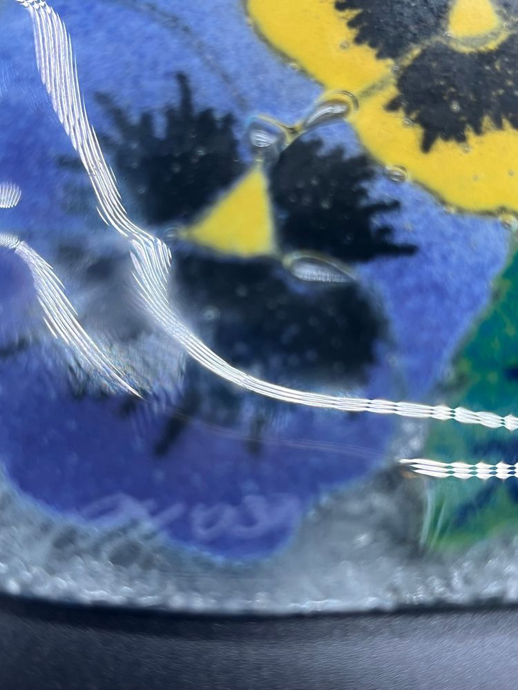 Peggy Karr signed and dated '03 fused glass featuring colorful pansies and bright colors. Last photo shows with light source behind plate. Perfect for art glass collectors, Peggy Karr collectors and anyone looking for bright floral decor. Shipping included. Excellent condition, no chips or cracks. Some air bubbles, common in fused glass. 9.5" tall, 10" wide.