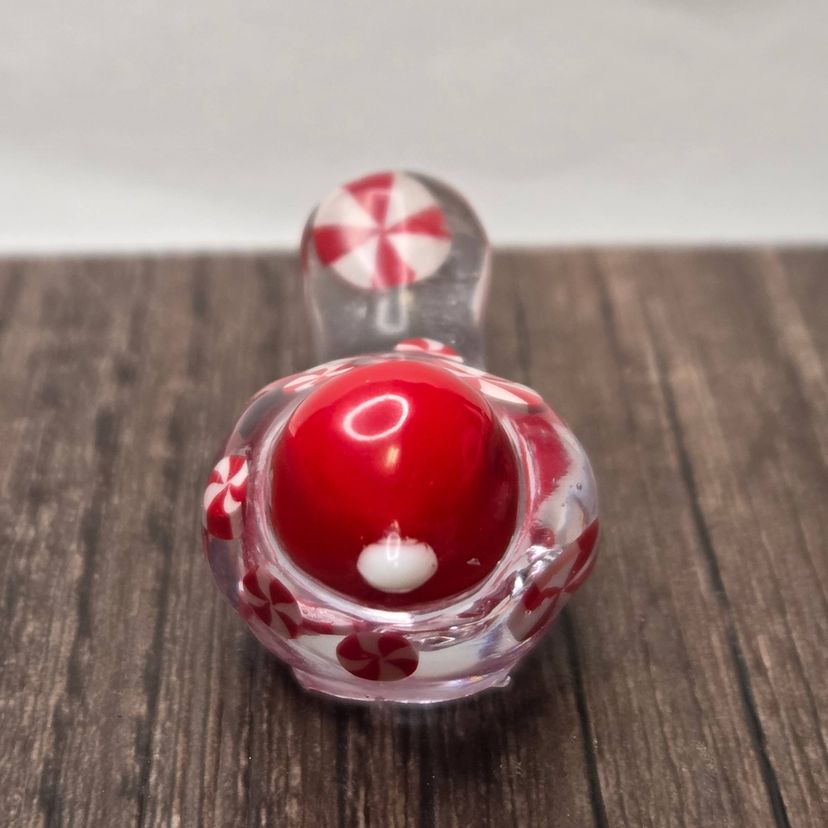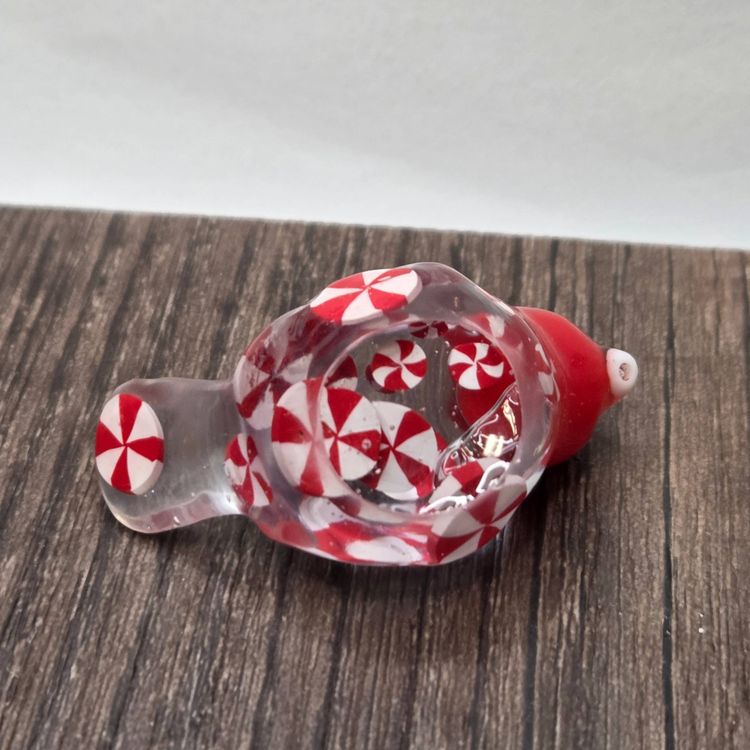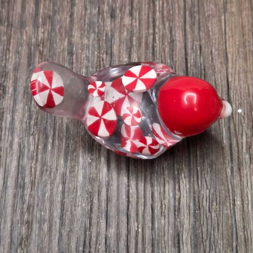 She is made with a white seed bead beak, a red bead from a necklace and her tailfeather and body have peppermint slices cut from a polymer clay cane handmade by me.