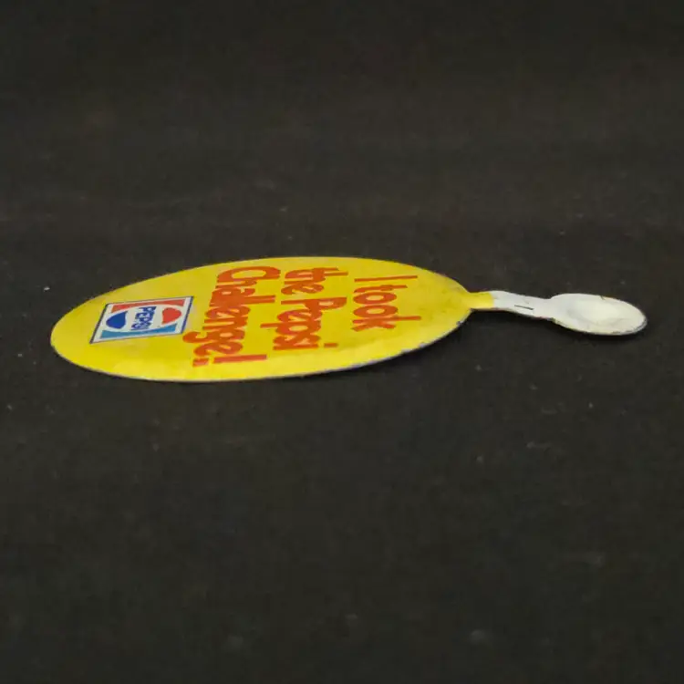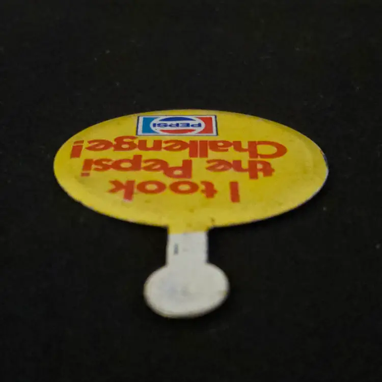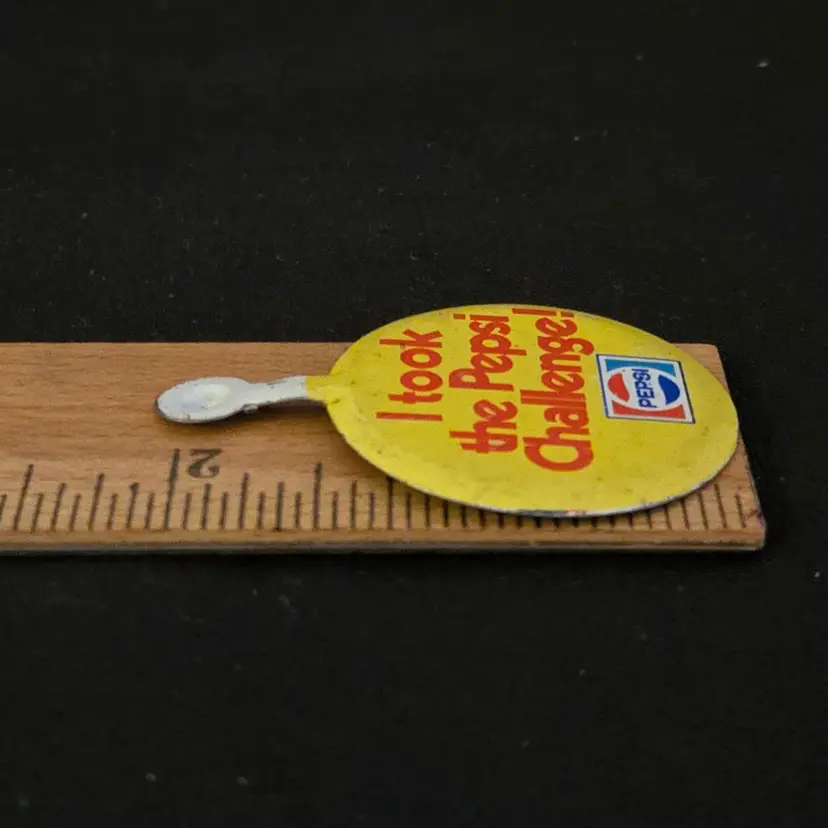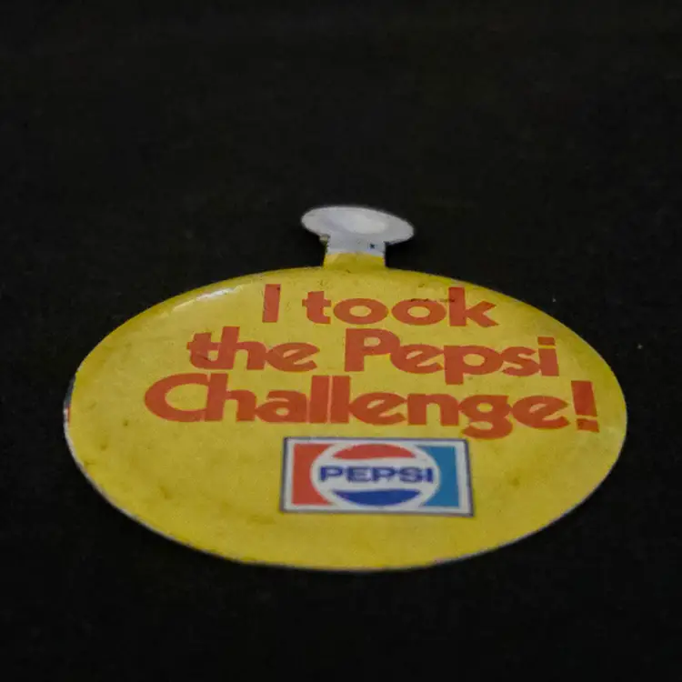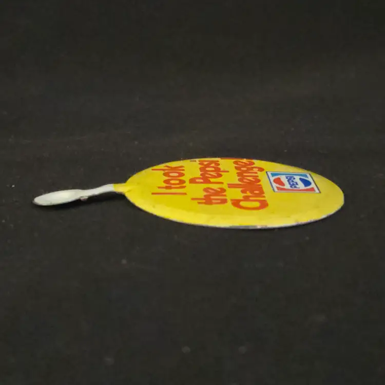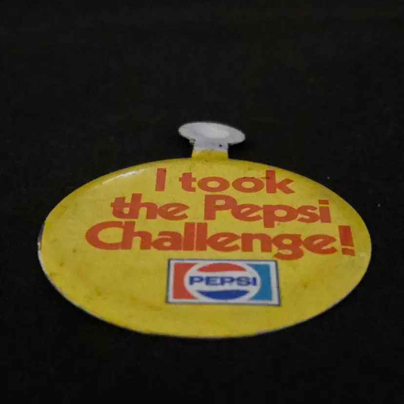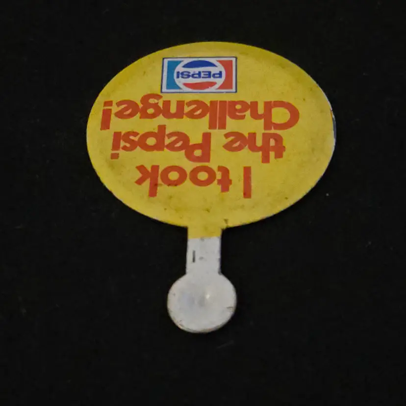 Pepsi Cola Folding Button Pin - I took the Pepsi Challenge! - 1970s Diameter 1½" Vintage with Condition Issues. Used condition with tab having been folded then straightened, scratches, edgewear, tarnish, stains, dirt, scuffs all from being used. NOTE: color rendition may differ slightly from the actual item photos to what you receive if purchased due to lighting conditions. Please view all the photos and please ask any questions prior to purchase when possible.