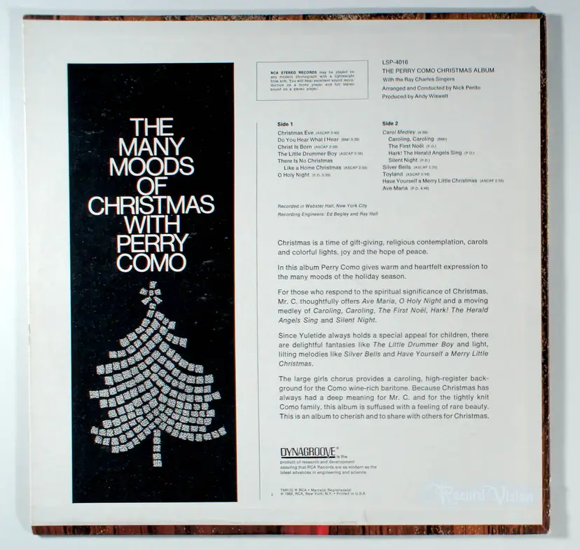 Christmas Album is a collection of Christmas songs by Perry Como. Como is accompanied on the album by the Ray Charles Singers and an orchestra arranged and conducted by Nick Perito. On two songs, The Little Drummer Boy and Have Yourself a Merry Little Christmas, boy choristers from the Little Church Around the Corner and from Saint Thomas Church (Manhattan) also participated.