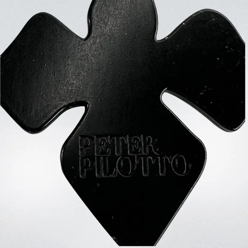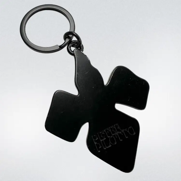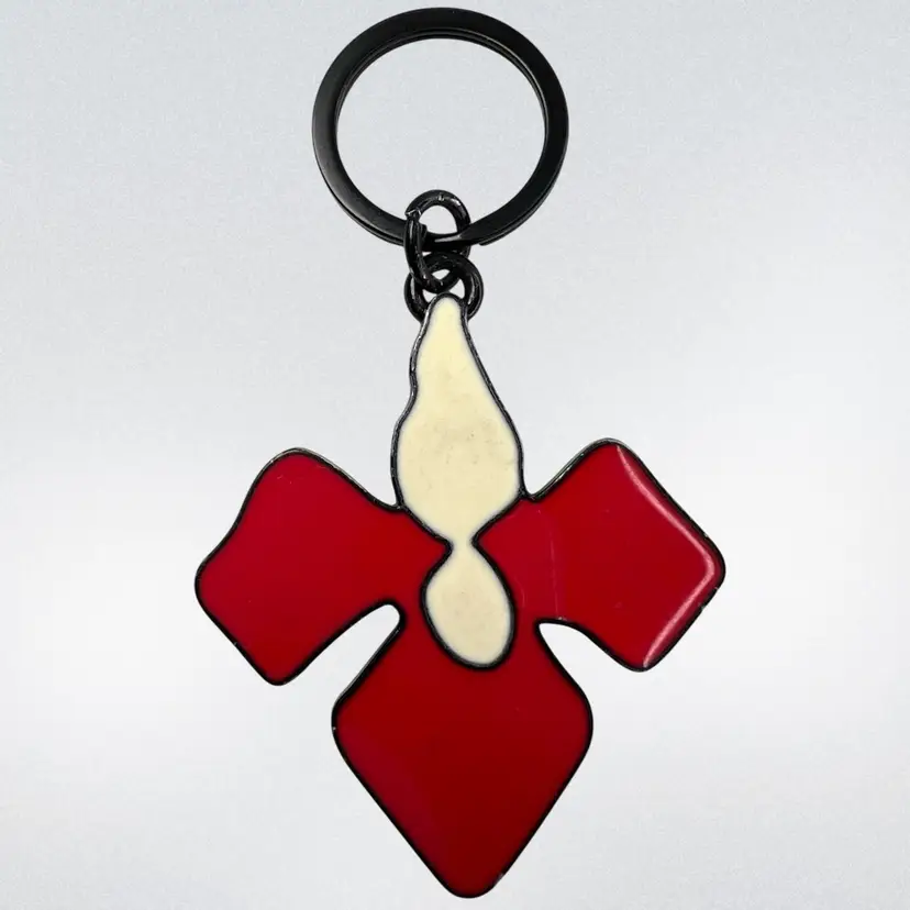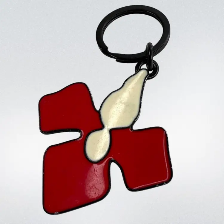 Peter Pilotto Metal Keychain Engraved on Reverse with his name Red & White Enamel 2-1/4” Orchid-Shape 1” Black Metal Keychain Ring Total length 3-1/2” Condition: Minor scratching to enamel