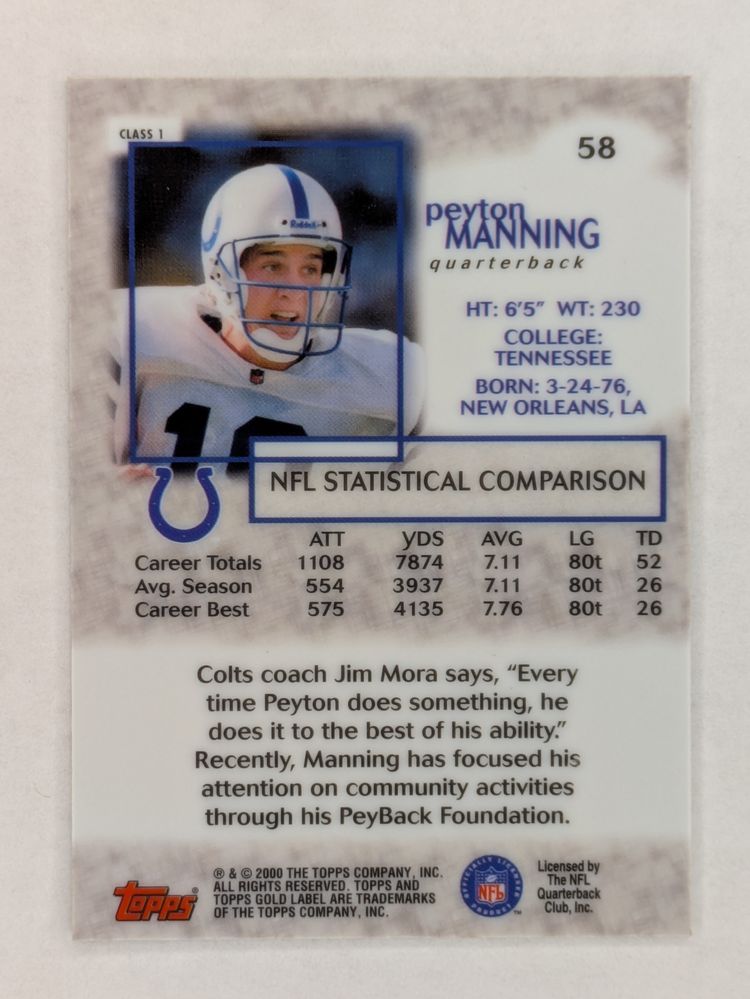 2000 Topps Gold Label Class 1 #58 Peyton Manning card featuring the Hall of Fame quarterback during his early Colts years.