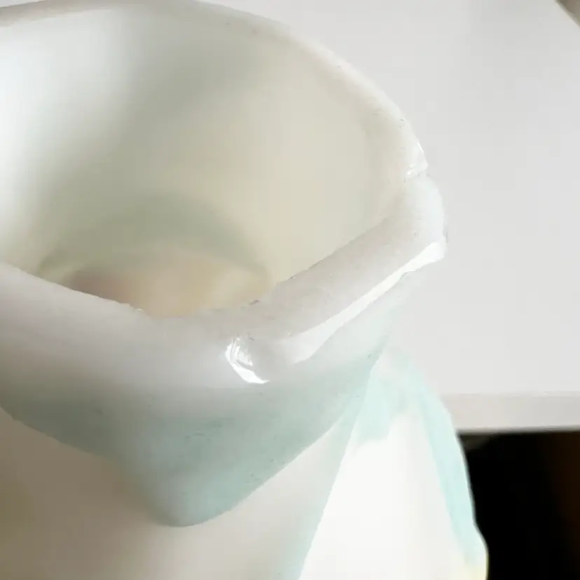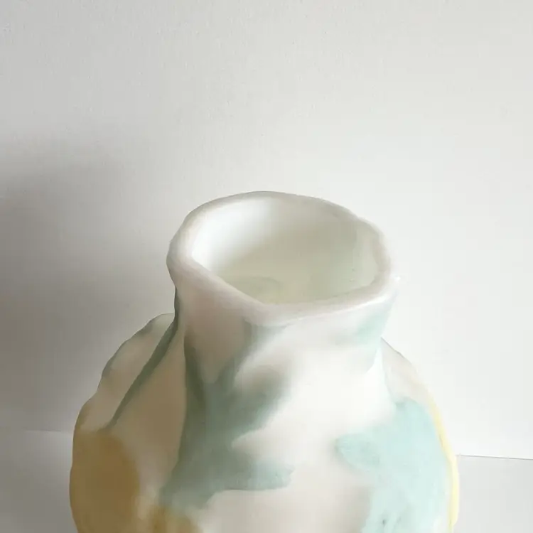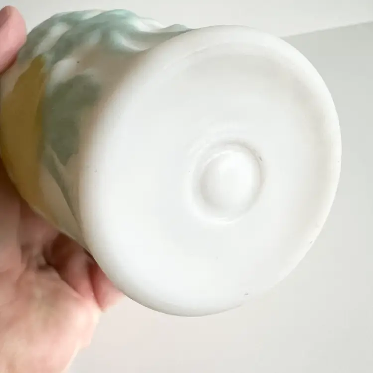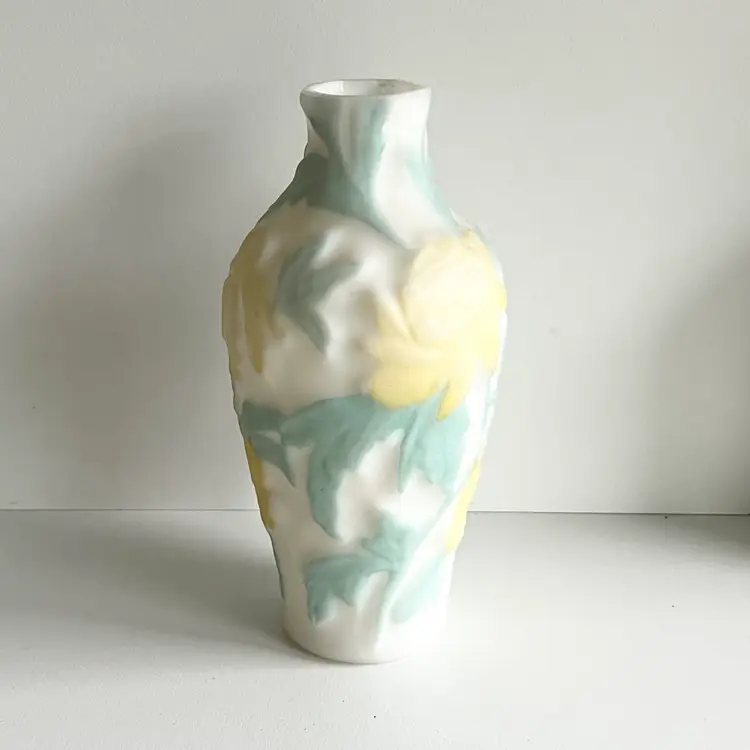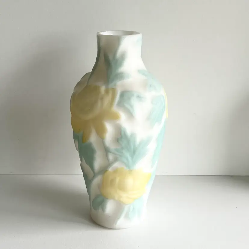 This very pretty pale yellow and green Phoenix Consolidated cameo vase would be beautiful as part of an Easter display. Made in the 20s and 30s, you can see the influence of the Art Deco Era. Note that there are some chips on the inside rim and the price reflects this. 7 3/4 inches tall by 4 inches wide. Ships from Canada.