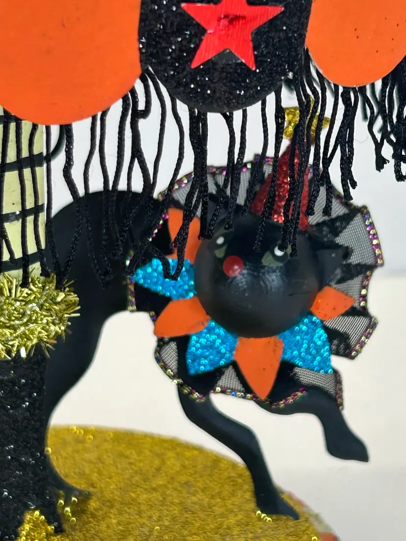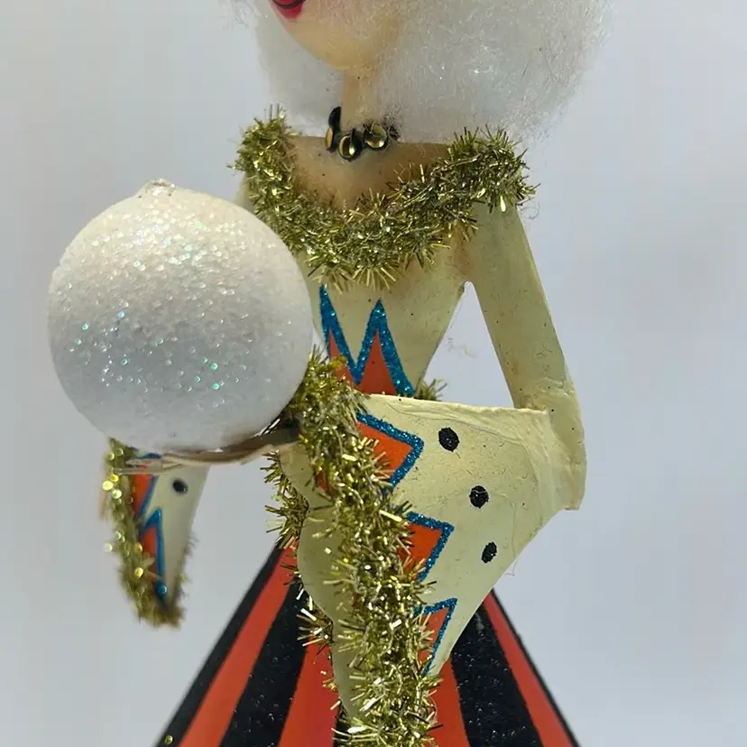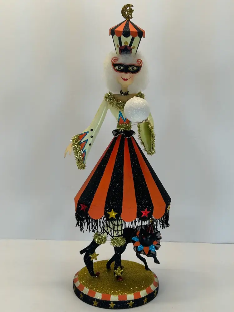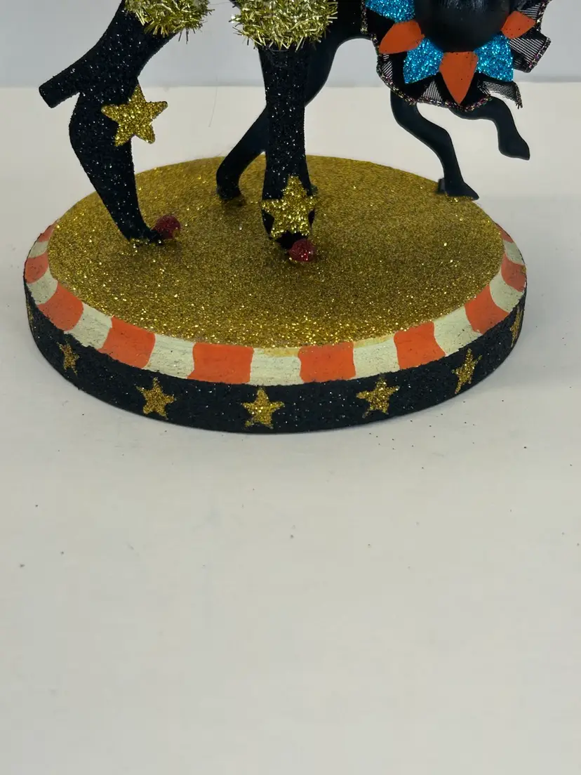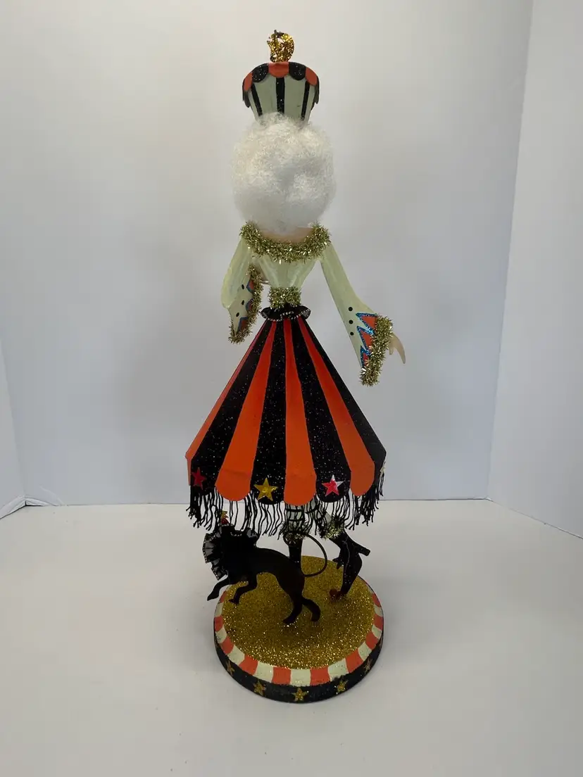 She stands 16 1/2” tall. She is a metal sculpture on a wooden platform.