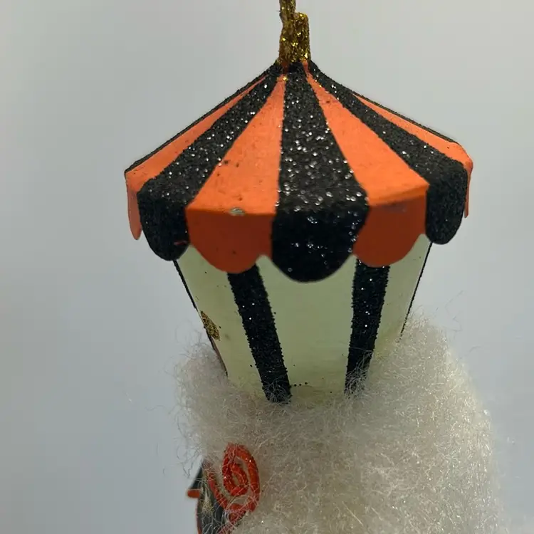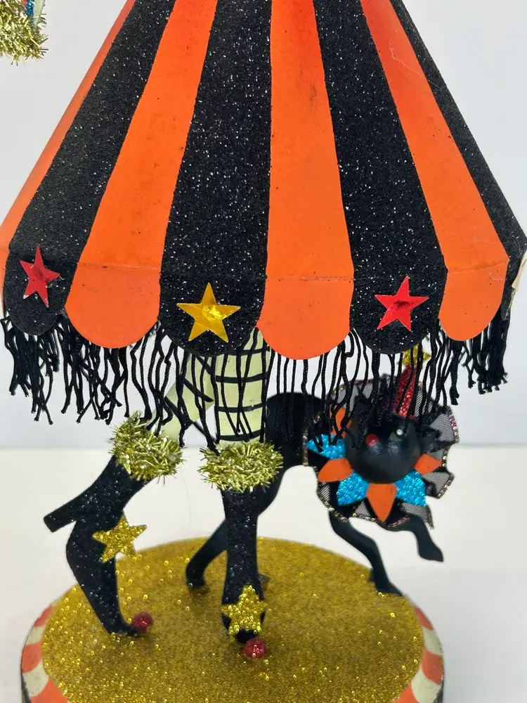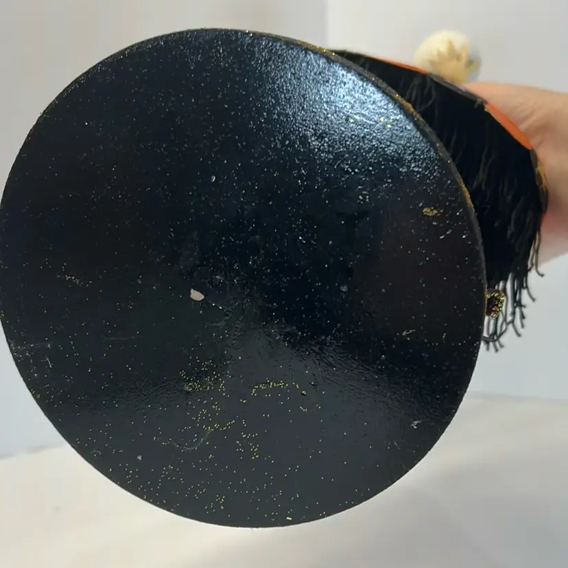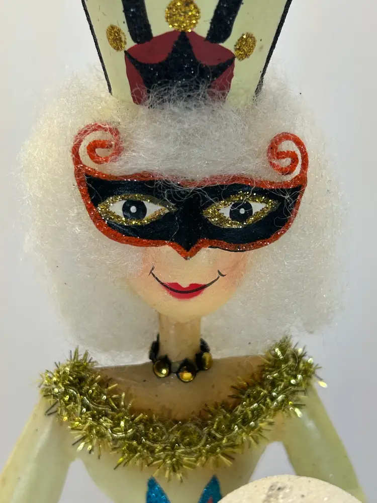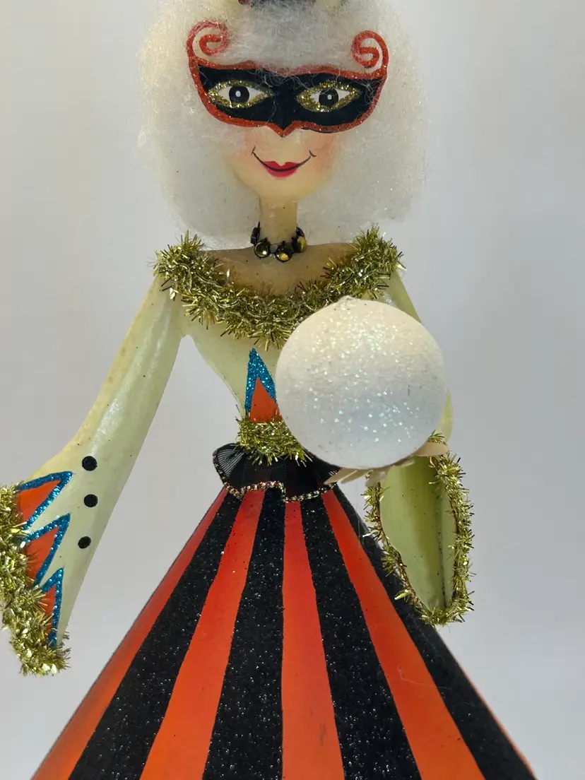 She stands 16 1/2” tall. She is a metal sculpture on a wooden platform.