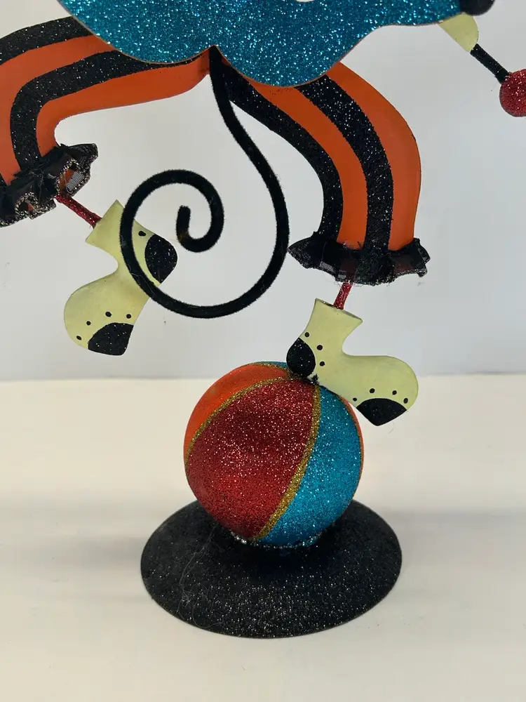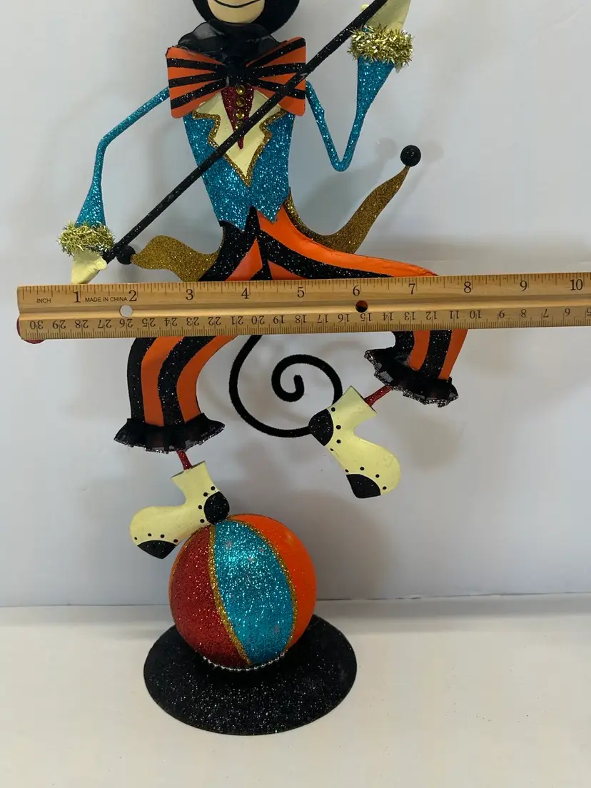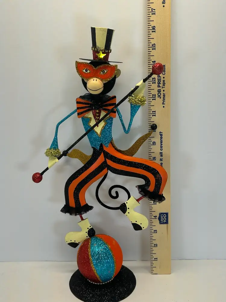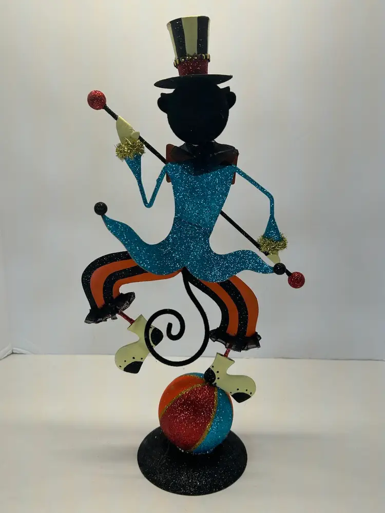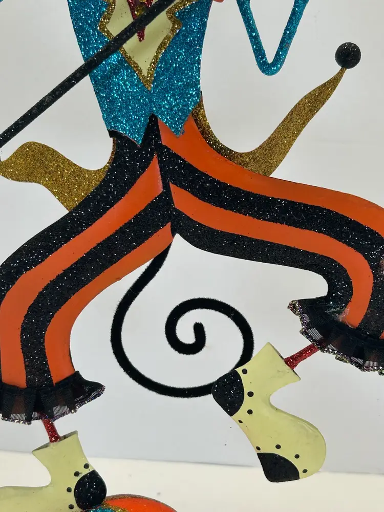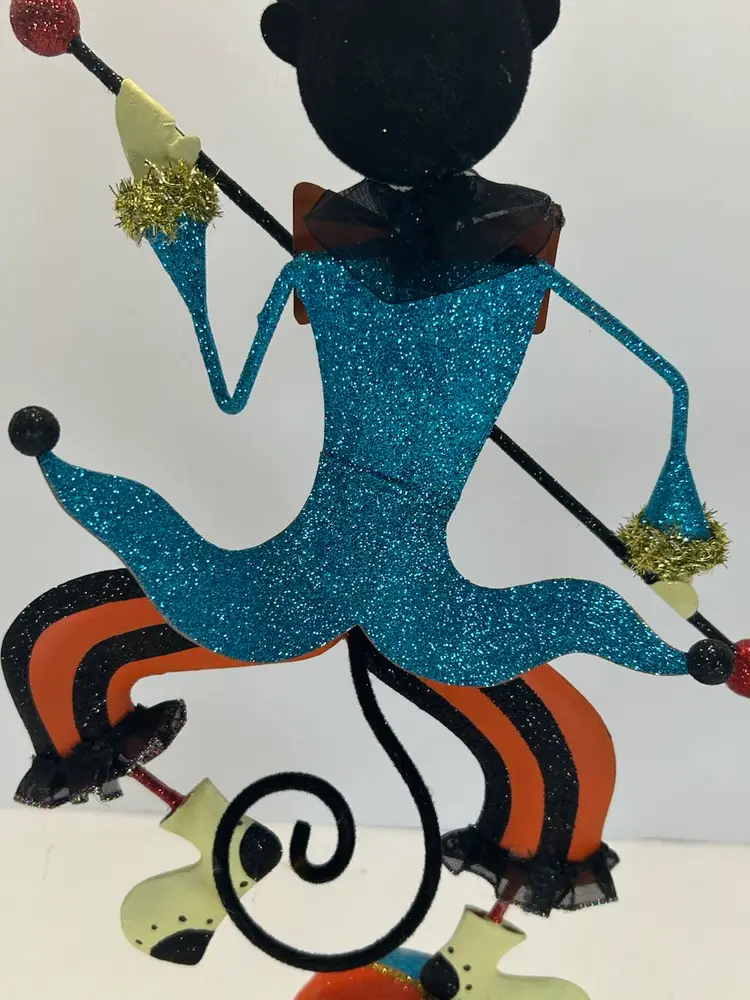 This metal sculpture figurine stands 16” tall. He is missing some black glitter on his pants.