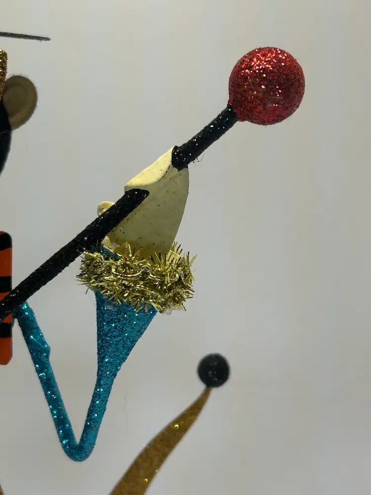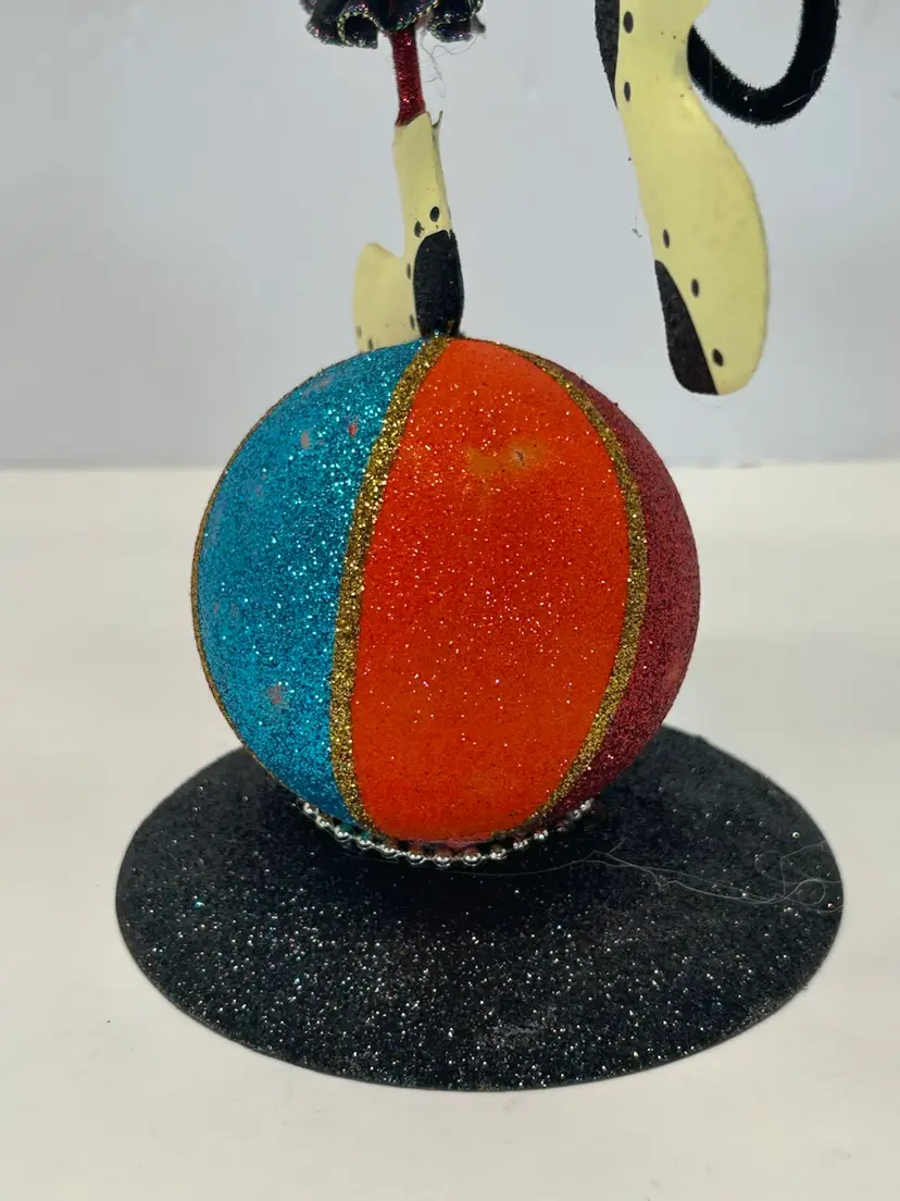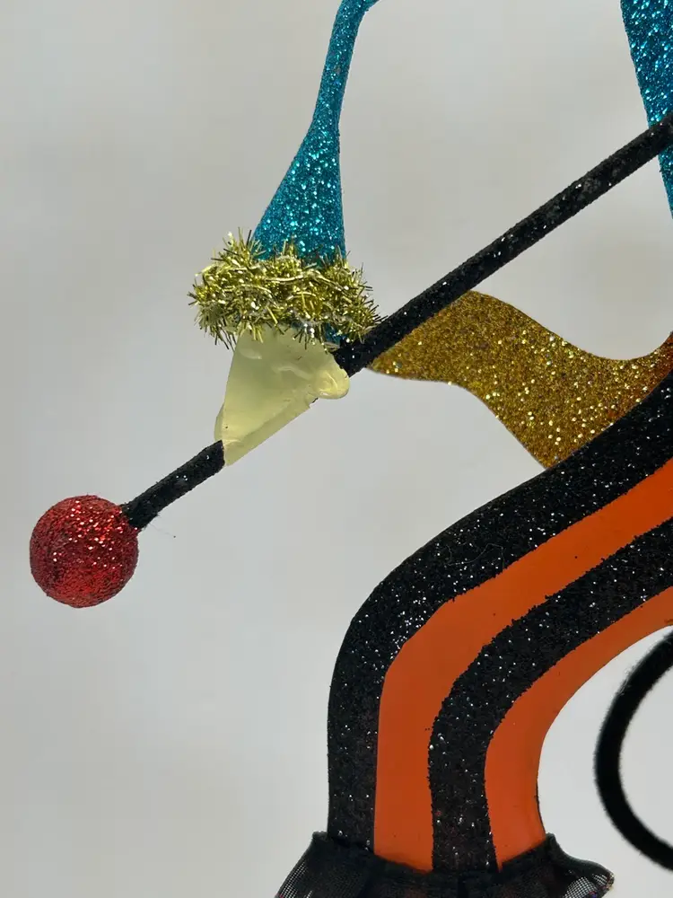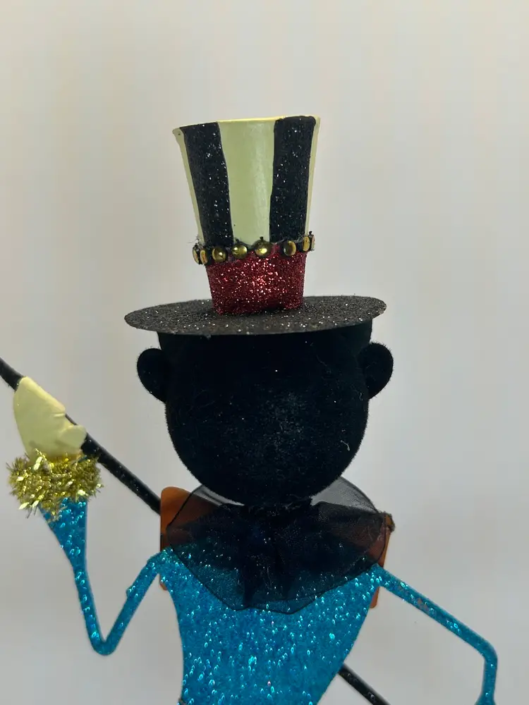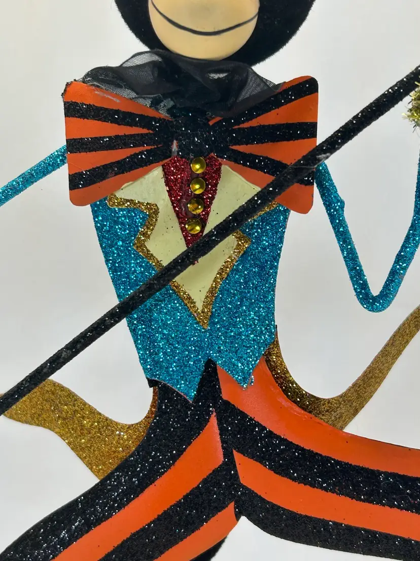 This metal sculpture figurine stands 16” tall. He is missing some black glitter on his pants.