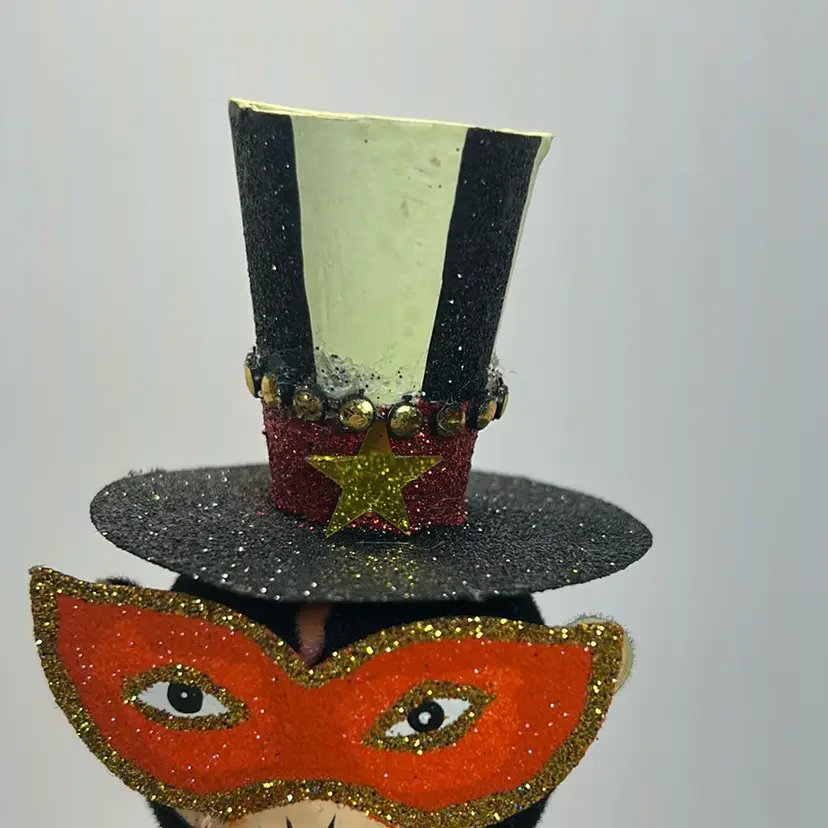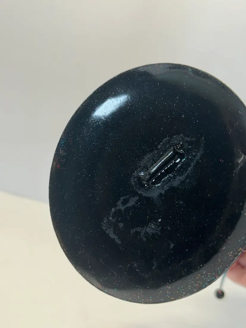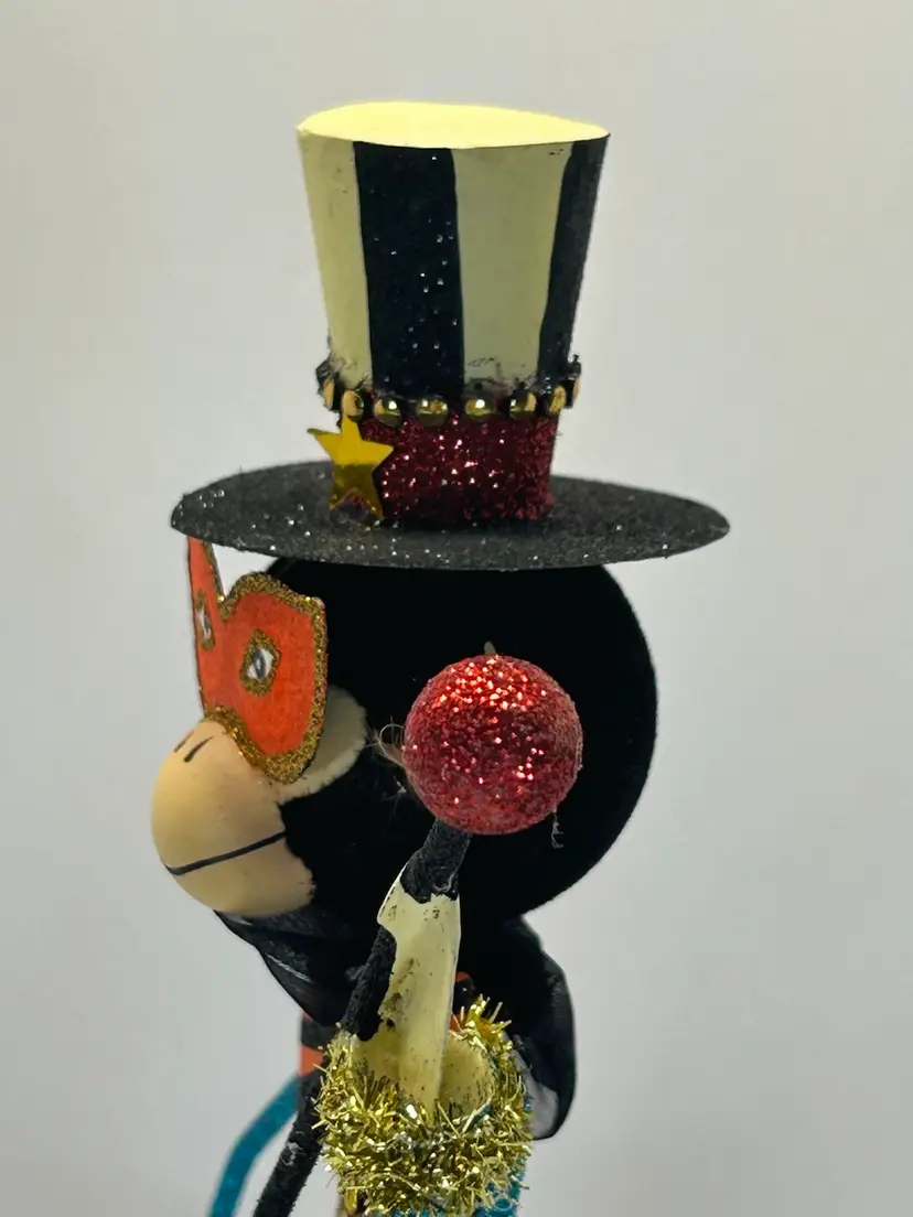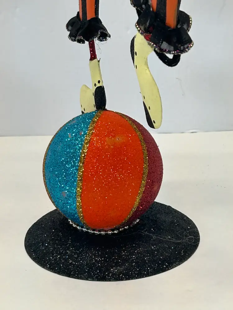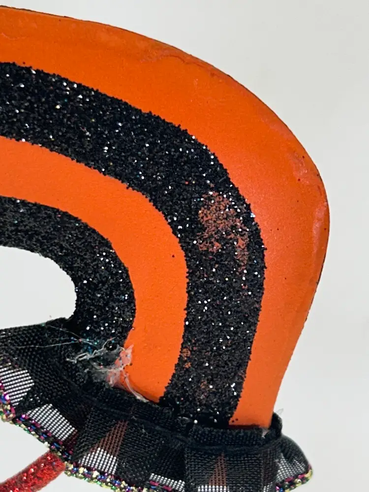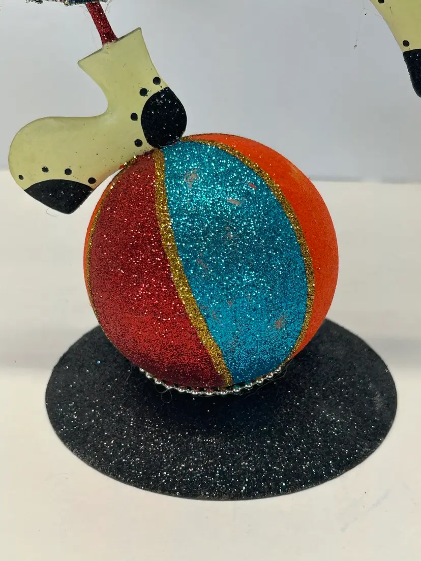 This metal sculpture figurine stands 16” tall. He is missing some black glitter on his pants.