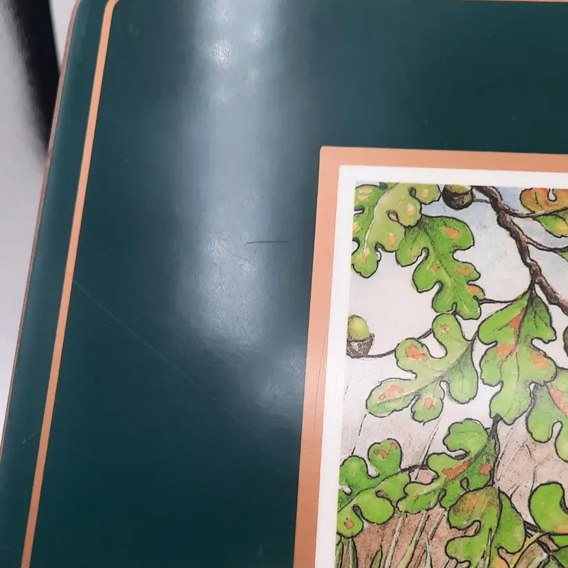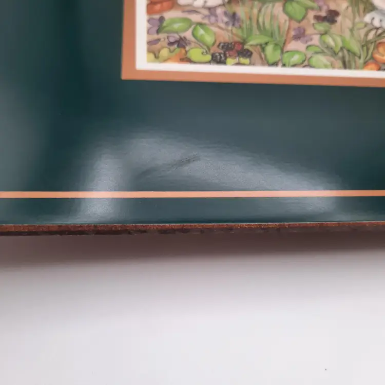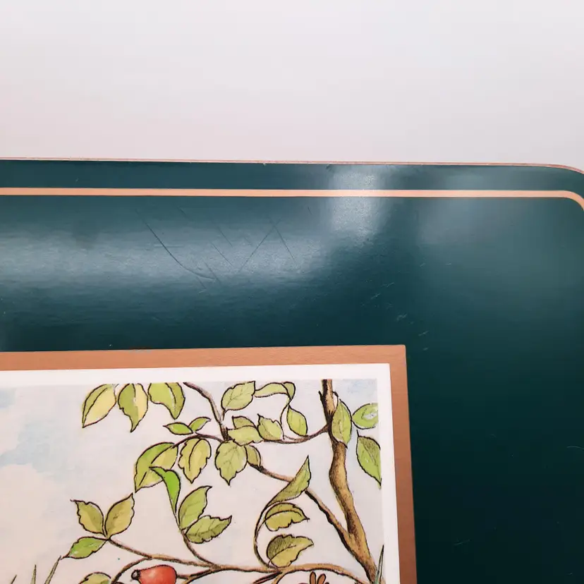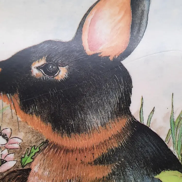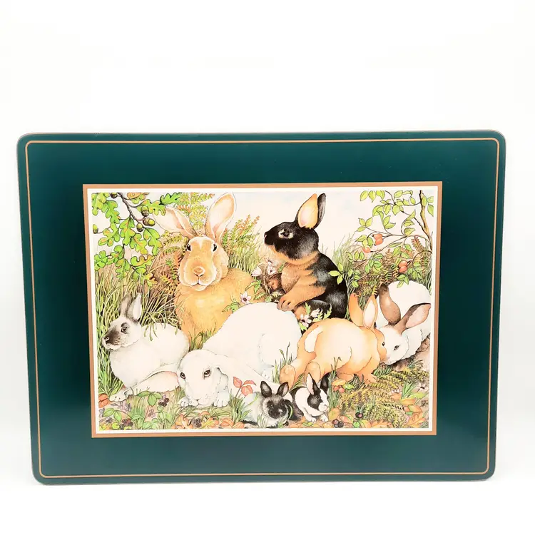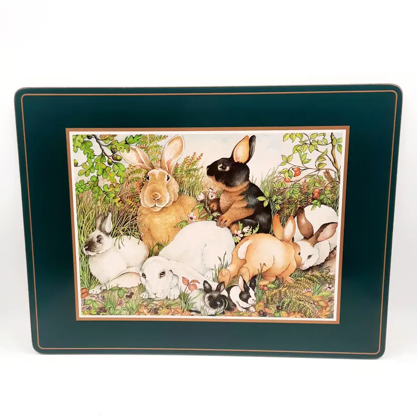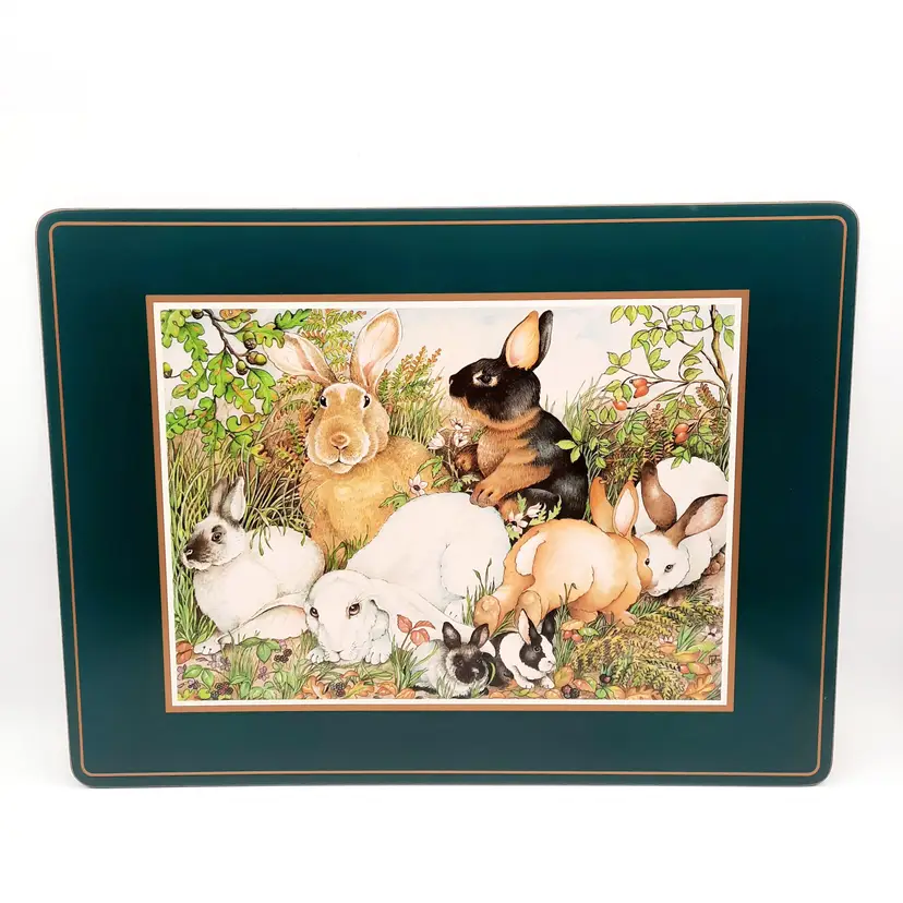 These darling bunny placemats with a deep forest green border are in overall very good condition with some scuffs and lines, some wear to a few places on edges, 15 1/2" x 11 1/2"