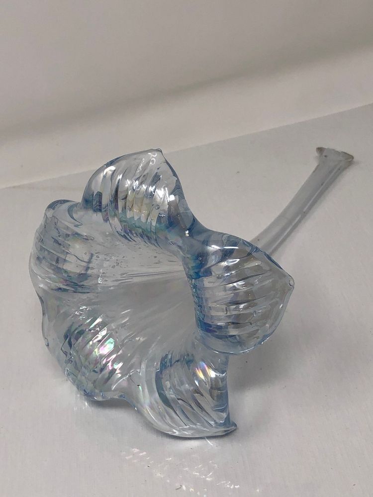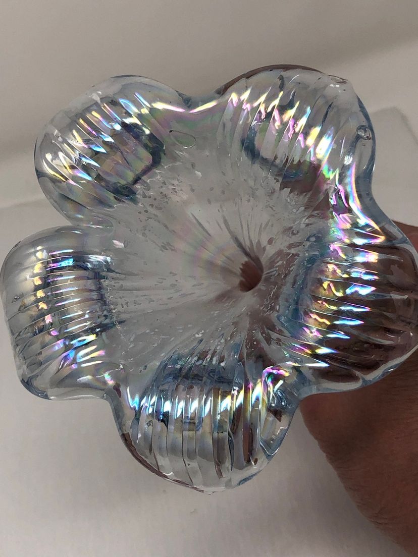 7" iridescent glass lily flower vase speckled and iridescent. No markings or labels, no chips or cracks.