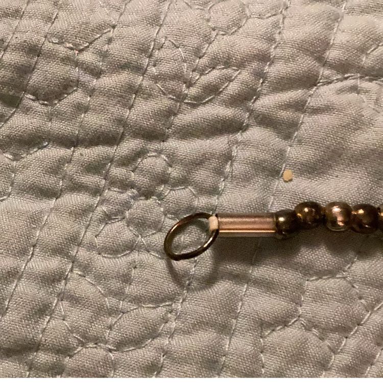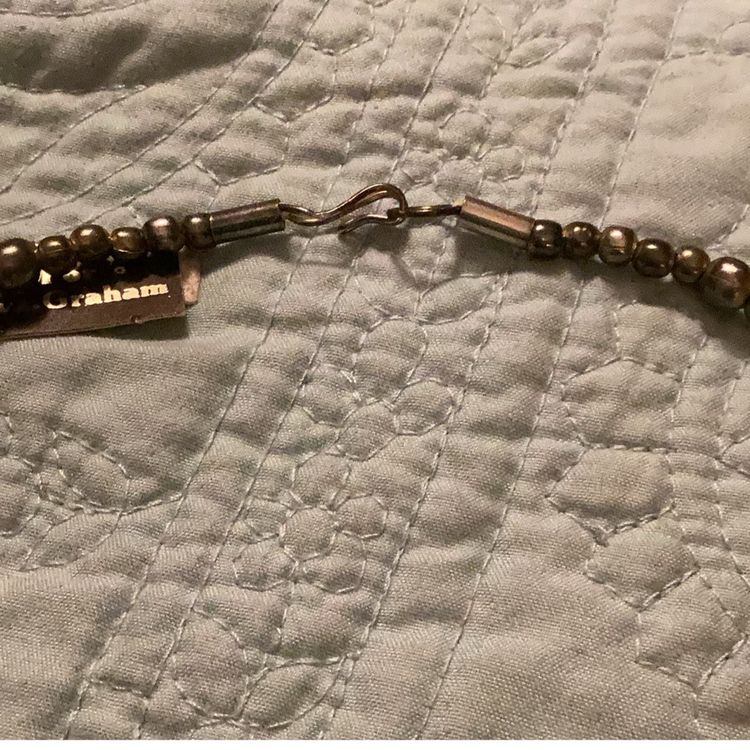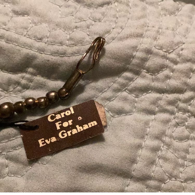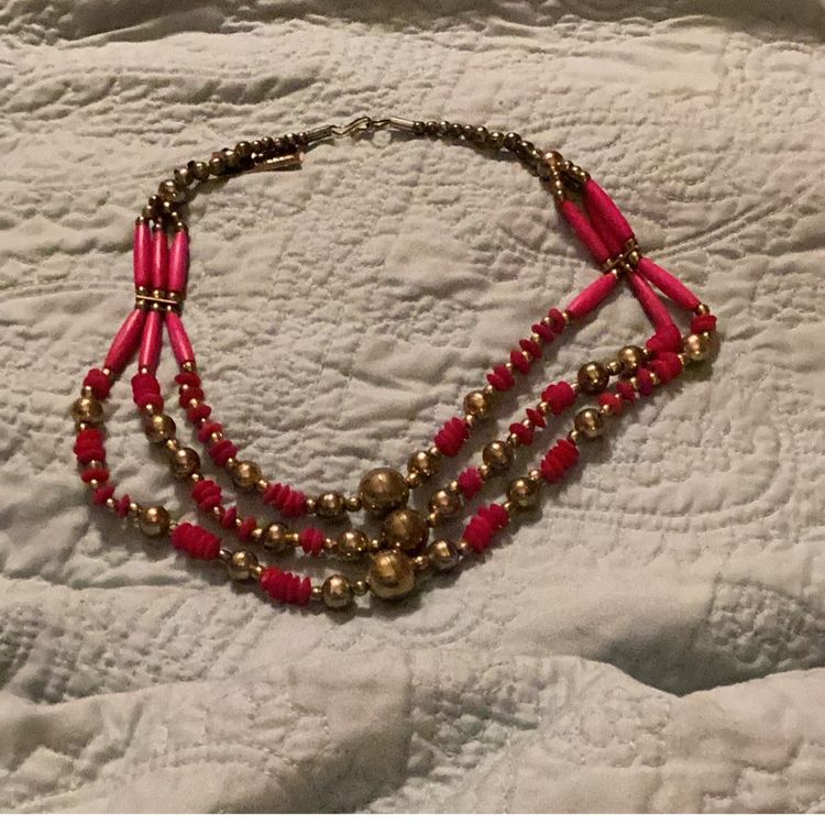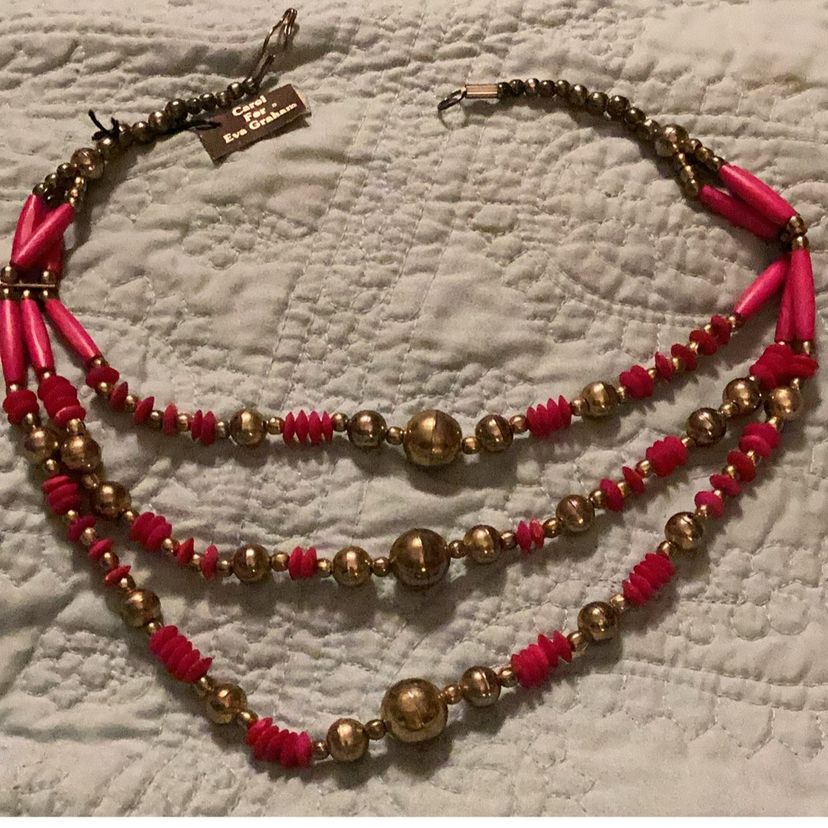 Pink 3 Strands Necklace Gold Toned, Three Layers pinkish type chartreuse colors sticker on necklace says Carol for Eva Graham handcrafted