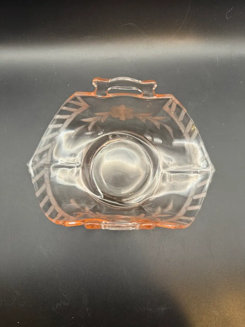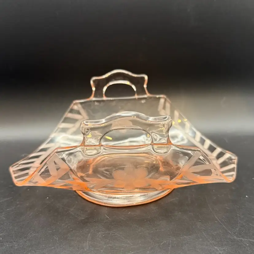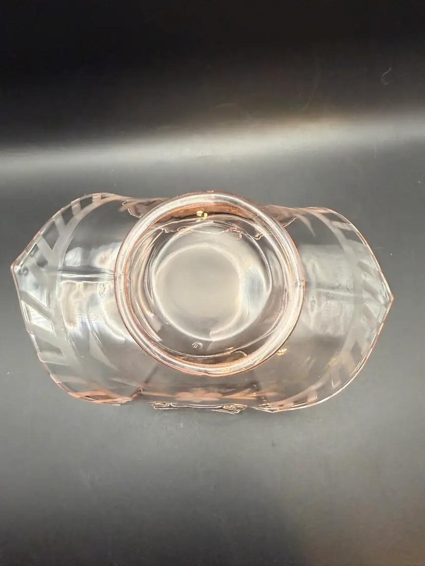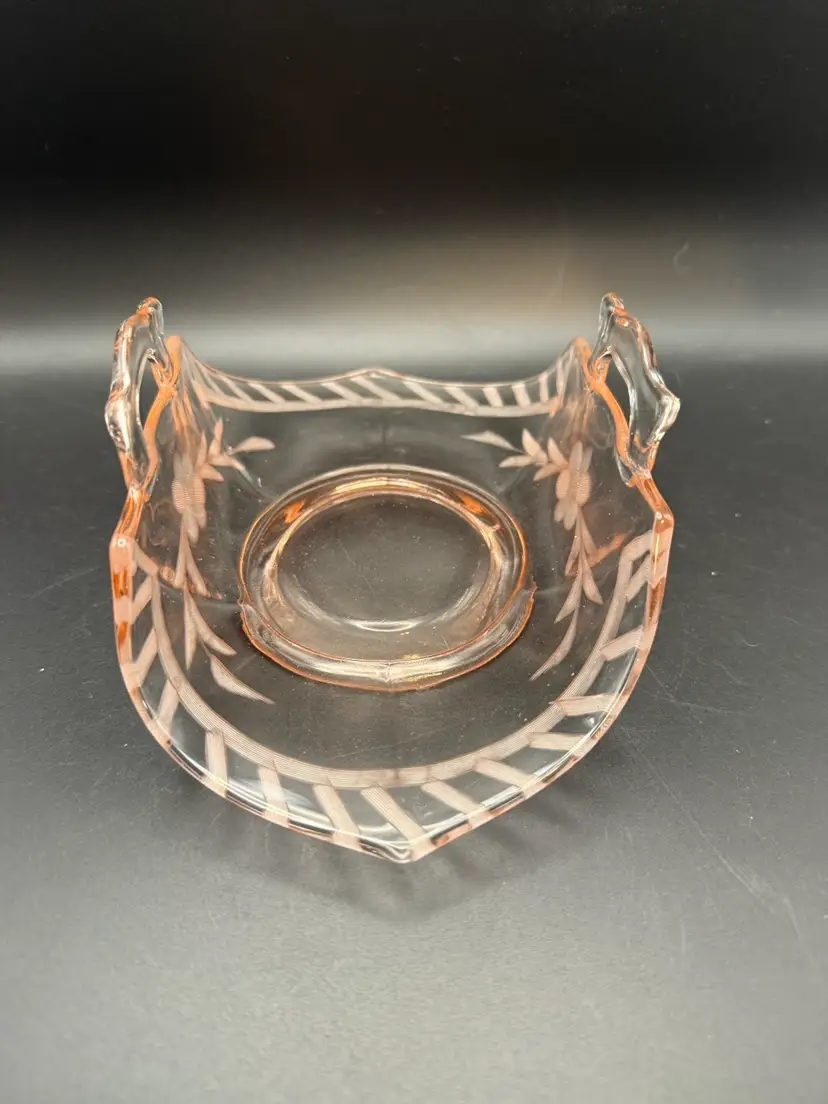 This particular piece, a pink glass basket with etched floral and geometric motifs, is characteristic of the decorative items produced during the Art Deco and mid-century modern periods.