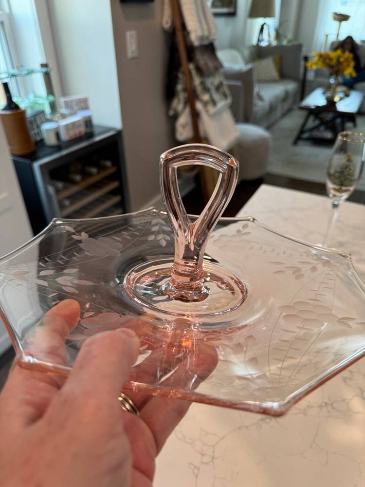 This beautiful plate is a perfect example of depression glass. Pale pink, a lovely etched design and an adorable handle. No chips or cracks.