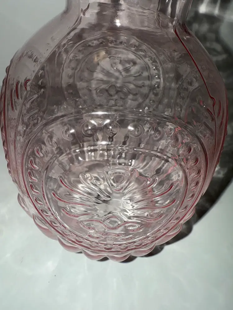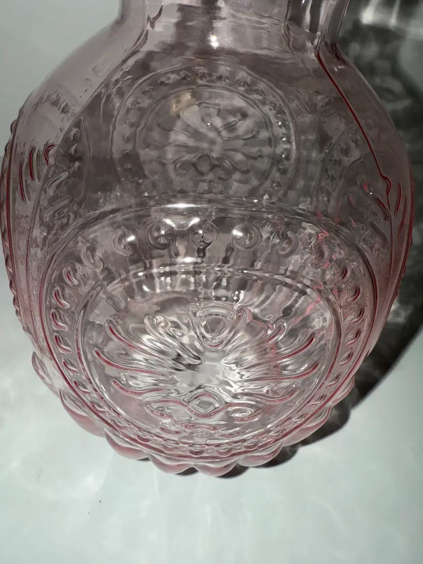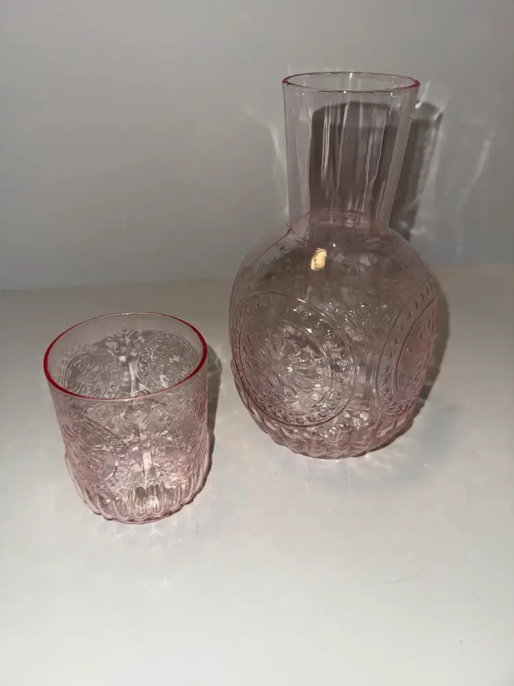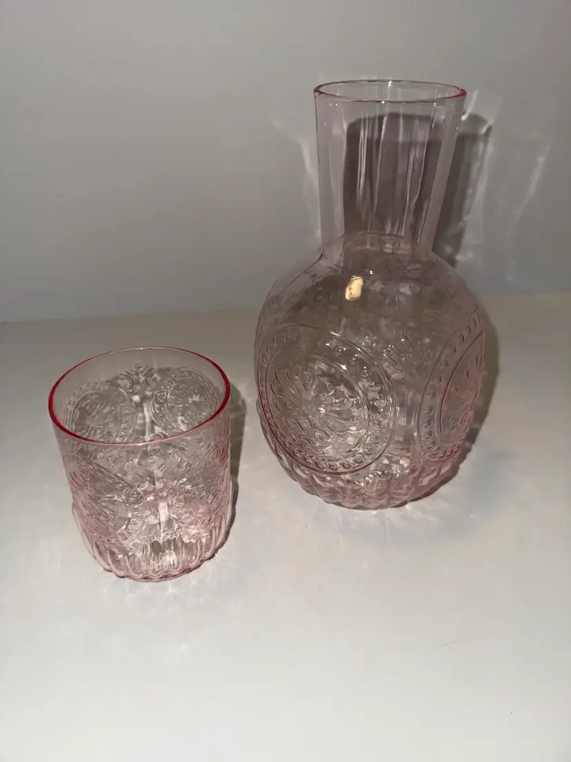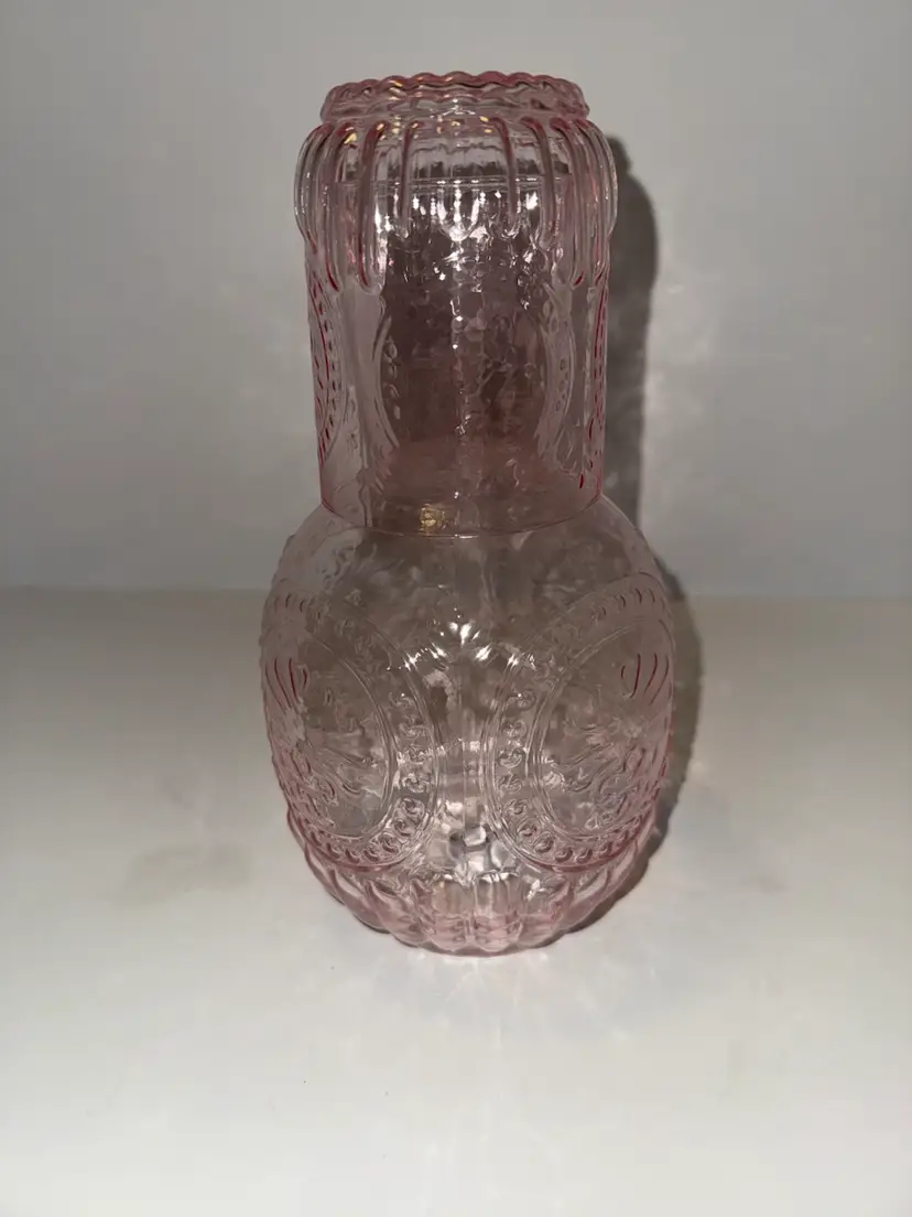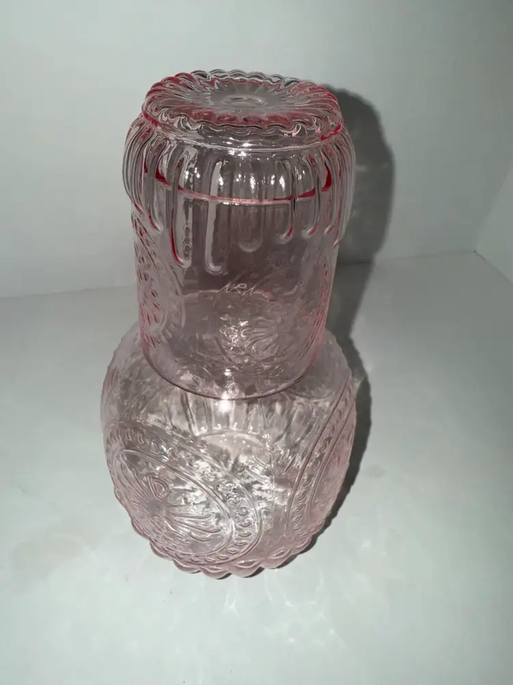 Beautiful pink glass tumble up. 8 inches tall. Cup is 3.75 inches tall. No chips or cracks