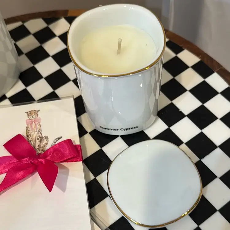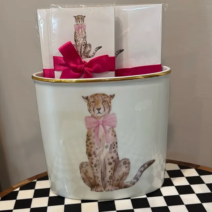 Beautiful vase and candle set. Also includes two notepads. Adorable big cat with big pink bow around its neck. Vase measures 6 inches tall and candle is about 3 1/2. Could also be used as a desk set after the candle has burnt down.
