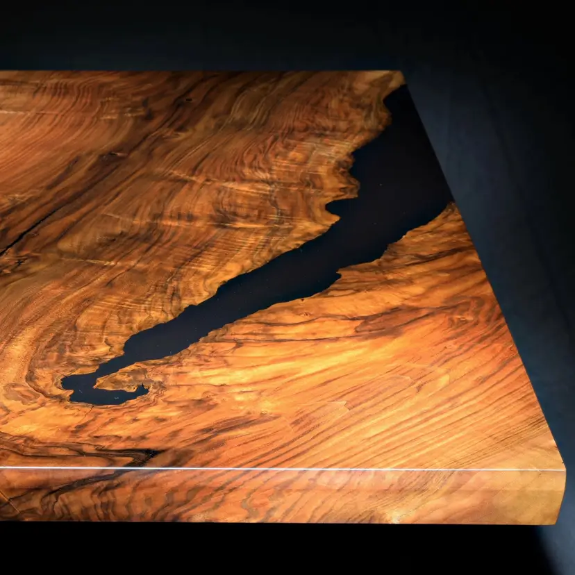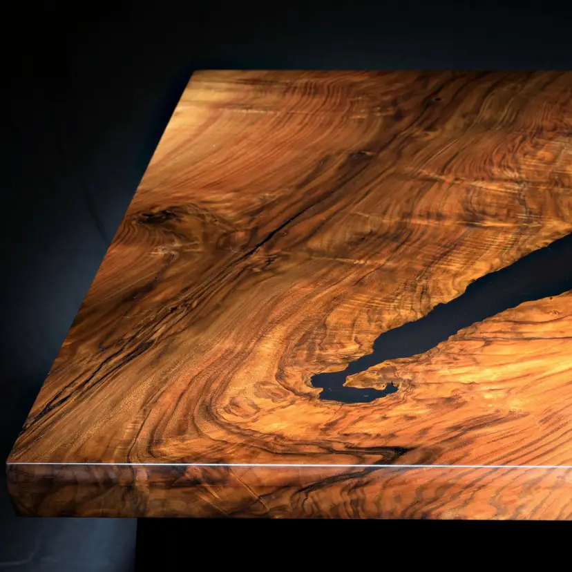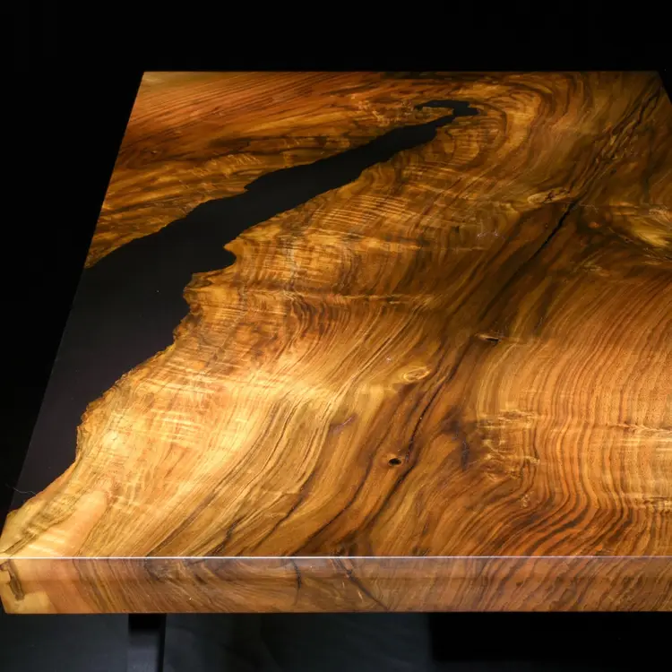 The Bastogne walnut slab that is a rare hybrid prized for its color variation and distinctive grain. The natural contrast between heartwood and sapwood creates an unrepeatable masterpiece.