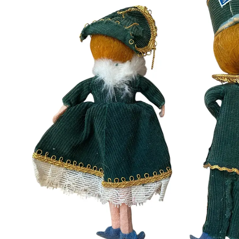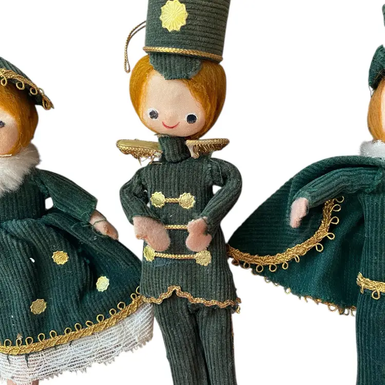 "pixie" or "putz" ornaments. The figures are made with felt, corduroy, and gold trim. MCM Set Of 3