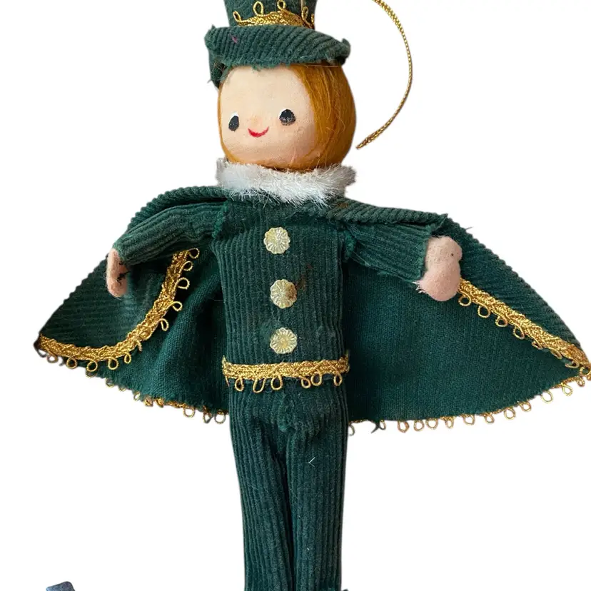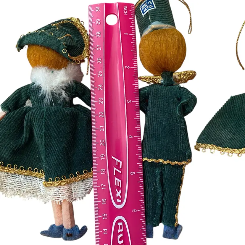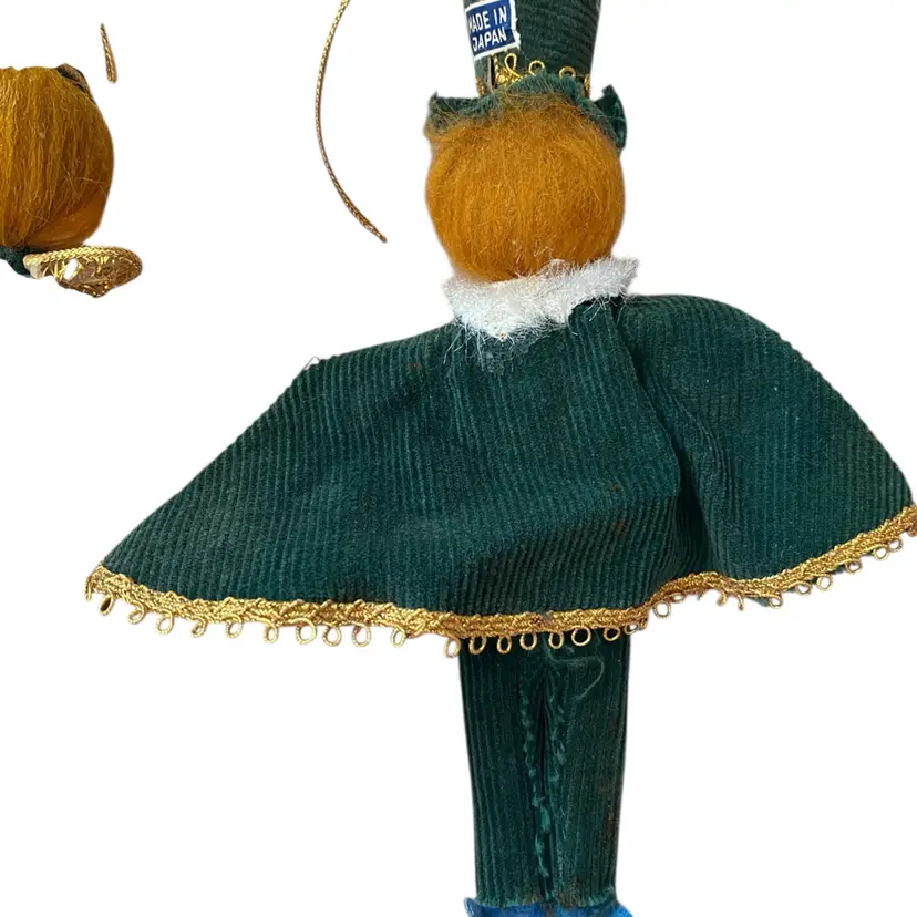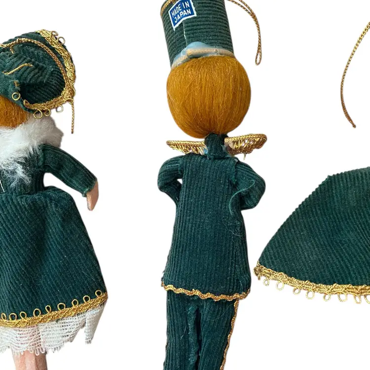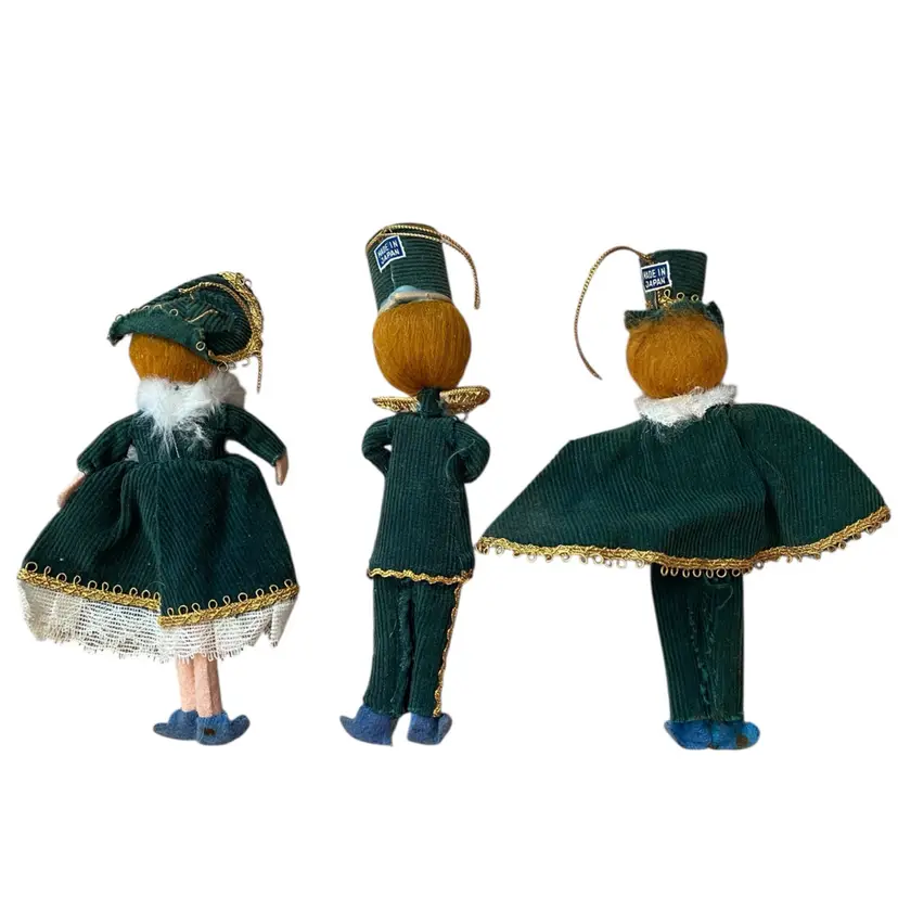 "pixie" or "putz" ornaments. The figures are made with felt, corduroy, and gold trim.mcm set of 3. Hand painted made in Japan