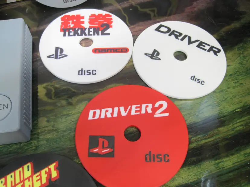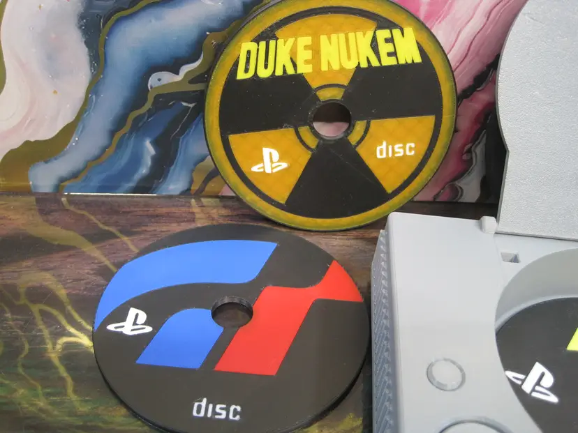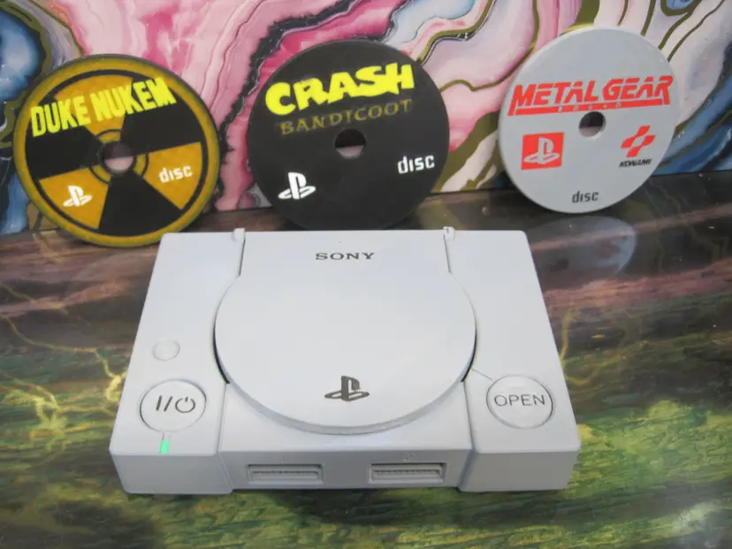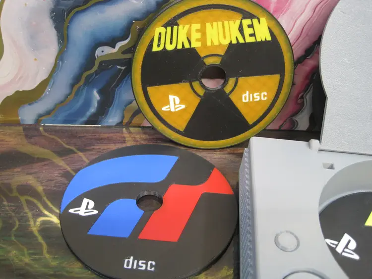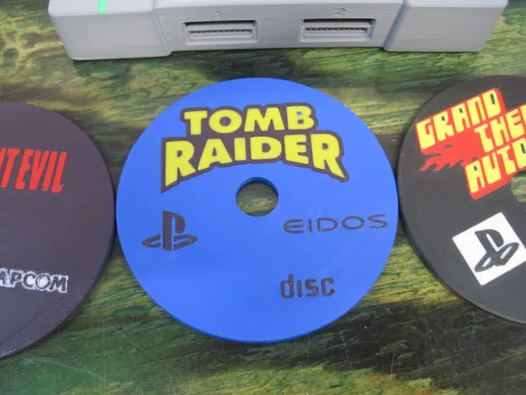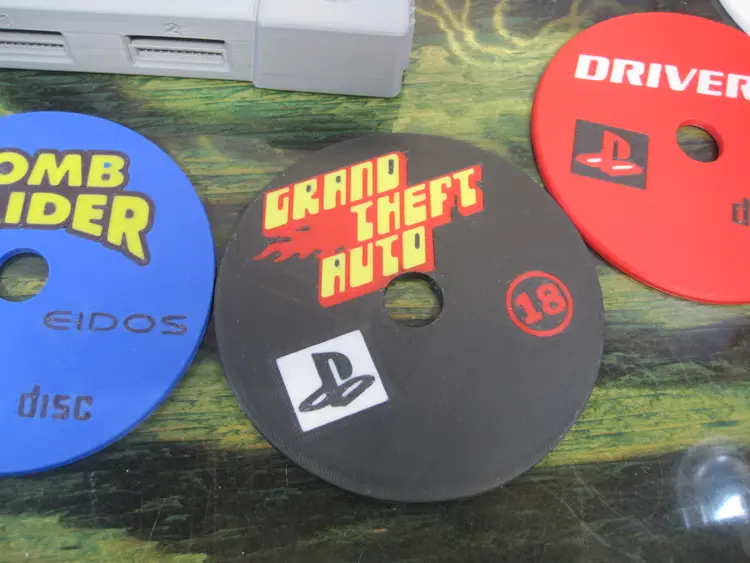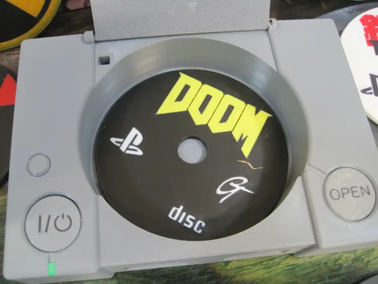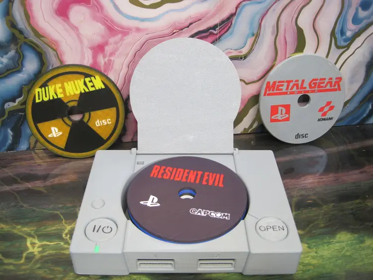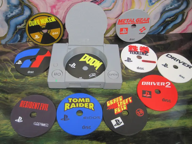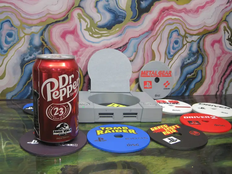 This is a Play Station One PS1 3D Printed Coaster Holder And Coasters Comes with The 3D Printed PS1 Coaster Holder And 10 3D Printed CD Coasters