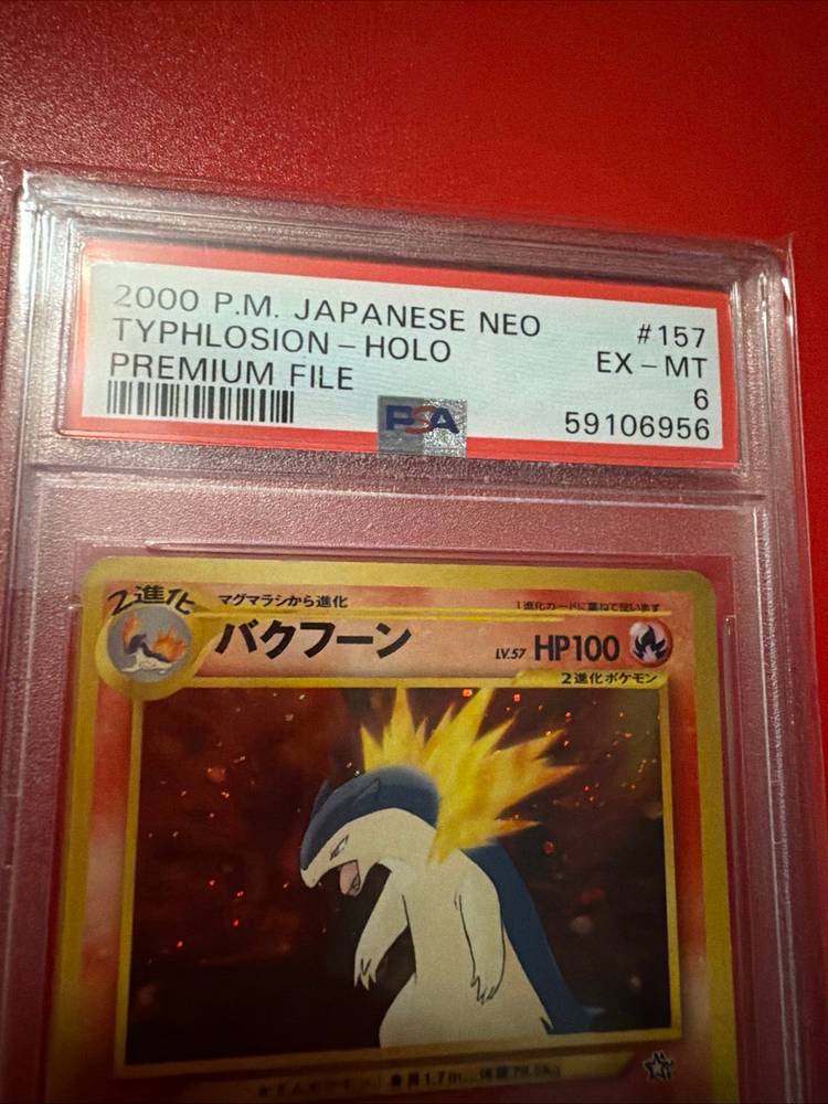 The product is a premium Japanese Typhlosion Pokémon card numbered 157, graded PSA 6. This collectible card is part of the Pokémon Trading Card Game and features the Typhlosion Pokémon. The card is in Japanese language and is a sought-after item for collectors and fans of the Pokémon TCG. With its premium file and rarity, this Typhlosion card would be a valuable addition to any card collection.