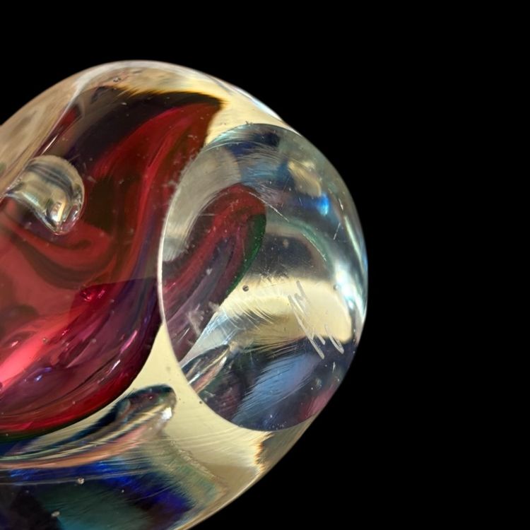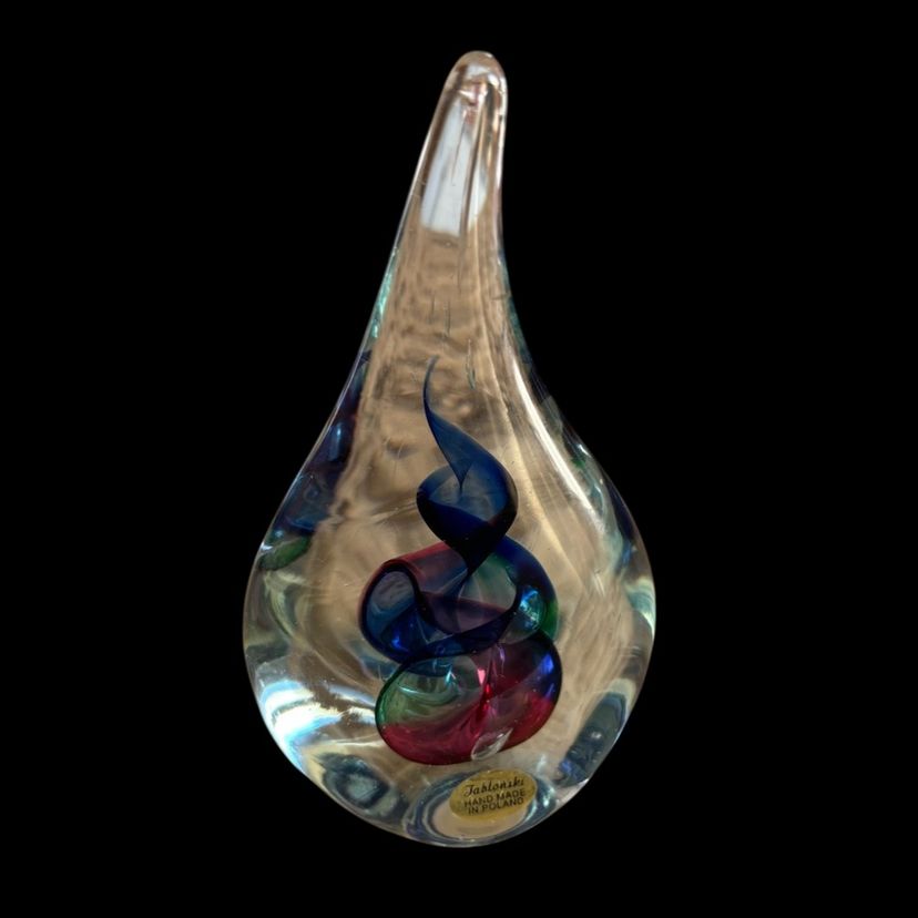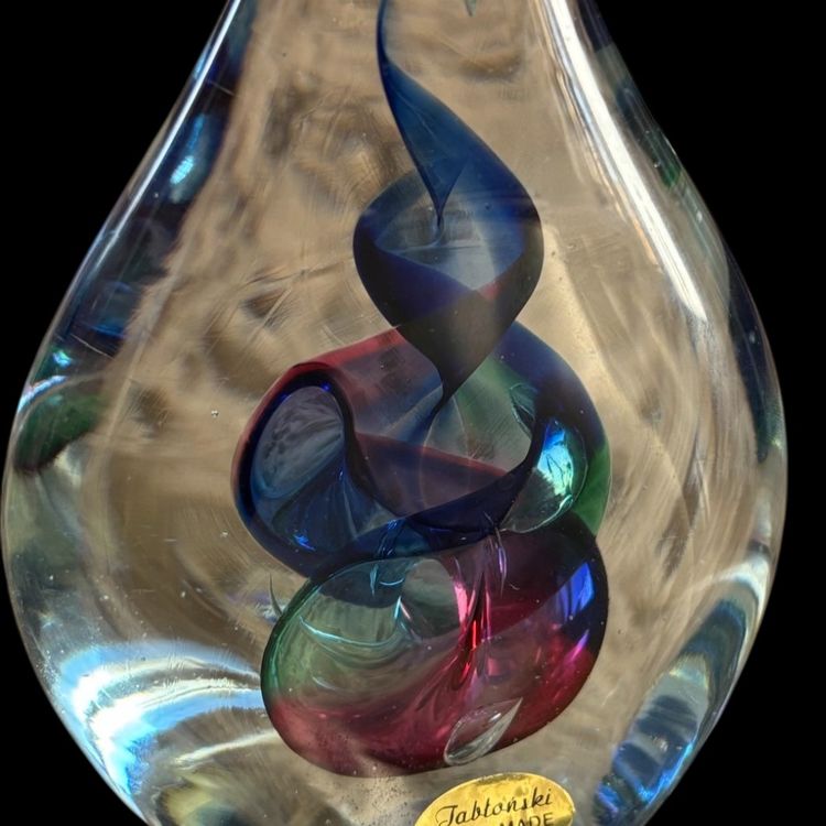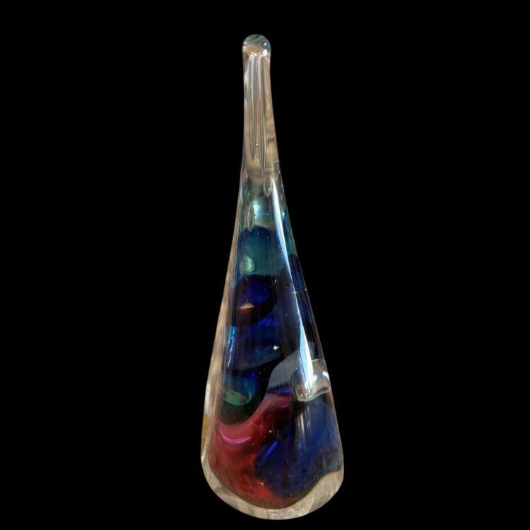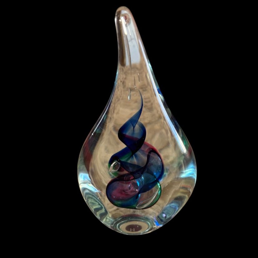 Delightful teardrop with blue, green and pink swirl centre. Signed, original sticker. No chips or cracks, some bubbles from manufacturing. 2.5x1.75x5.75”