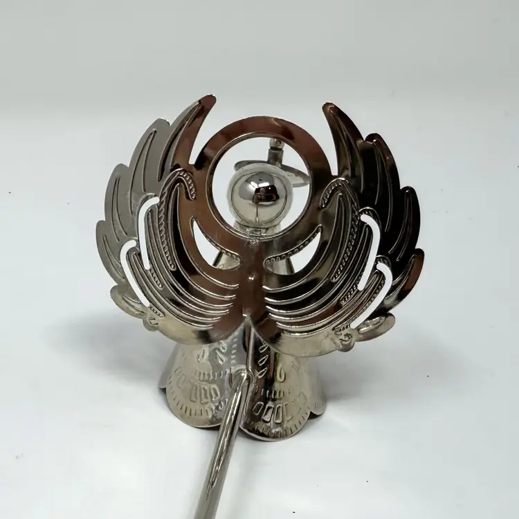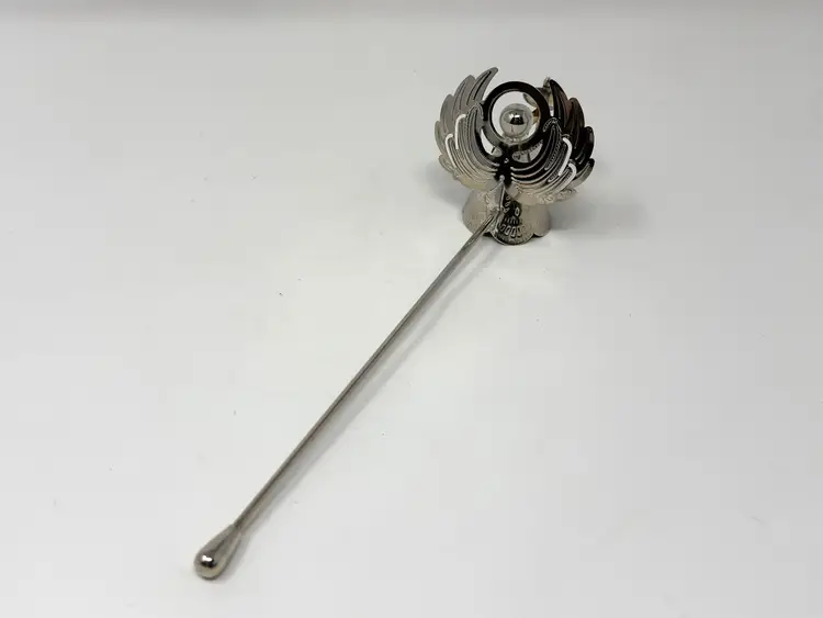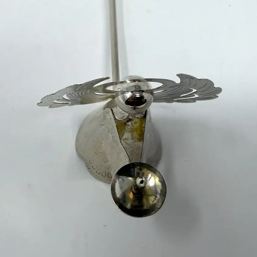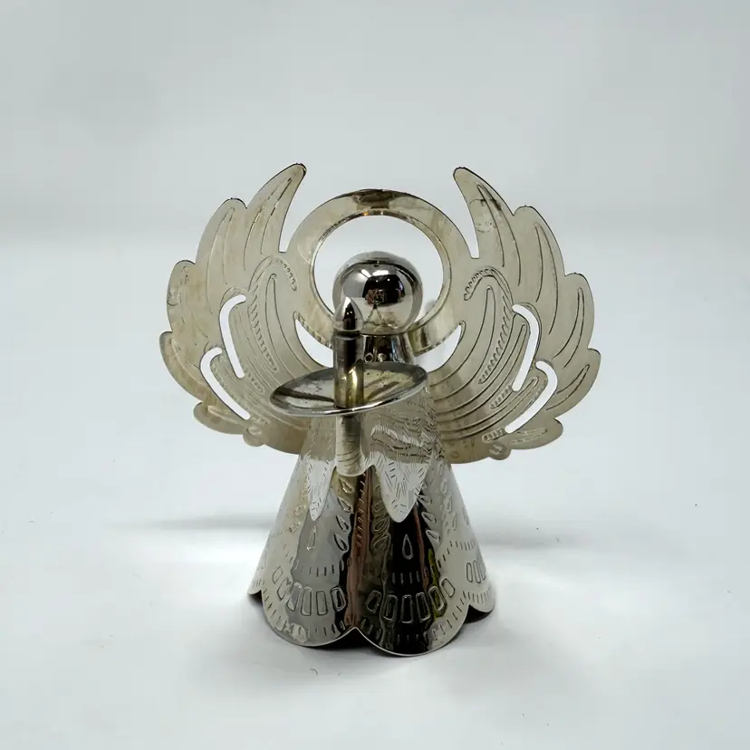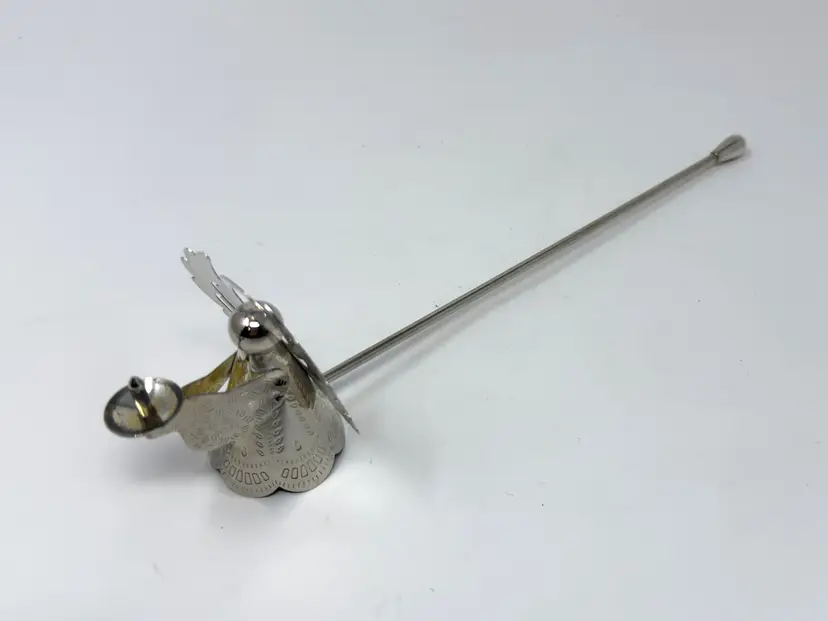 This silver metal angel candle snuffer blends function and beauty in a timeless design. Crafted from etched silver-tone alloy, it features sculpted wings, a circular halo, and a long handle for safe candle extinguishing.