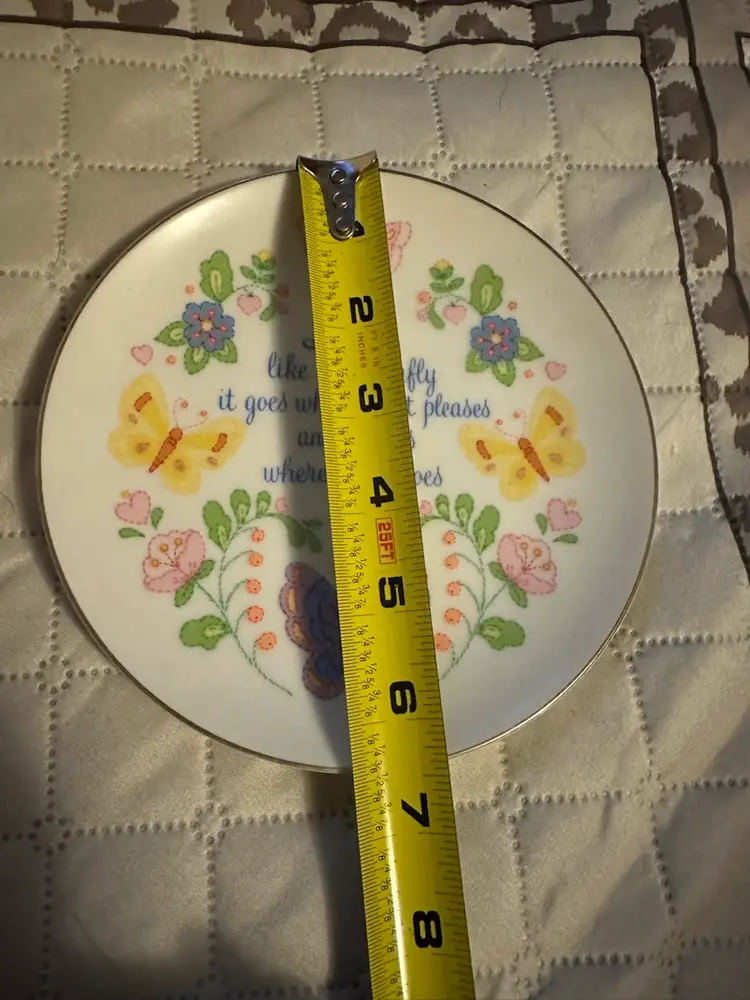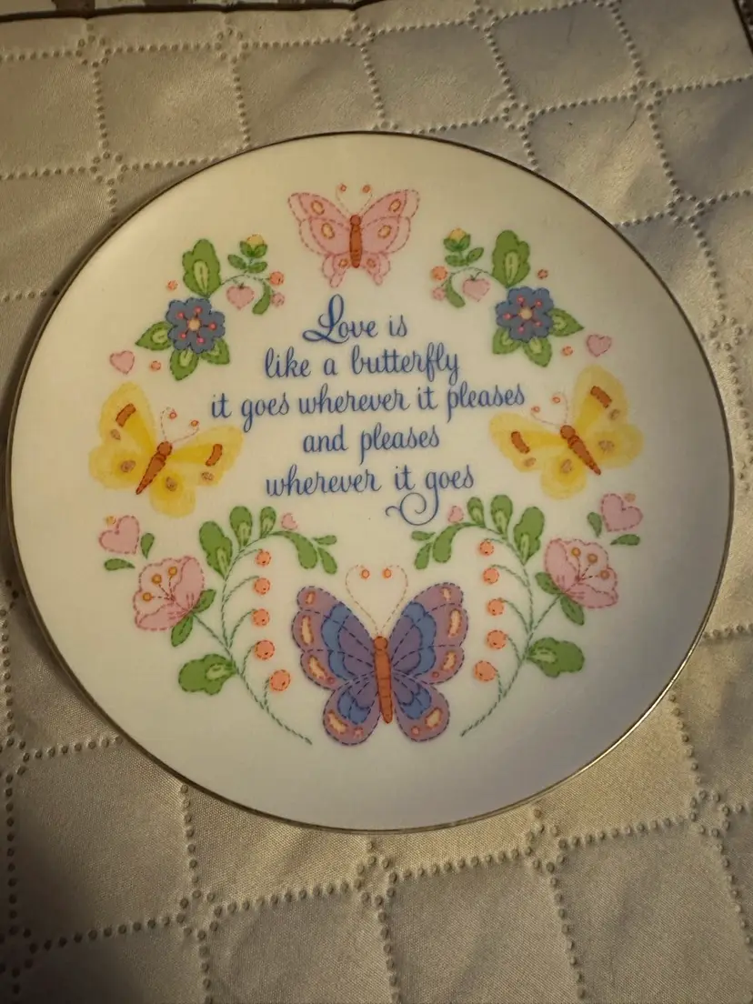 This decorative plate was produced in 1984 as part of the Heirloom Editions collection by Paula. It features a sentimental quote surrounded by colorful embroidery-style butterflies and floral motifs in a folk art style typical of the 1980s home decor aesthetic. No chips or cracks.