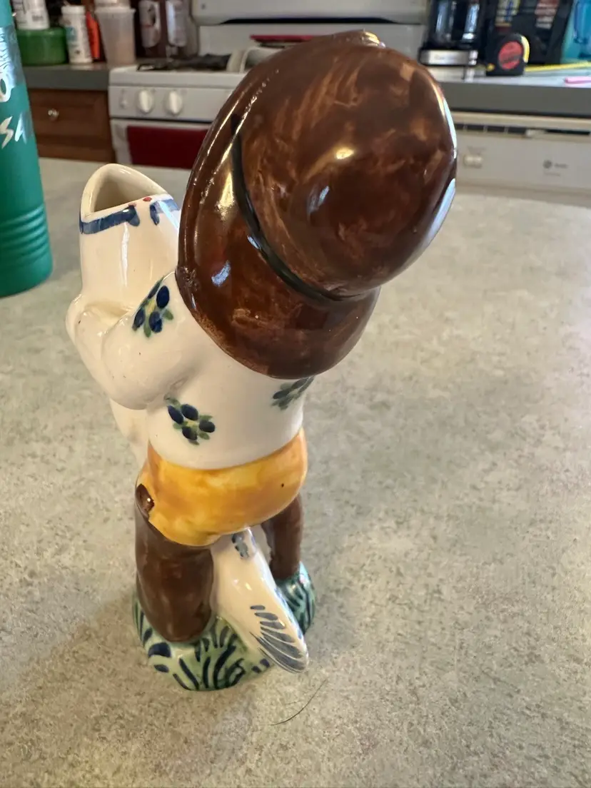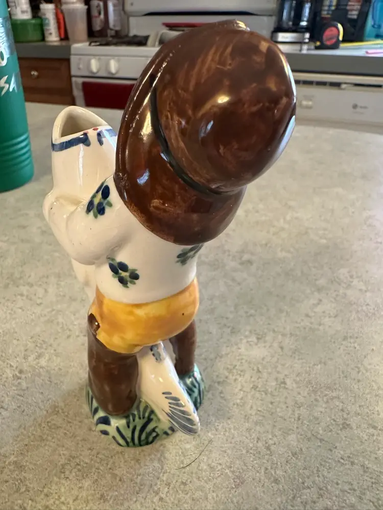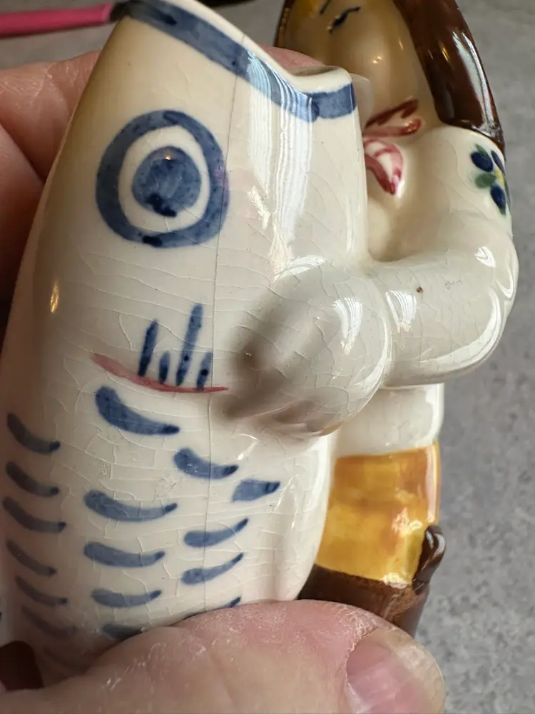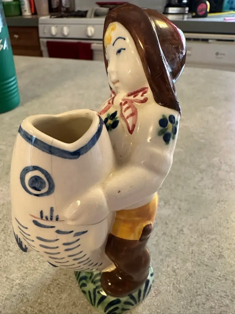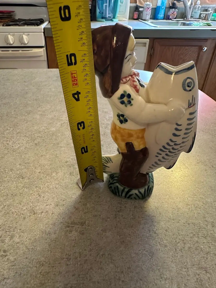 This figurine was created by Aluminia, a division of Royal Copenhagen, as part of their Children's Day series in 1946. The design depicts a boy from Skovshoved, a fishing village north of Copenhagen, holding a large fish, reflecting the Danish coastal culture and maritime heritage. One side of fish has a hairline crack. As Is condition. Barely see.